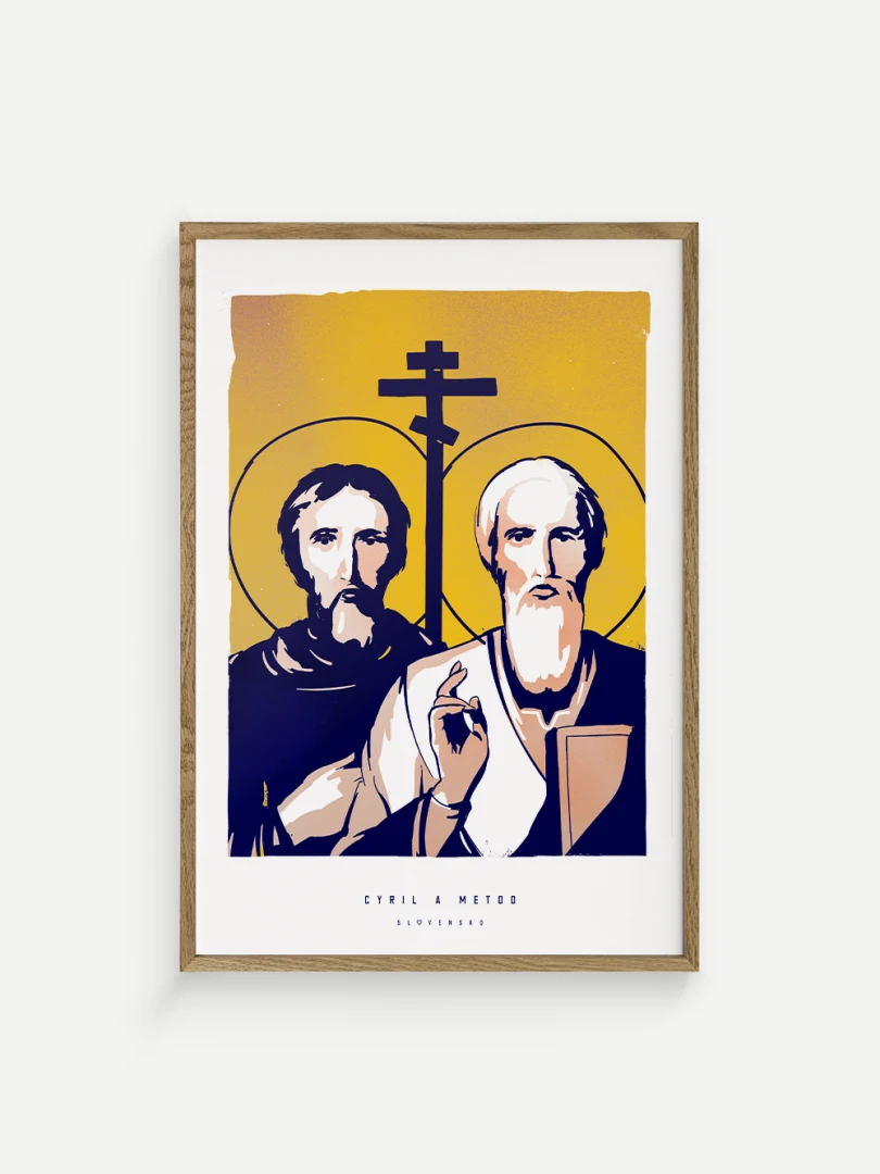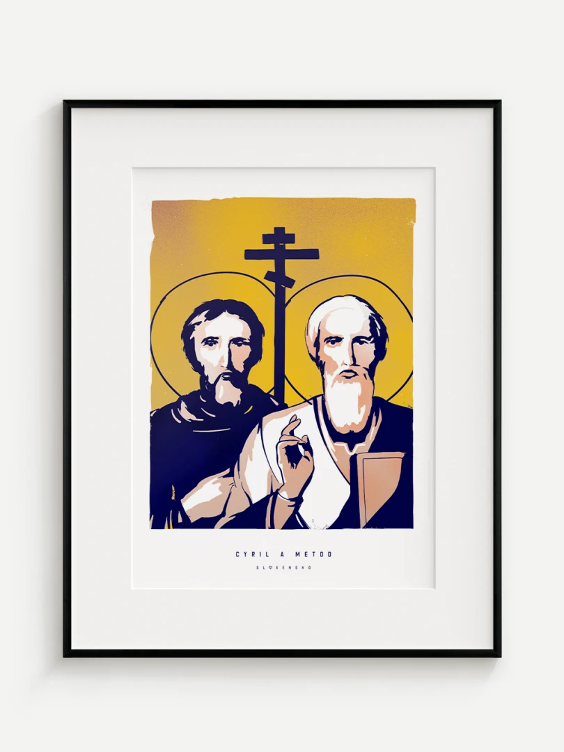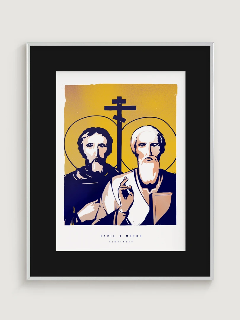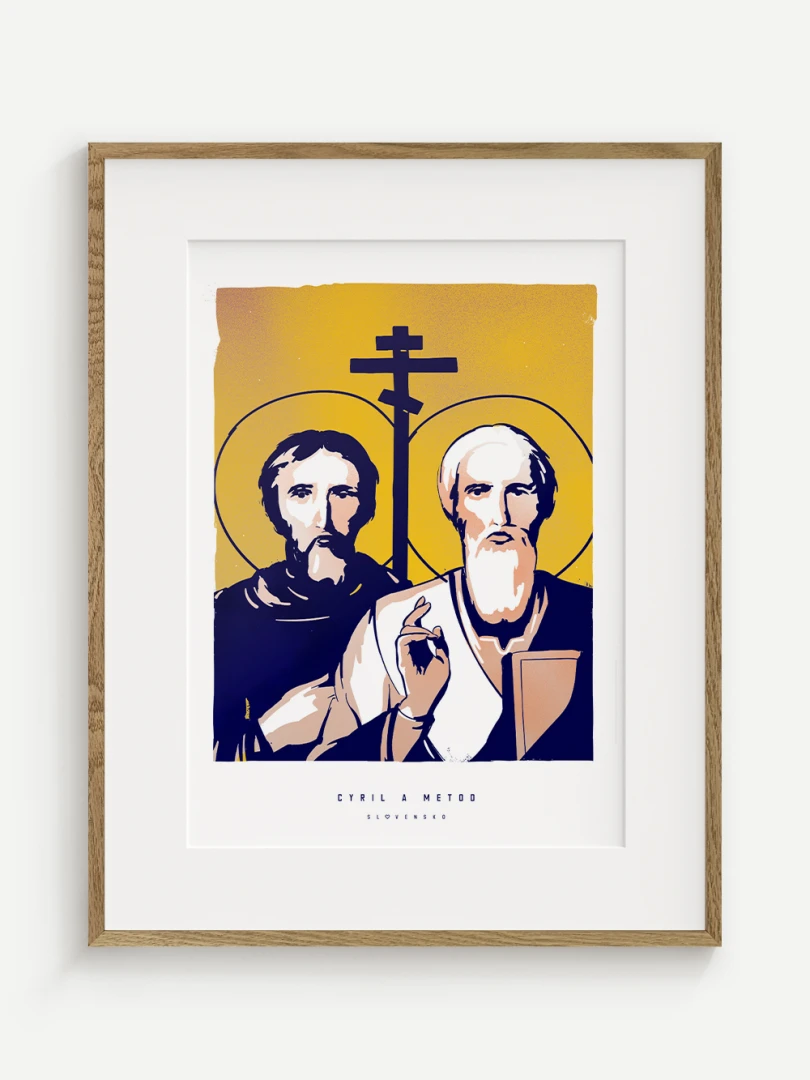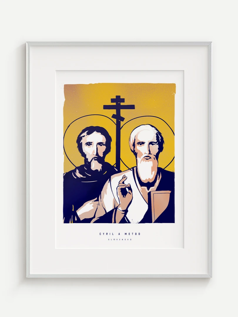 Dvojica bratov, ktorá ovplyvnila duchovný a kultúrny vývoj nášho územia, je zachytená aj na tomto pop-artovom printe – v modernom vizuálnom spracovaní, ktoré spája historický odkaz s aktuálnym výtvarným jazykom.