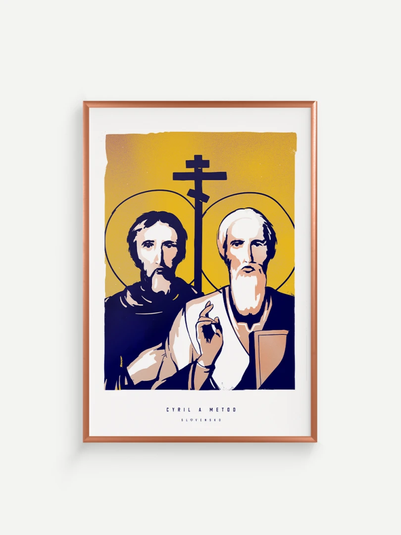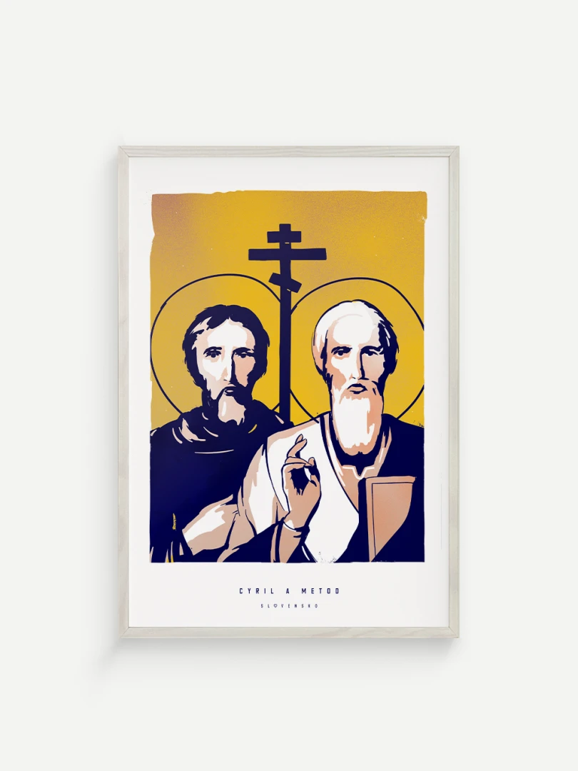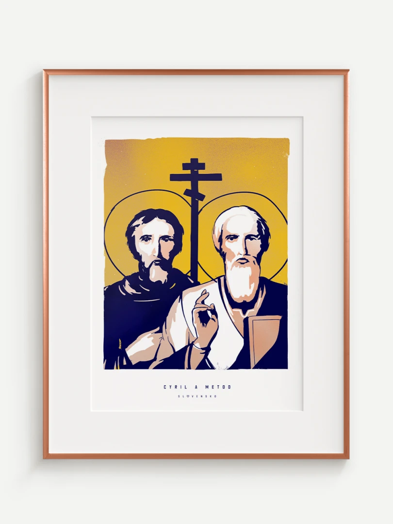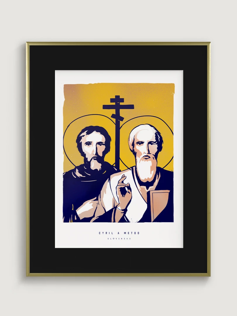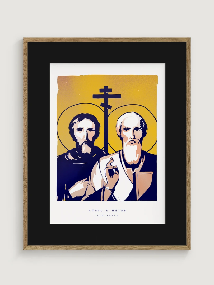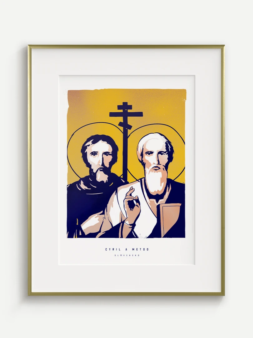 Dvojica bratov, ktorá ovplyvnila duchovný a kultúrny vývoj nášho územia, je zachytená aj na tomto pop-artovom printe – v modernom vizuálnom spracovaní, ktoré spája historický odkaz s aktuálnym výtvarným jazykom.