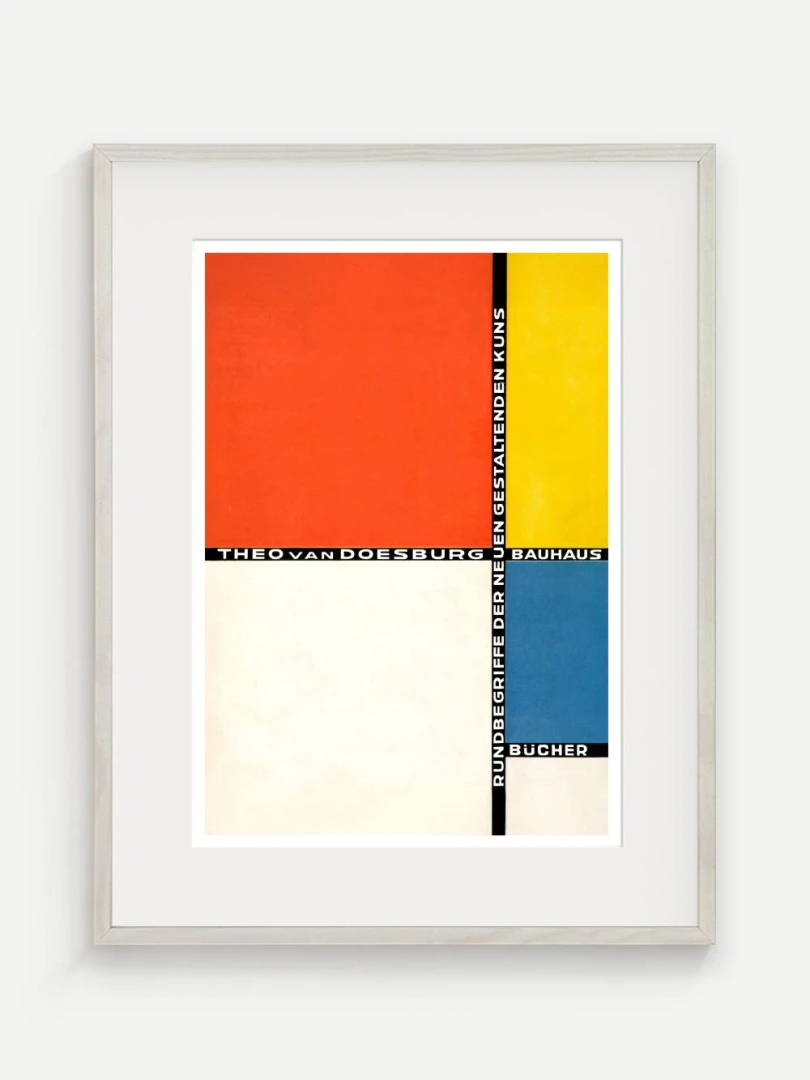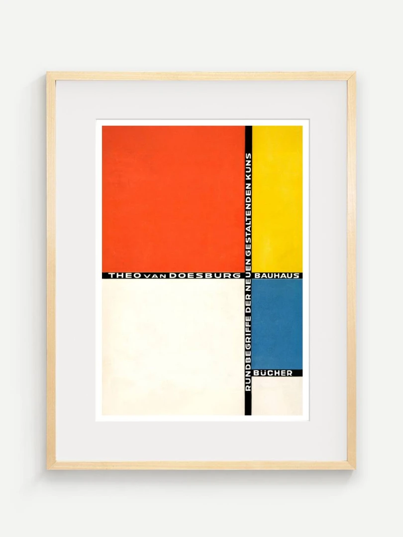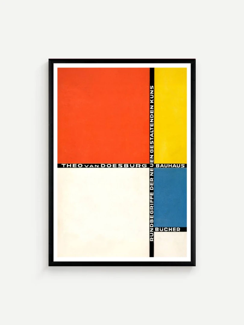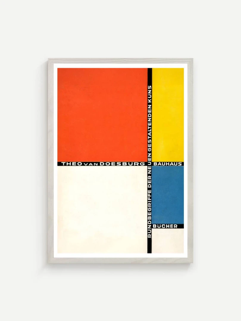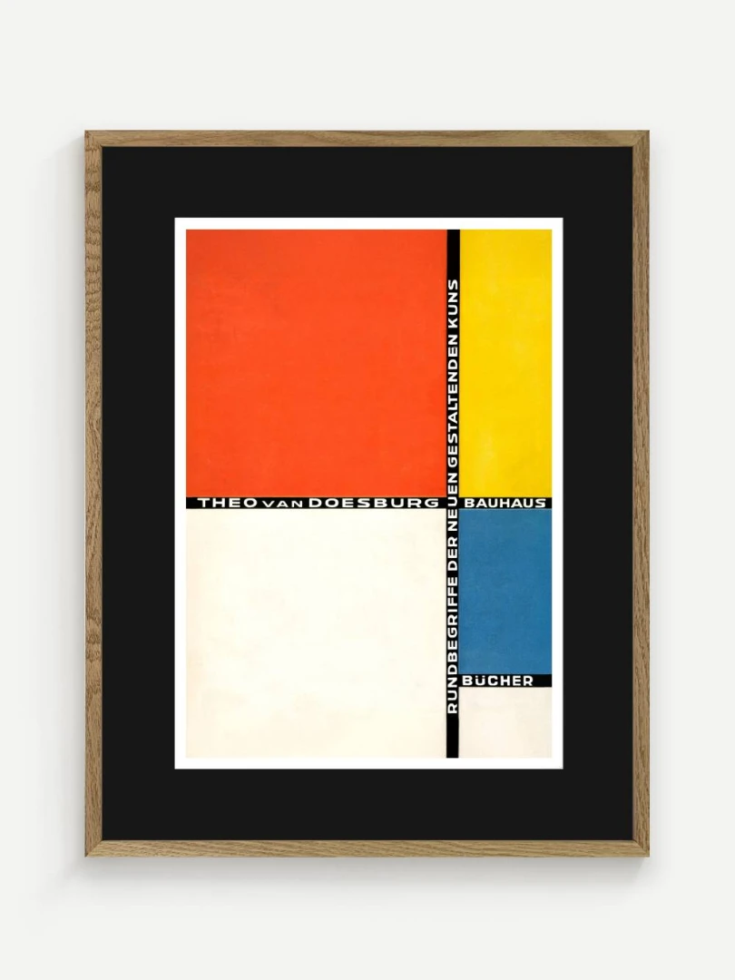 Tento print zachytáva prednú stranu Bauhaus Bücher No. 6, jednej z najznámejších publikácií tejto legendárnej série vydávanej v Nemecku v 20. rokoch 20. storočia. Kniha Základné princípy novej tvorivej tvorby (Grundbegriffe der neuen gestaltenden Kunst) je van Doesburgovým teoretickým východiskom k tomu, ako by mali umenie, architektúra a dizajn reagovať na moderný svet - cez jednoduchosť foriem, racionálnu konštrukciu a univerzálny jazyk geometrie. Ide o zásadné dielo pre smerovanie hnutia De Stijl a jeho presah do Bauhausu.