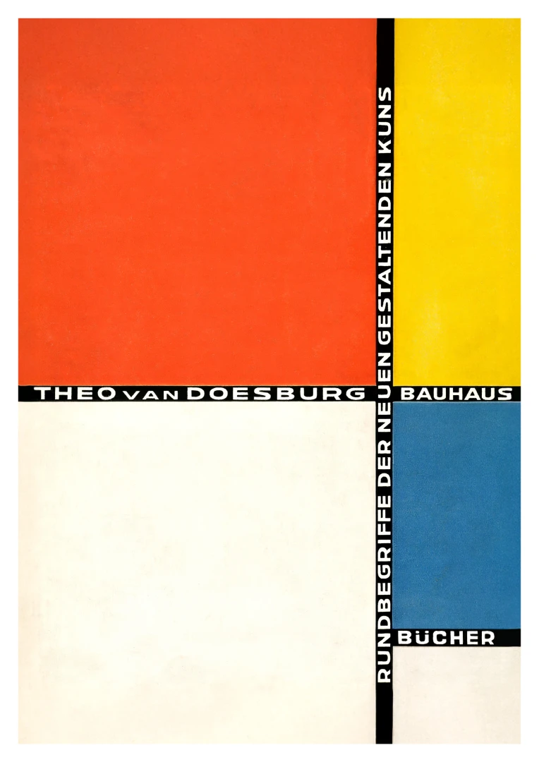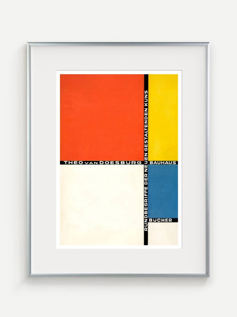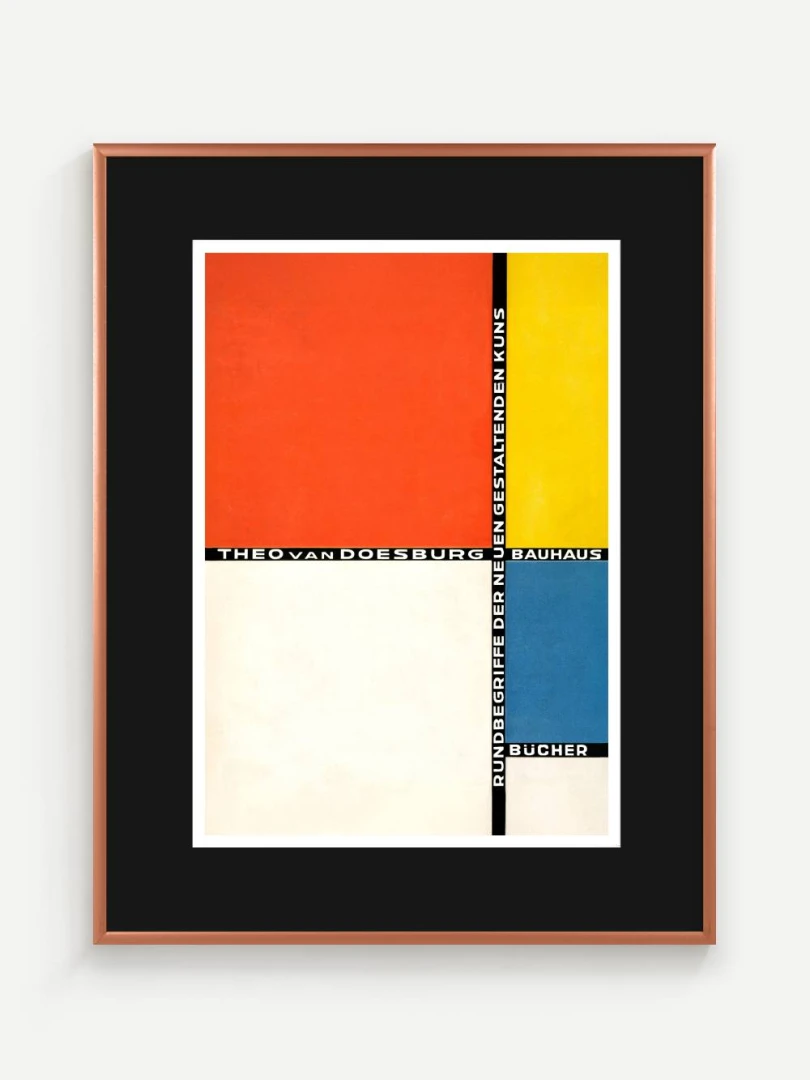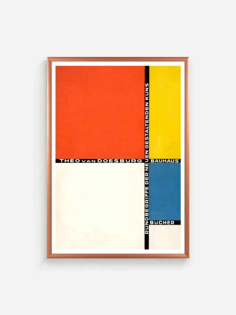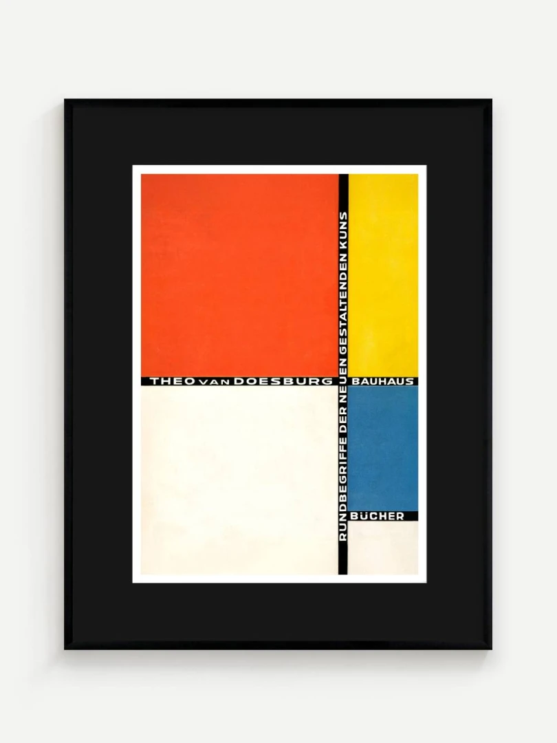 Tento print zachytáva prednú stranu Bauhaus Bücher No. 6, jednej z najznámejších publikácií tejto legendárnej série vydávanej v Nemecku v 20. rokoch 20. storočia. Kniha Základné princípy novej tvorivej tvorby (Grundbegriffe der neuen gestaltenden Kunst) je van Doesburgovým teoretickým východiskom k tomu, ako by mali umenie, architektúra a dizajn reagovať na moderný svet - cez jednoduchosť foriem, racionálnu konštrukciu a univerzálny jazyk geometrie. Ide o zásadné dielo pre smerovanie hnutia De Stijl a jeho presah do Bauhausu.