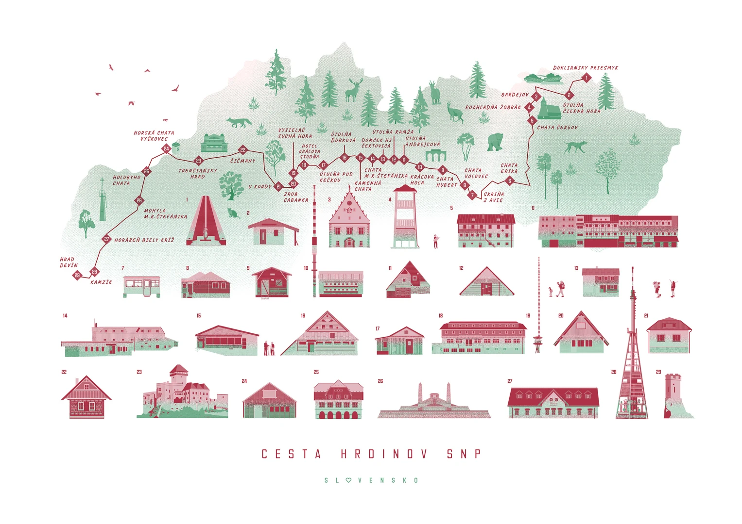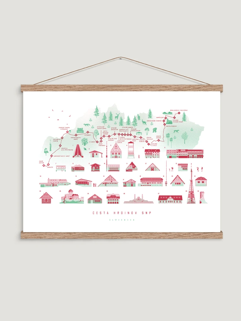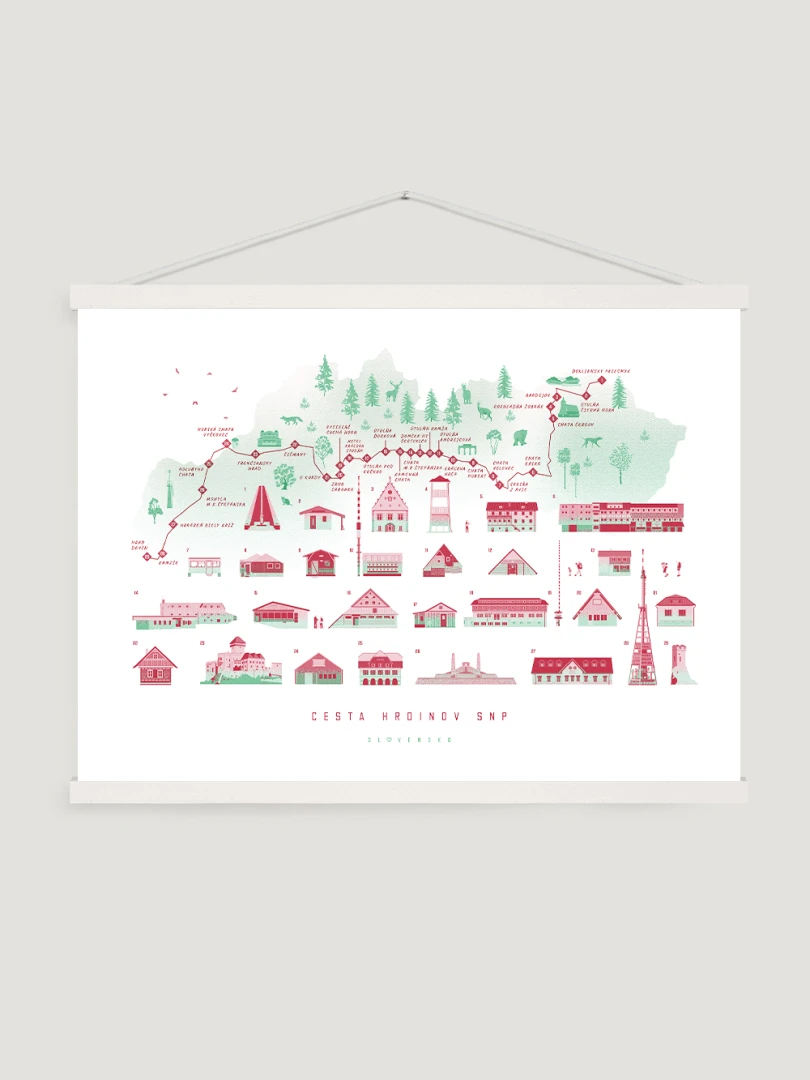 Tento print zachytáva charakteristickú líniu ikonickej trasy Cesty SNP, zdôraznenú čistým dizajnom a výraznou farebnosťou. Či už pre váš domov, kanceláriu alebo ako darček, tento print prináša kúsok histórie a odvahy Slovenska do akéhokoľvek priestoru jedinečným spôsobom.