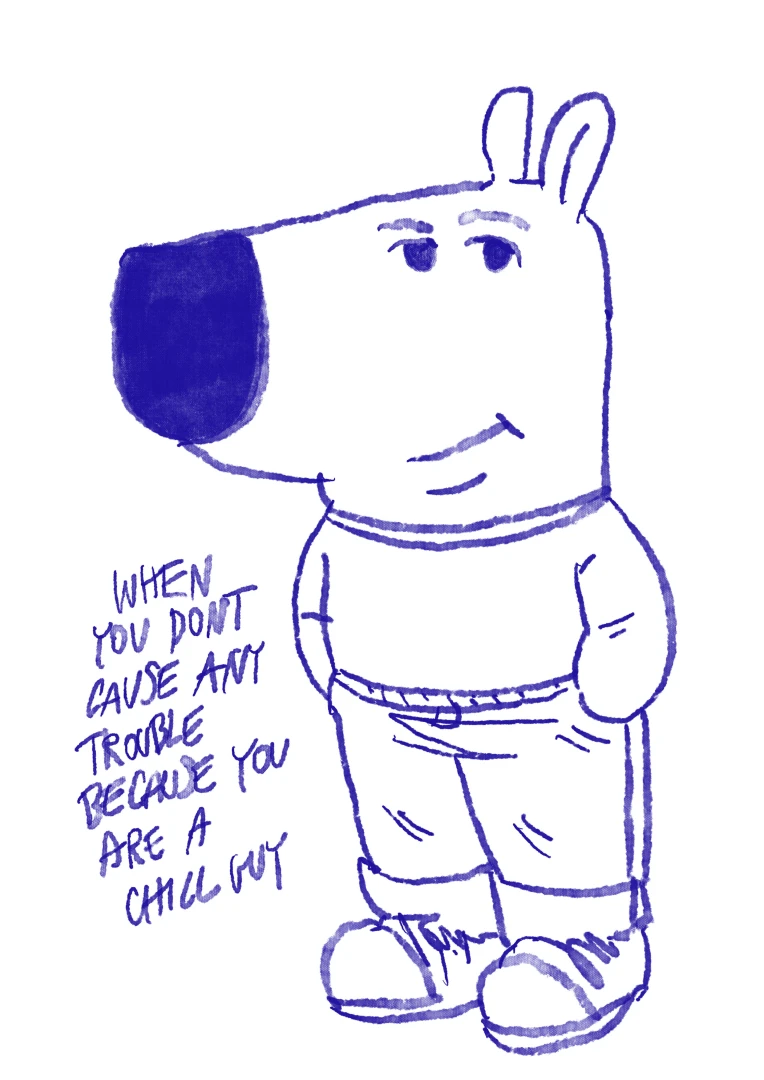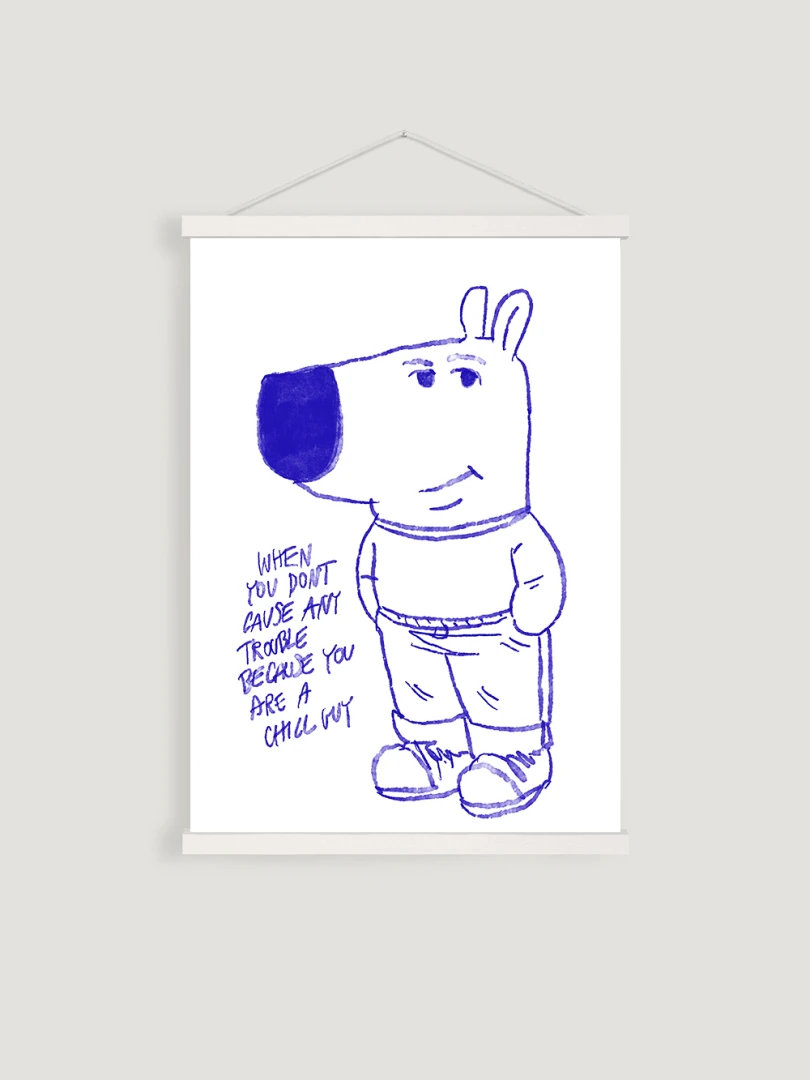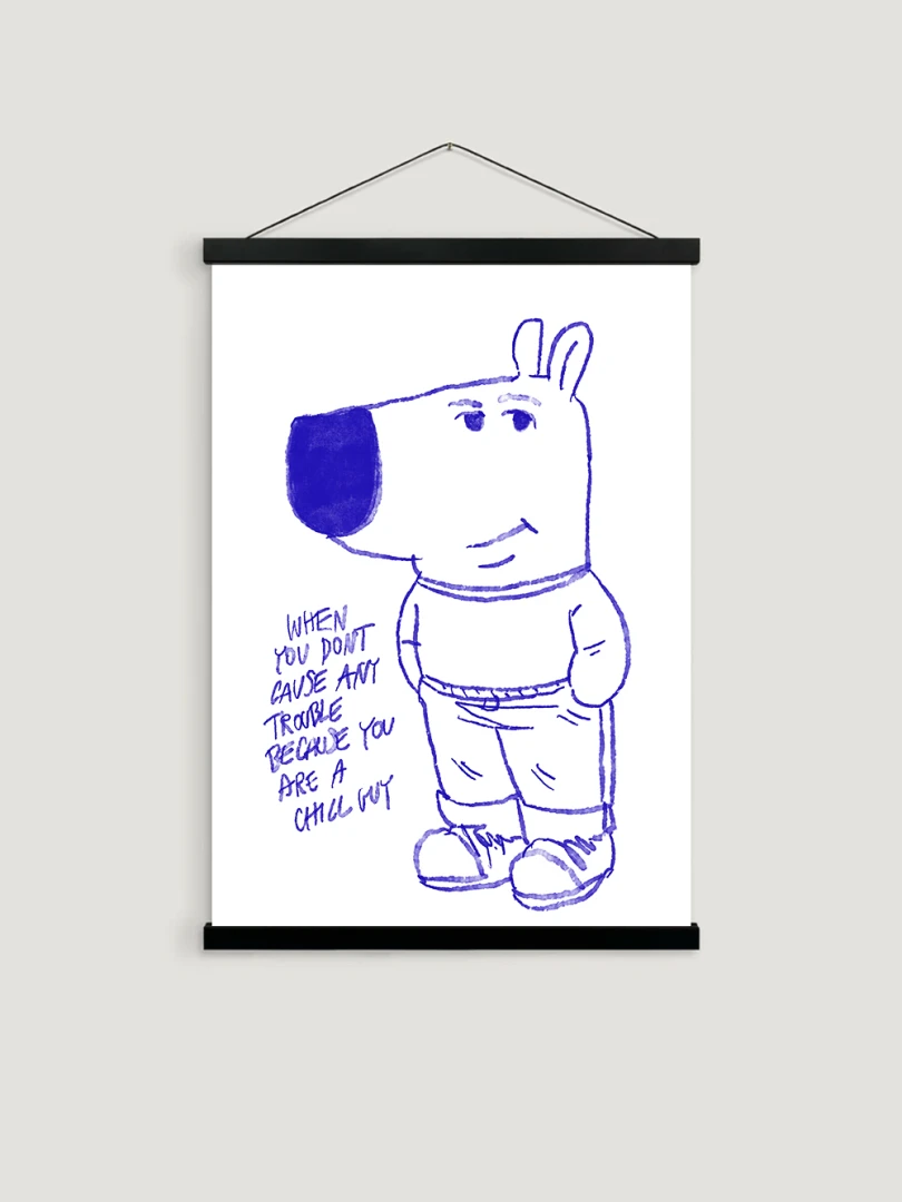 Keď nič neriešiš, nevyvolávaš problémy a si jednoducho chill guy – tento print dokonale vystihuje túto energiu. Hravá modrá ilustrácia pohodového psíka v ležérnom outfite v kombinácii s odľahčeným ručne písaným textom vytvára vtipný a uvoľnený vizuál, ktorý sa hodí do každého priestoru s nadhľadom.