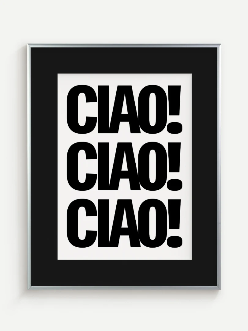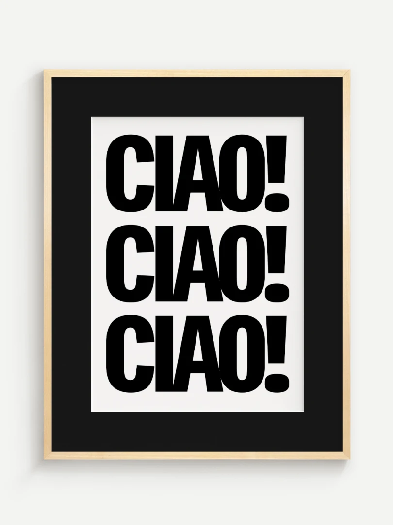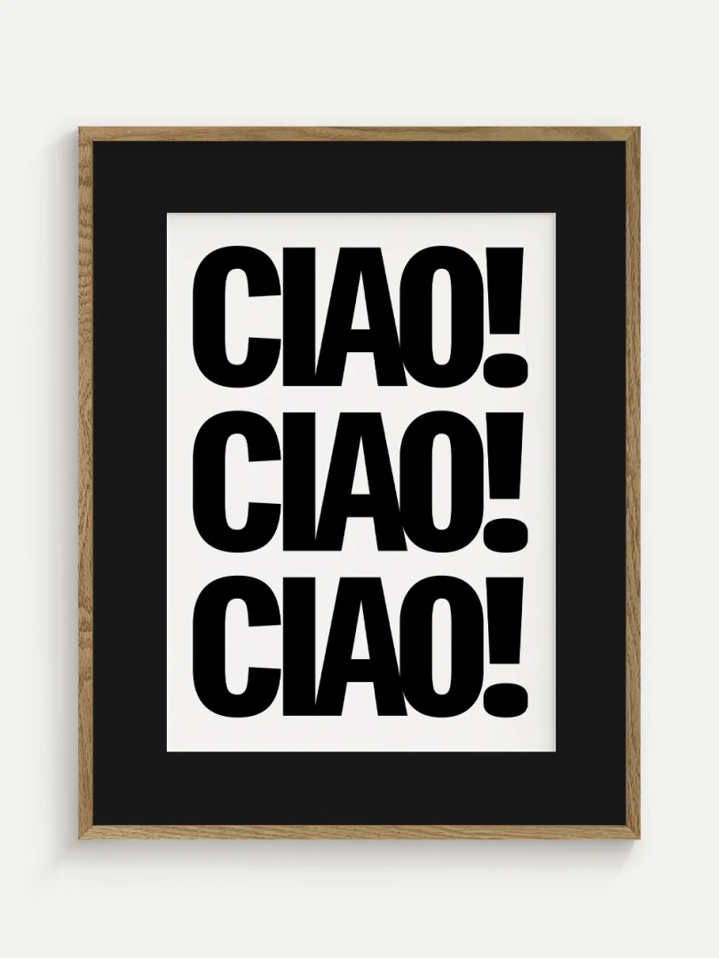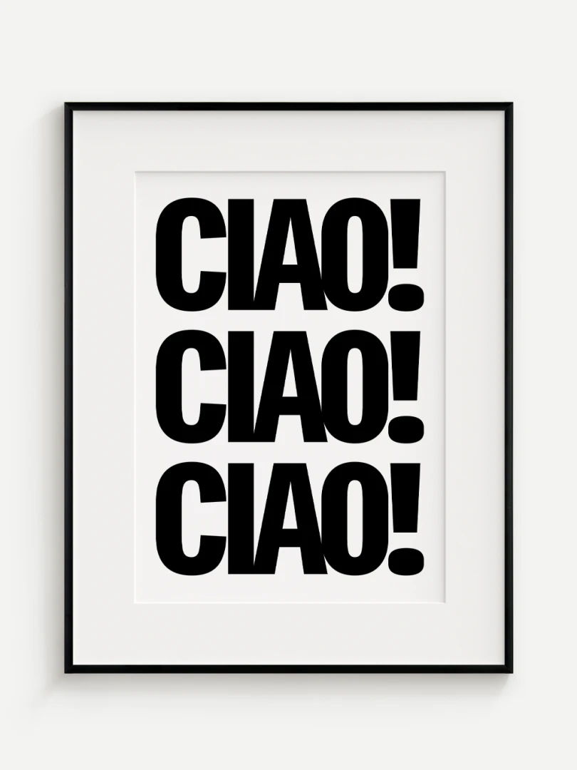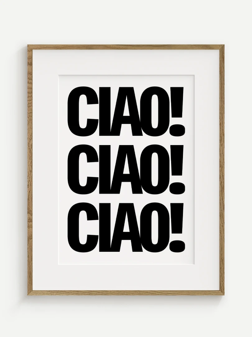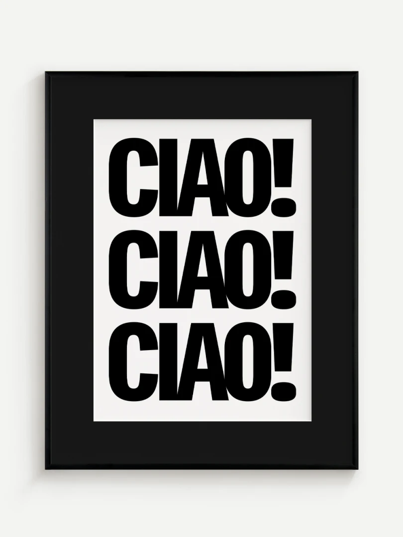 Tento umelecký print prináša do vášho priestoru energiu a taliansky šarm v podobe ikonického pozdravu CIAO! opakovaného v odvážnej, minimalistickej typografii. Silný čierno-biely kontrast a výrazné písmo robia z tohto printu štýlový a hravý doplnok, ktorý upúta pozornosť na prvý pohľad.