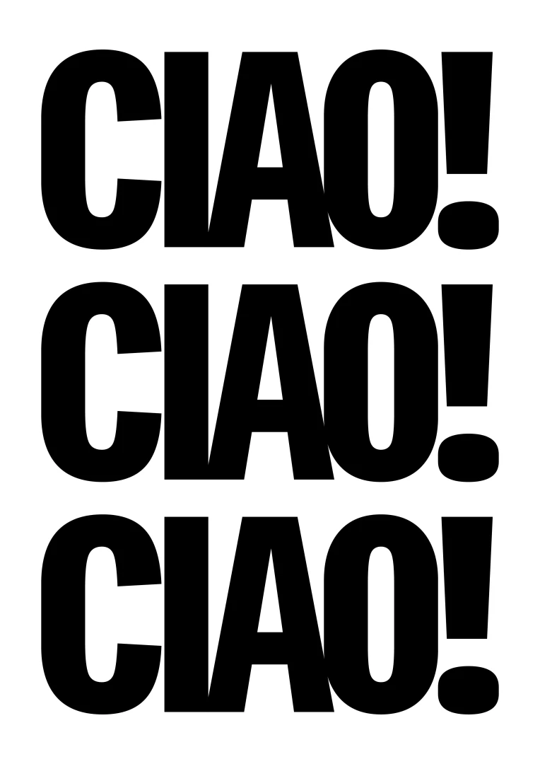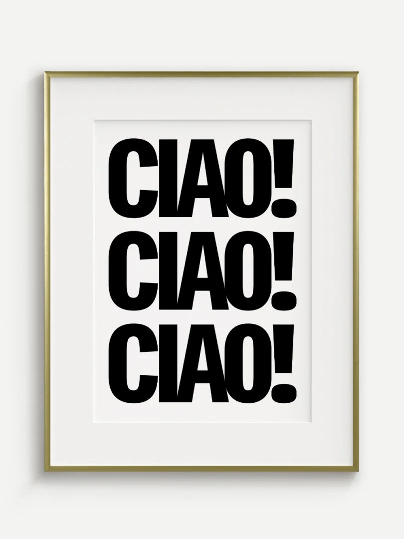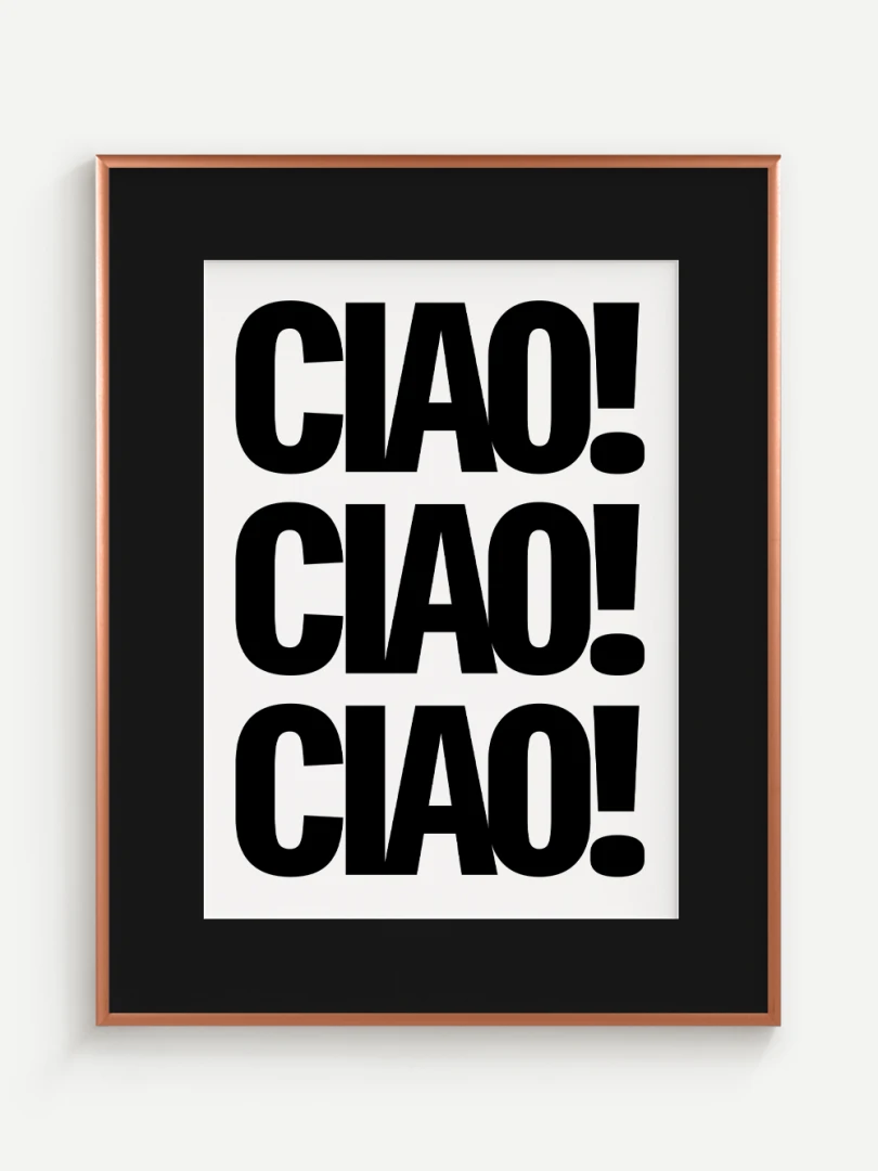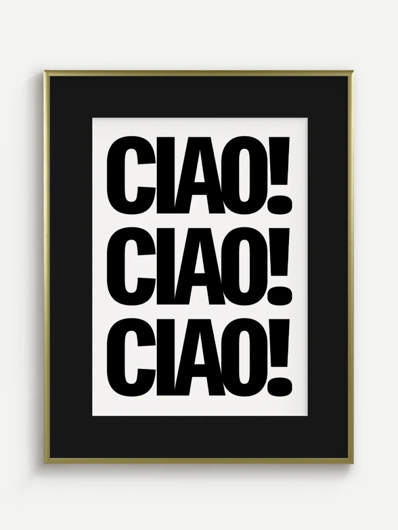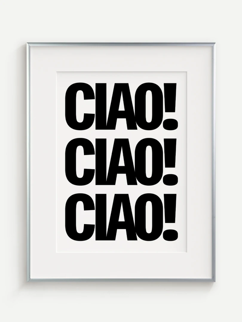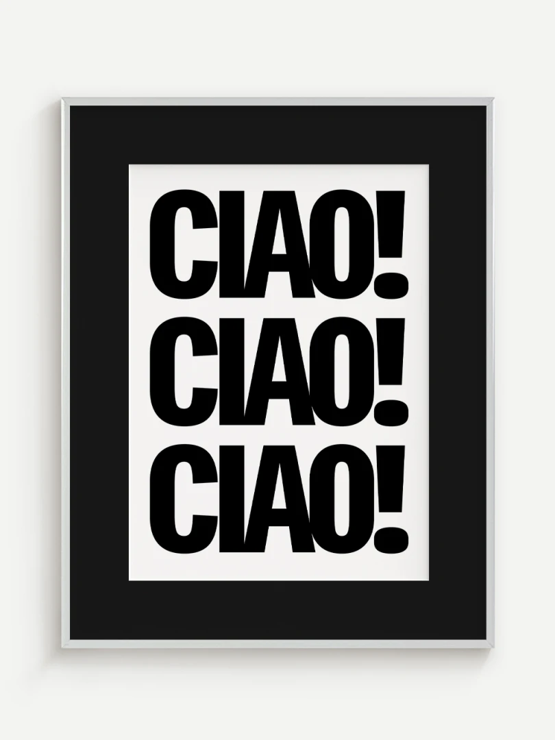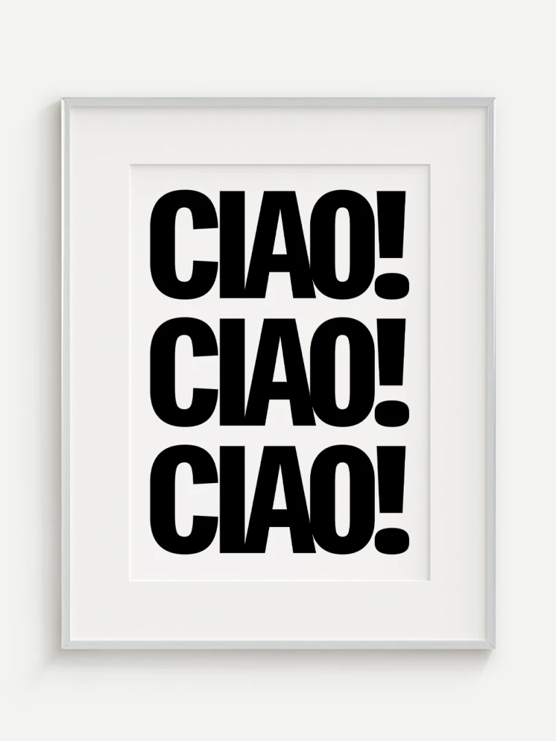 Tento umelecký print prináša do vášho priestoru energiu a taliansky šarm v podobe ikonického pozdravu CIAO! opakovaného v odvážnej, minimalistickej typografii. Silný čierno-biely kontrast a výrazné písmo robia z tohto printu štýlový a hravý doplnok, ktorý upúta pozornosť na prvý pohľad.