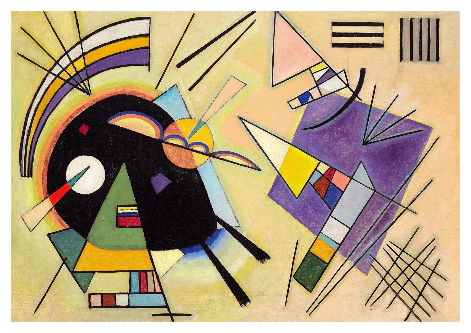 V tomto období sa Kandinsky sústredil na geometrickú abstrakciu, pričom využíval kruhy, trojuholníky a línie na vyjadrenie duchovných a hudobných konceptov. Obraz Čierna a fialová je príkladom jeho snahy o vytvorenie vizuálnej harmónie prostredníctvom presne definovaných tvarov a farebných kontrastov.
