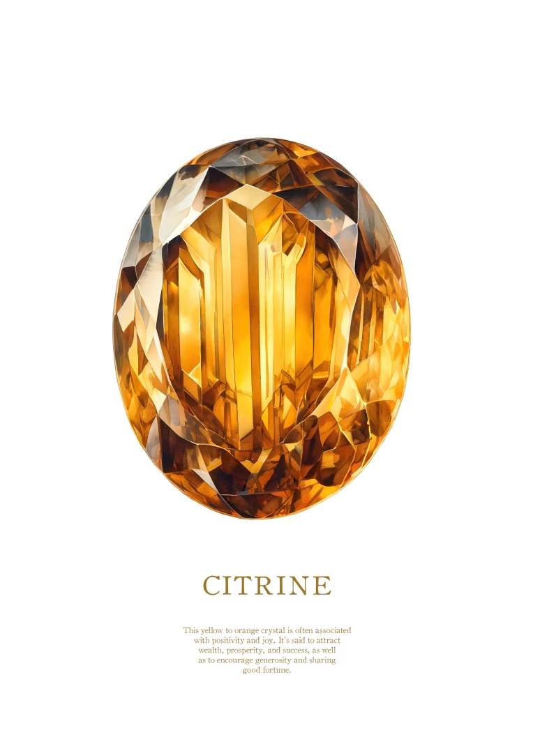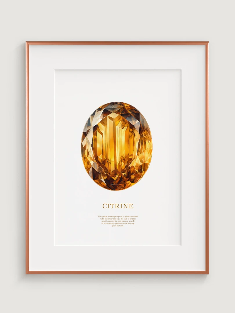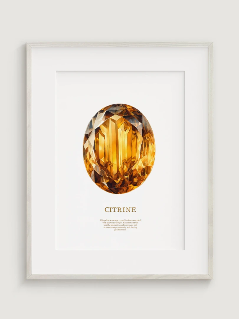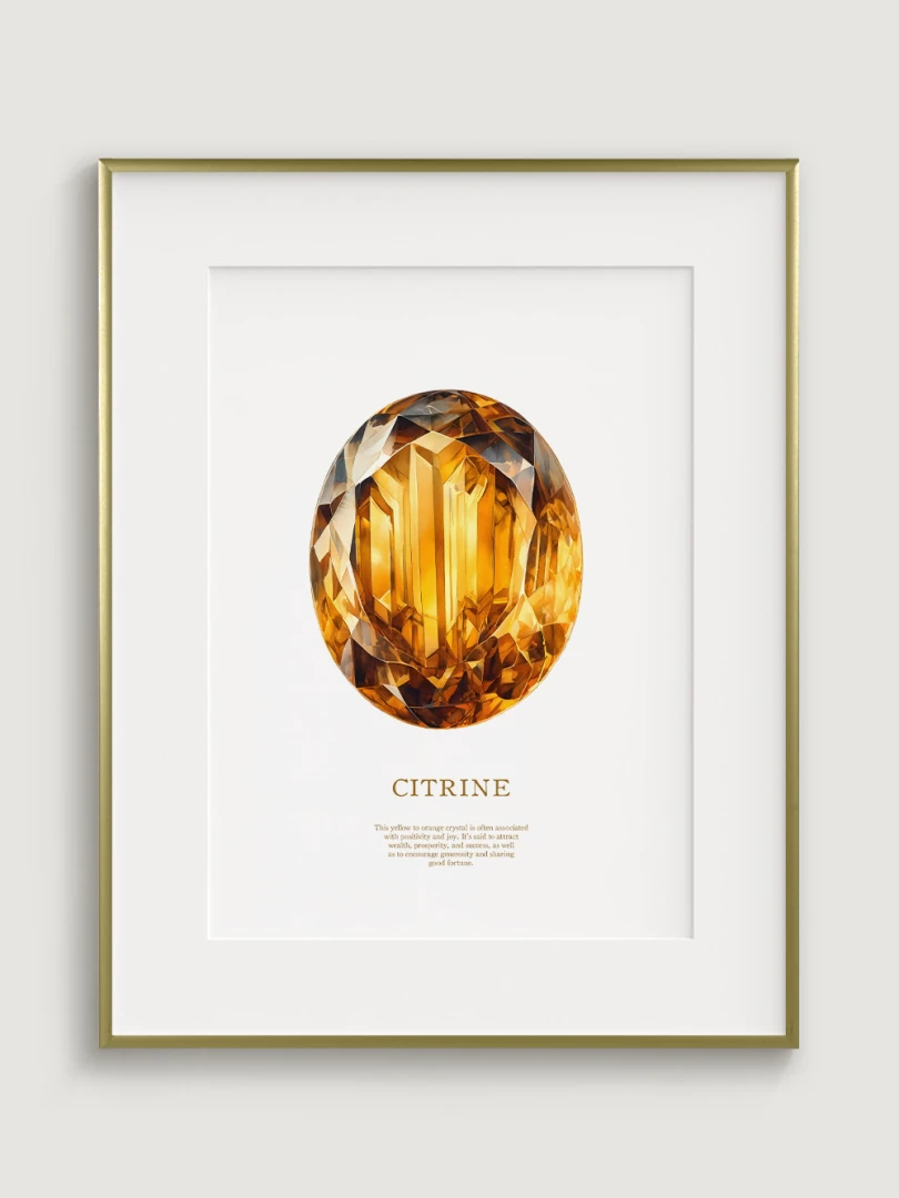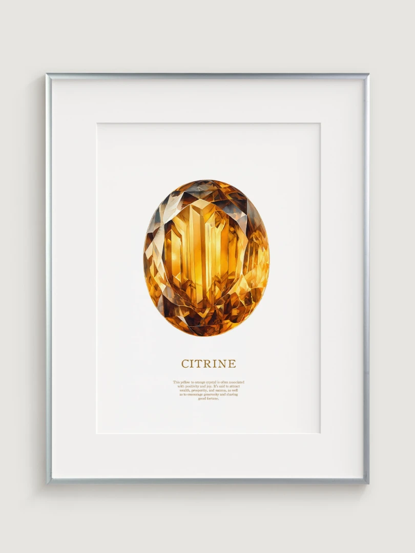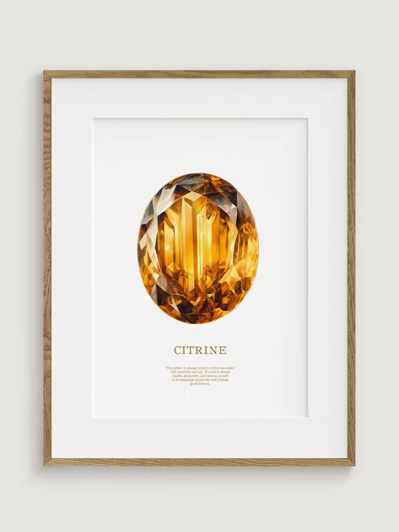 Tento print zachytáva živé žlté až oranžové odtiene citrínu, drahokamu oslavovaného za jeho pozitívne a radosť prinášajúce vlastnosti. Citrín je známy tým, že priťahuje bohatstvo, prosperitu a úspech, a tiež sa verí, že podporuje štedrosť a zdieľanie dobrého šťastia.