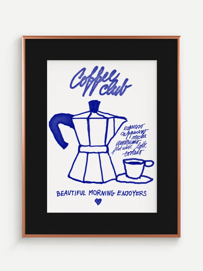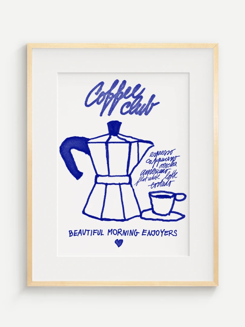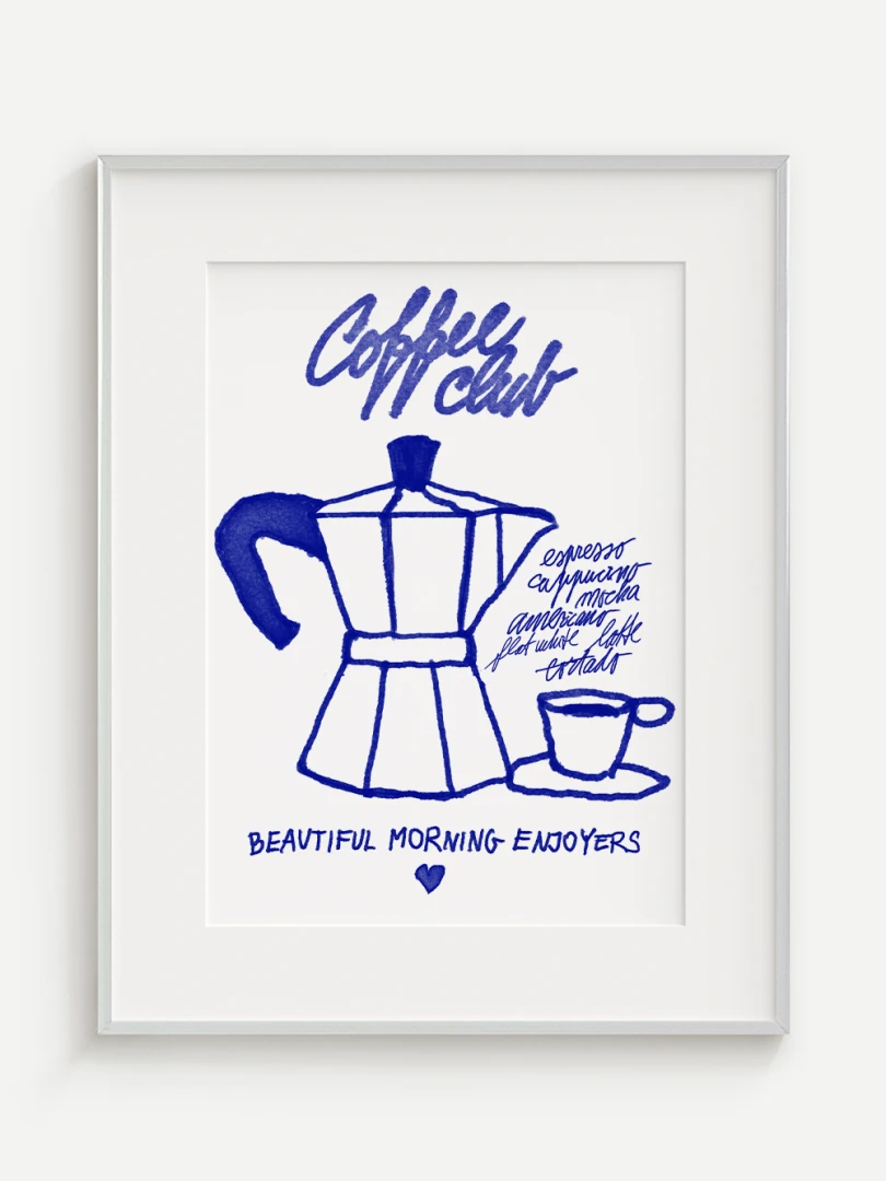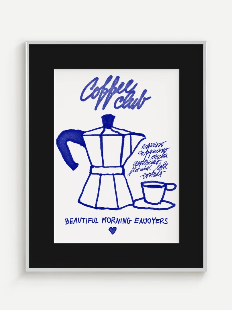 Tento umelecký print prináša atmosféru ranného kávového rituálu do vášho domova. Ilustrácia klasickej moka kanvice spolu s kávovou šálkou je vytvorená v hravom, ručne kreslenom štýle s výraznými modrými líniami. Dopĺňajú ju názvy obľúbených kávových nápojov a nápis "Coffee Club", ktorý evokuje komunitu milovníkov kávy a príjemné spoločné chvíle pri šálke espressa.