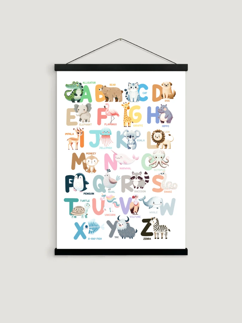 Každé písmeno je zastúpené čarovným zvieraťom, od aligátora po zebru, čo robí učenie zábavným a vizuálne príťažlivým. Tento farebný print je ideálny do detských izieb, herní alebo tried, prebudzuje zvedavosť.