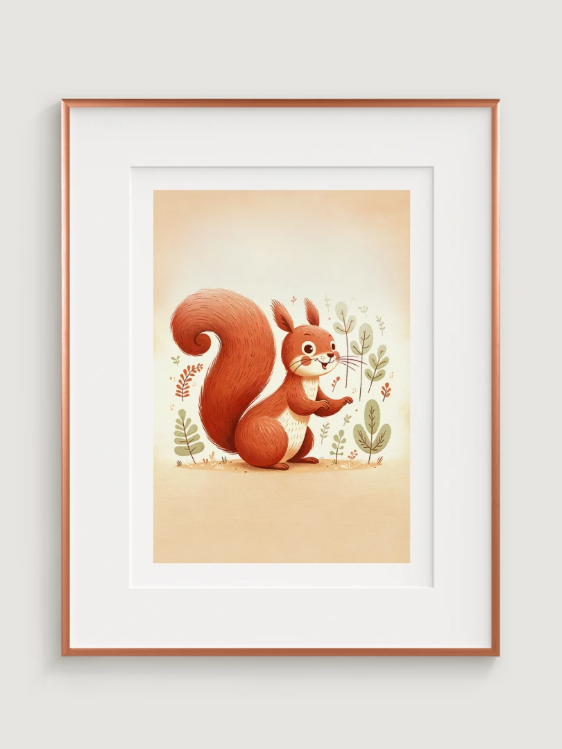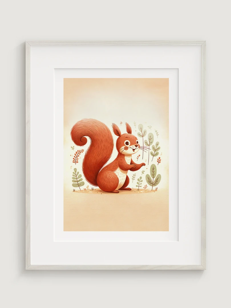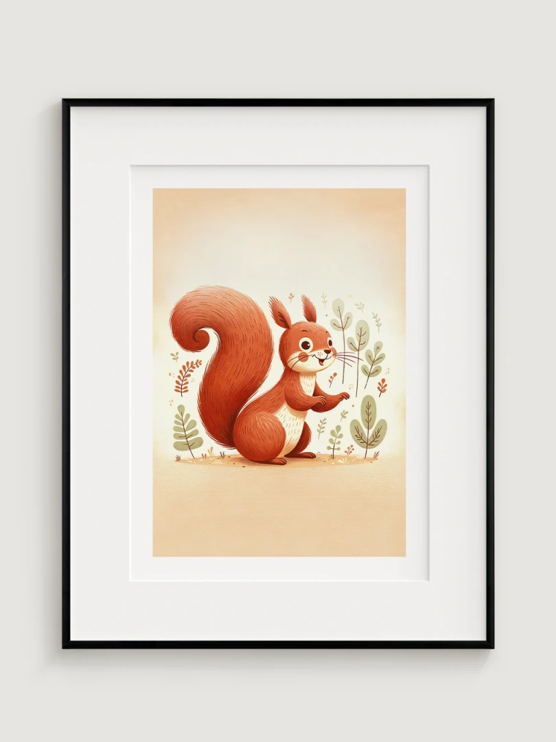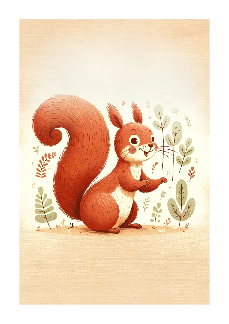 Jemné farby a mäkké, zaoblené tvary vytvárajú upokojujúcu a radostnú atmosféru, ktorá je perfektná pre každú miestnosť, ktorá potrebuje nádych hravosti. Výrazné oči a veselá postava veveričky dodávajú ilustrácii život, čo ju robí doplnkom do detských izieb.