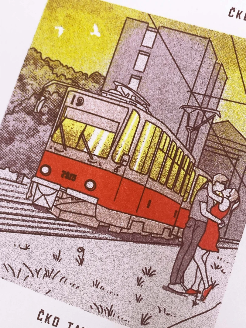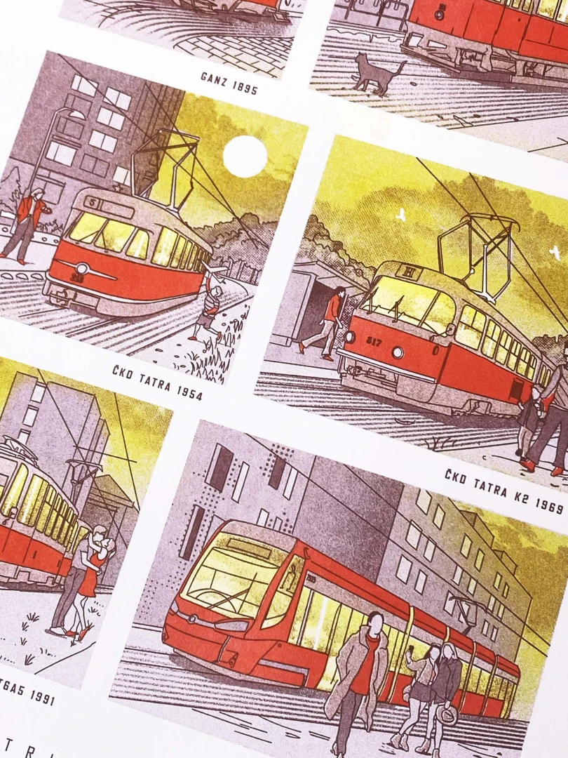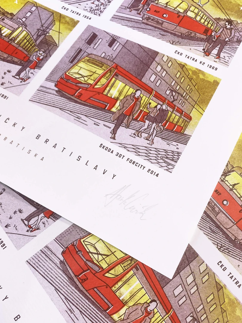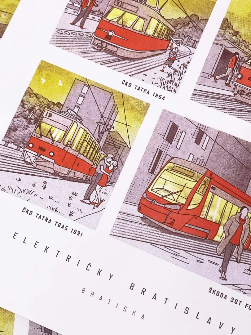 Začiatok bratislavskej mestskej hromadnej dopravy sa datuje do roku 1895, kedy začali v meste premávať prvé električky. Do štyroch rokov sieť električiek pokryla hlavné ťahy vtedajšieho Prešporku medzi centrom mesta a železničnými stanicami. Nepriaznivá hospodárska situácia po 1. svetovej vojne takmer spôsobila zrušenie bratislavských električiek, ale vďaka veľkej modernizácii po roku 1925 sa ich podarilo zachrániť. Výstavba nových tratí postupovala veľmi pomaly a do roku 1957 sa trate predĺžili len do Karlovej Vsi, na Vajnorskú ulicu a na krátku dobu aj do Petržalky. Do roku 1974 boli pôvodné dvojnápravové električky nahradené štvornápravovými električkami ČKD-Tatra T2 a T3 a kĺbovými električkami K2 československej výroby. S výstavbou sídlisk sa električky do roku 1989 stali nosným dopravným systémom v Rači, Ružinove, Karlovej Vsi, Dúbravke a na Zlatých pieskoch. Nákupom nízkopodlažných veľkokapacitných električiek, modernizáciou a výstavbou nových tratí po roku 2014 sa električková doprava v Bratislave stáva moderným dopravným prostriedkom na úrovni 21. storočia. — Autor textu: Matej Kavacký — Autor printu: Marek Ciesarík — Formát printu: A3 — Náklad: limitovaný počet 200ks (Dotlače nebudeme robiť.) — Vytlačené risografom na papier Munken Pure Rough 170g — Maximálne 2ks na 1 objednávku.