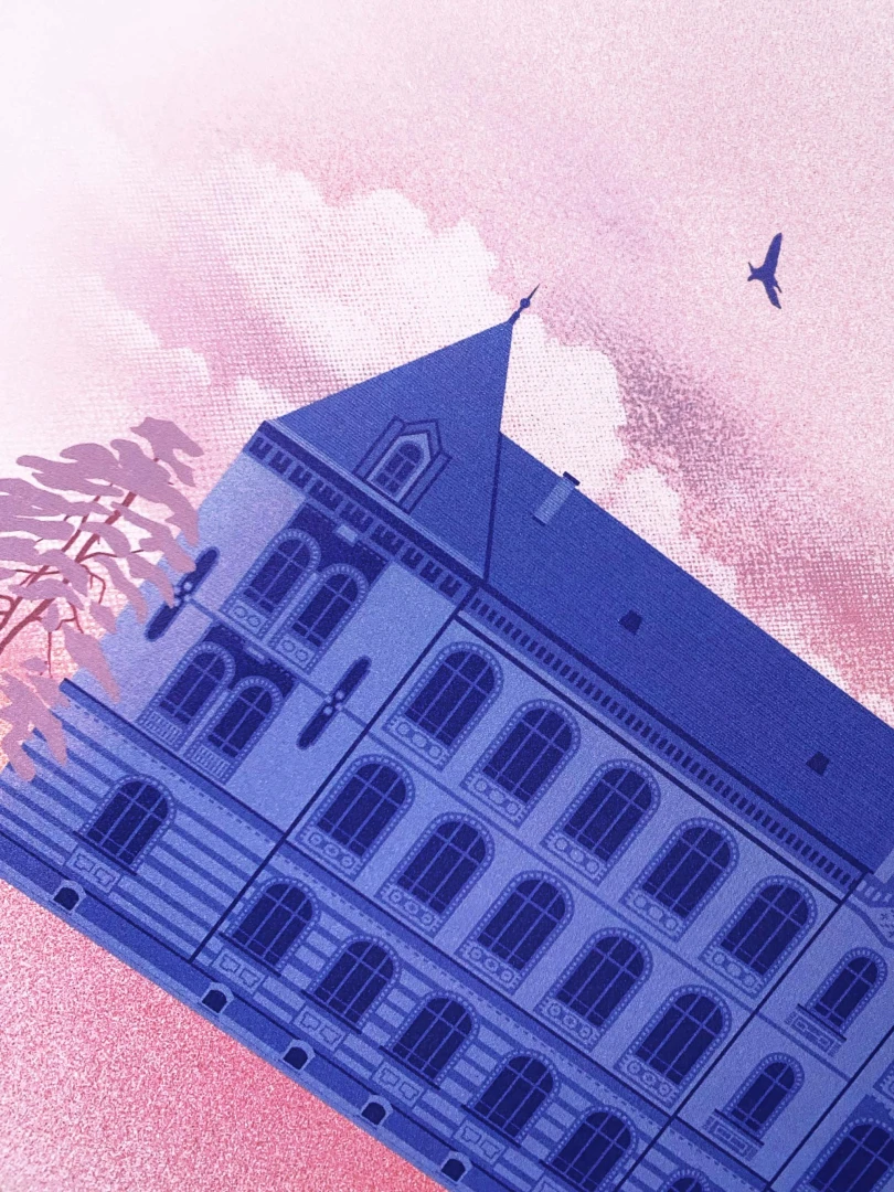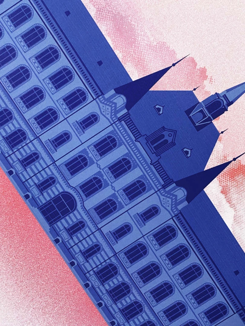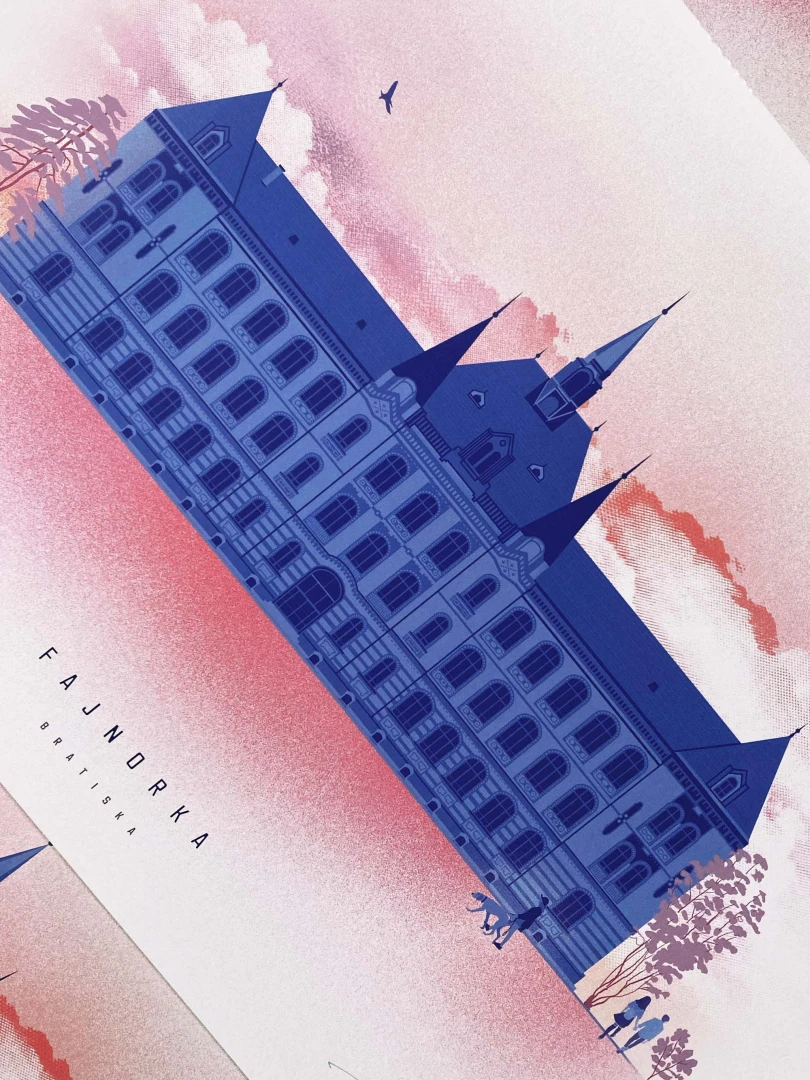 Krásne nábrežné pohľady sa návštevníkom Bratislavy otvárajú pri plavbe po Dunaji. Jedna významná stavba strieda druhú. Jednou z najvýraznejších je budova Strednej priemyselnej školy strojníckej na Fajnorovom nábreží, ktorej neprehliadnuteľná tehlová fasáda upúta už z diaľky. Stavbu projektoval budapeštiansky architekt Gyula Kolbenheyer a v čase svojho vzniku - v roku 1904 - niesla názov Odborná škola Kovorobná. Zaujímavosťou je, že škola stojí na mieste dnes už zasypaného ramena Dunaja. — Autor textu: Štefan Cipár — Autor printu: Pavol Bartoš — Grafická spolupráca: Jozef Mnich — Formát printu: A3 — Náklad: limitovaný počet 100ks (Dotlače nebudeme robiť.) — Vytlačené na papier 300g Pergraphica High White Smooth. — Maximálne 2ks na 1 objednávku.
