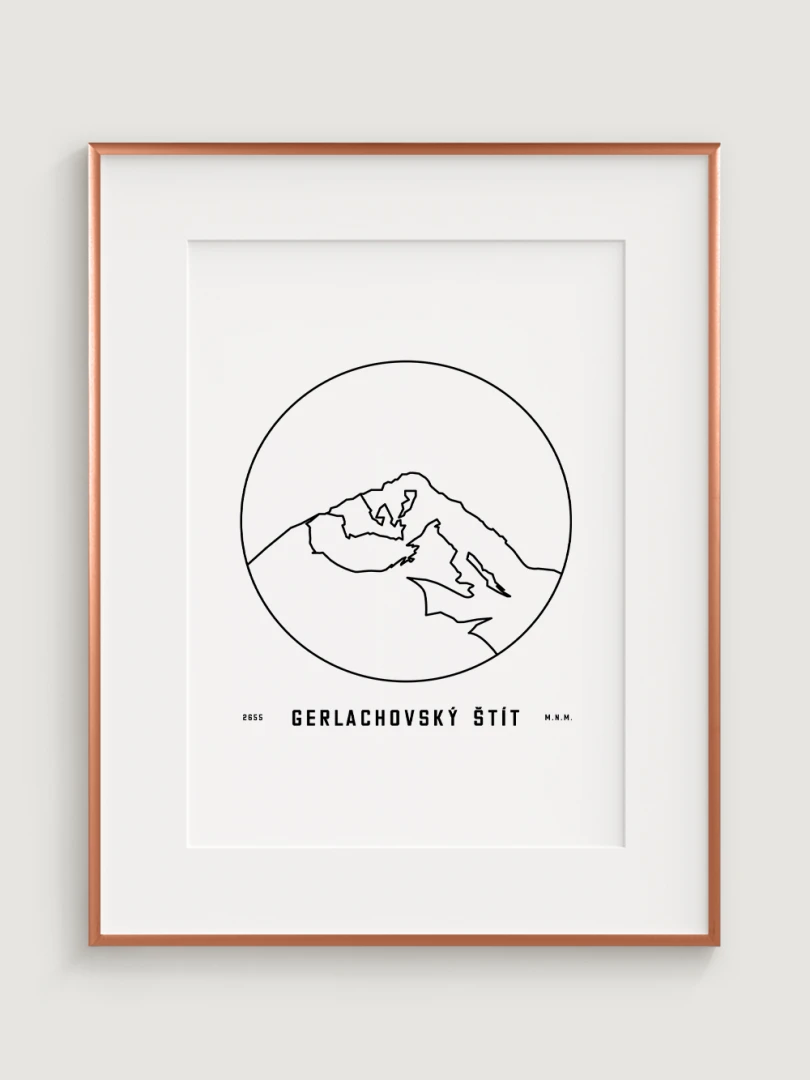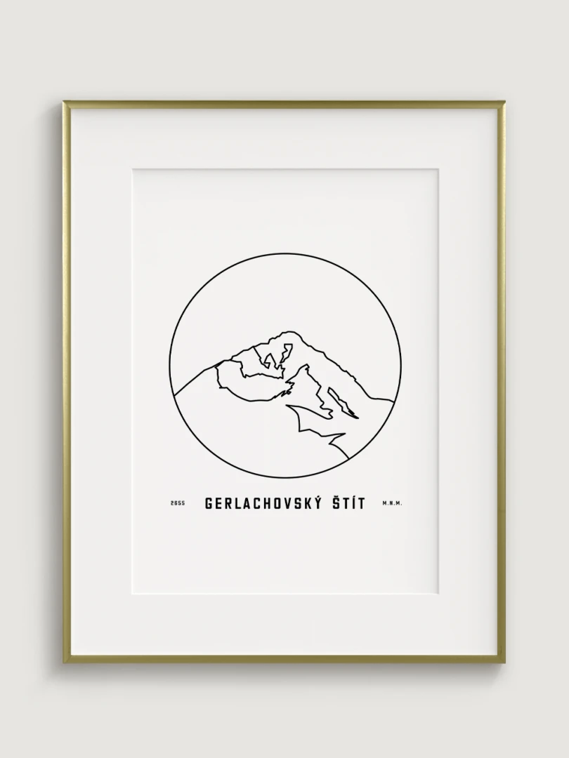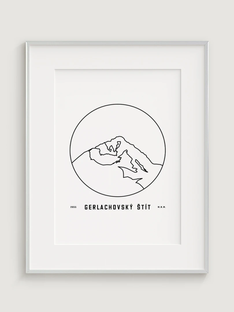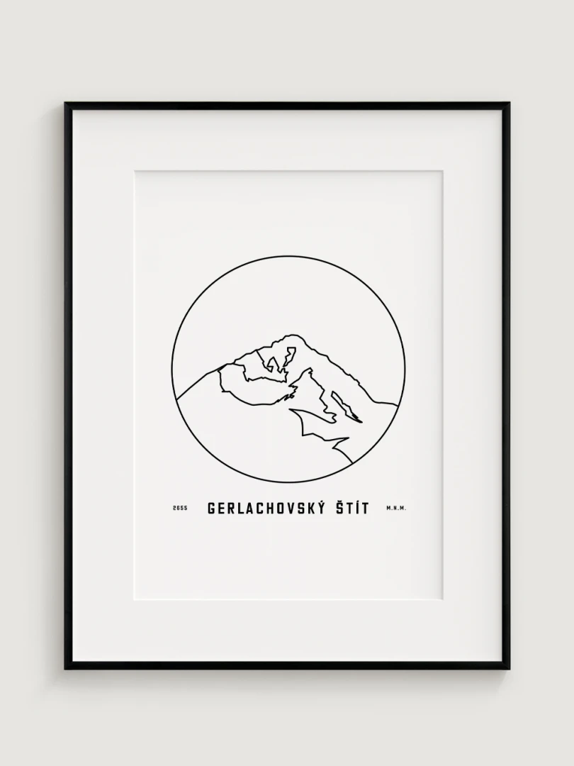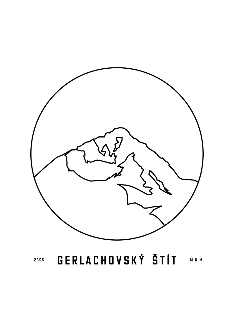 Gerlachovský štít je znázornený v detailnej kruhovej vinete s uvedením jeho názvu a nadmorskej výšky, čo vytvára jedinečný a estetický doplnok pre milovníkov prírody a hôr. Tento print je ideálnym darčekom pre tých, ktorí si chcú domov priniesť kúsok slovenskej krajiny a majestátnosť jej vrcholov.