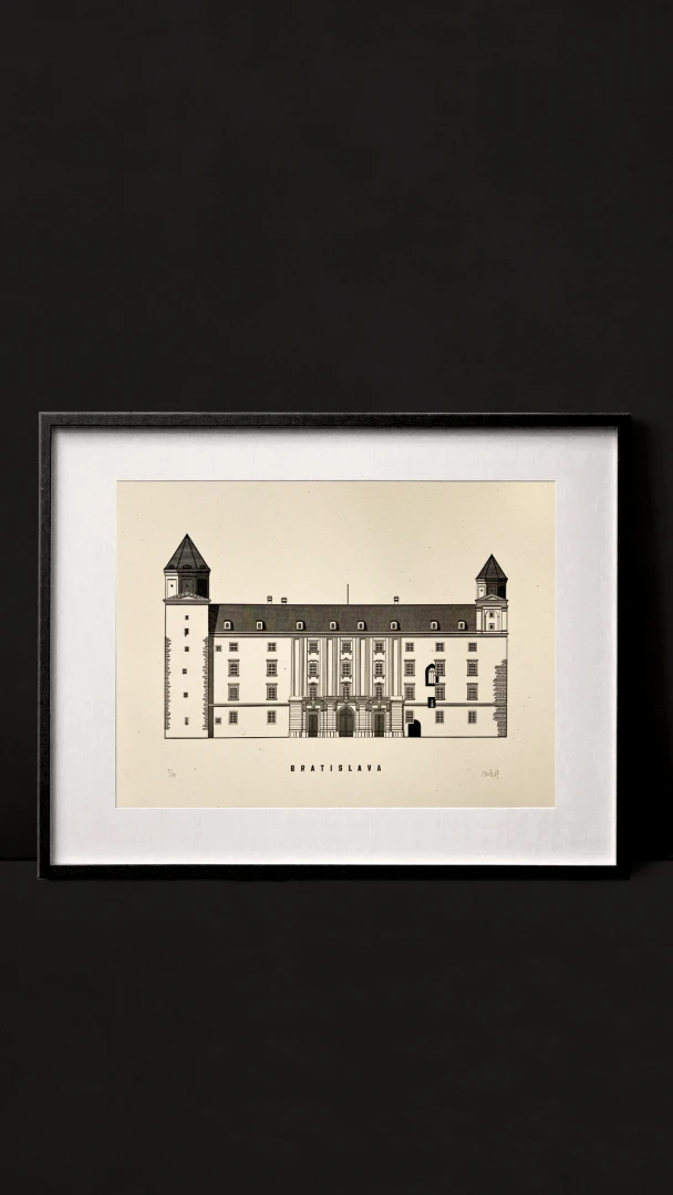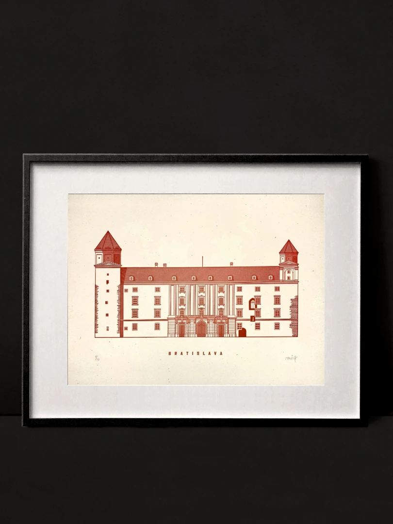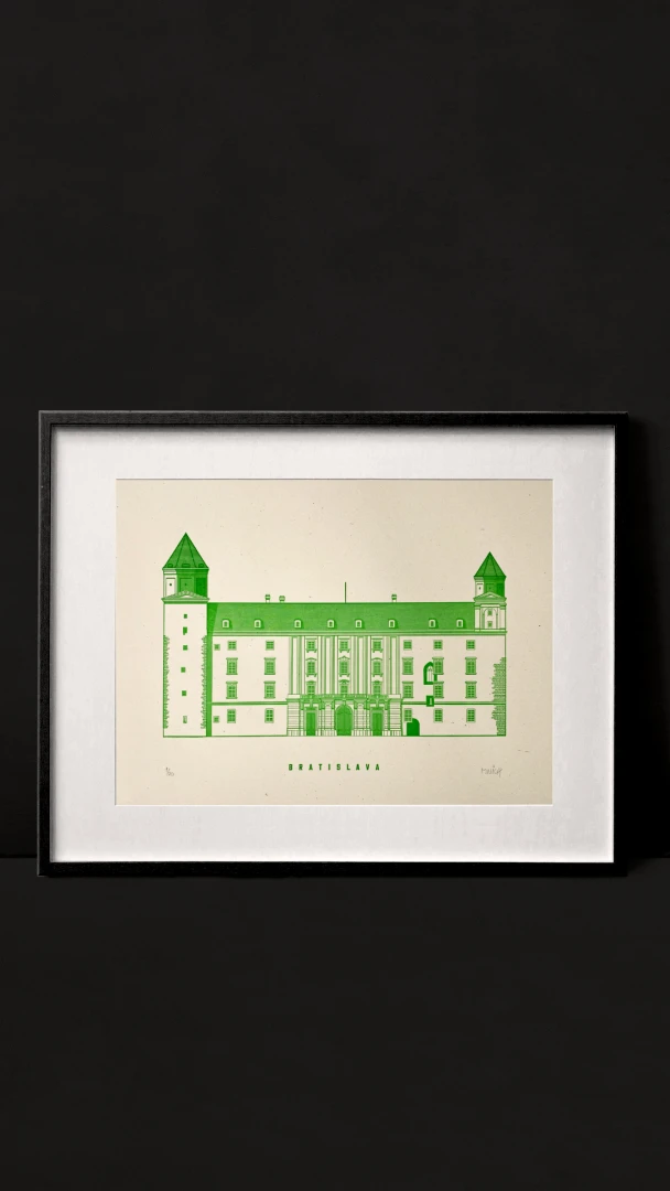 Monumentálny Bratislavský hrad vidieť z veľkej diaľky. Jeho výraznú siluetu zbadá asi každý návštevník Bratislavy. Majestátnosť Hradu umocňuje vrch, na ktorom stojí. Vystupuje do výšky 85 m nad hladinu Dunaja. Na konci 9. storočia bol významným sídelným hradiskom a k tomuto obdobiu sa viaže prvá písomná zmienka o Bratislave a to z roku 907. V máji 1811 na hrade vypukol ničivý požiar a s obrovskými ruinami zhoreného hradného paláca sa nič nedialo celých 150 rokov. Až v roku 1968 sa ukončila rekonštrukcia hradného paláca do podoby, ktorú poznáme dnes. — Vytvorené v spolupráci s Noistypo @noistypo na starom analogovom ručonom tlačiarenskom stroji zo 70rokov minulého storočia v Novej Cvernovke a v 2 farbách v limitovaných počtoch 20 kusov z každej verzie. Dotlač nebudeme robiť. — Autor printu: Jozef Mnich — Formát printu: A3 — Maximálne 2ks na 1 objednávku. — Rám nie je súčasťou balenia.