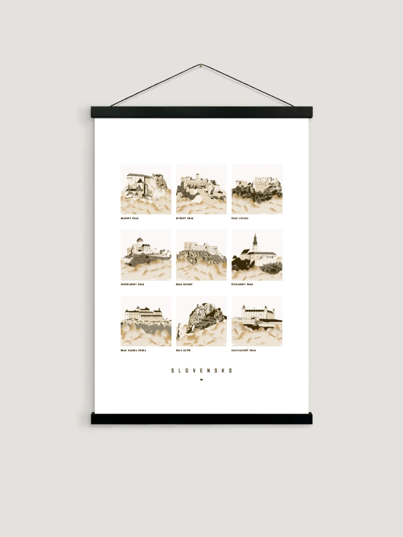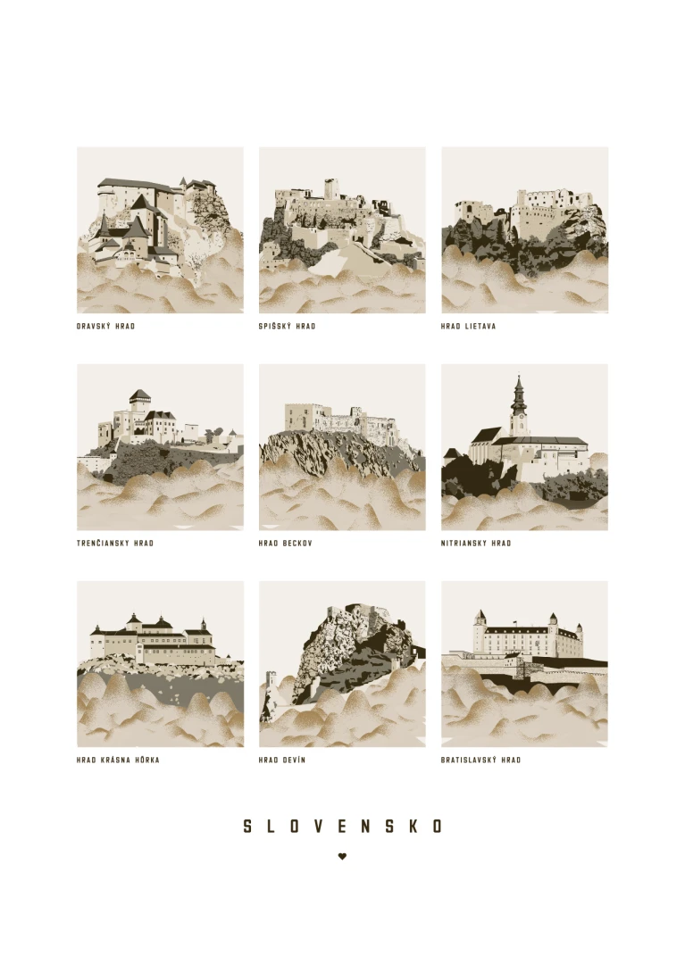 Tento print krásne zachytáva architektonickú eleganciu a historický význam každého hradu prostredníctvom série detailných ilustrácií, ponúkajúc okno do minulosti a oslavujúc kultúrne dedičstvo Slovenska.