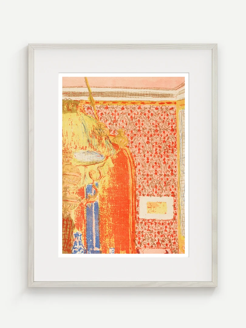 Tento print vychádza z farebnej litografie Interiér s ružovou tapetou III, ktorú Vuillard vytvoril v roku 1899 ako súčasť série Paysages et Intérieurs. Zobrazuje stenu pokrytú výraznou ružovou tapetou s dekoratívnym vzorom. Scéna je rozdelená dverami, cez ktoré možno nazrieť do ďalších miestností s postavami, čím Vuillard vytvára vrstvený a hĺbkový pohľad na súkromný priestor.