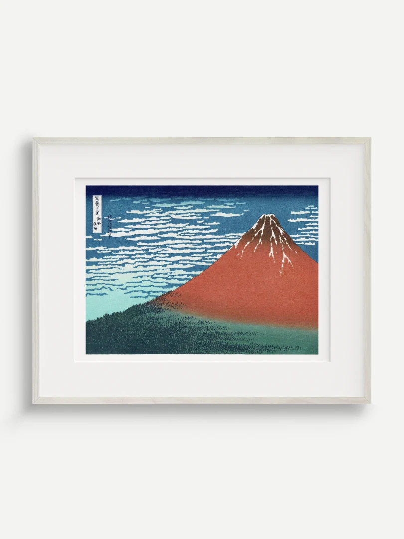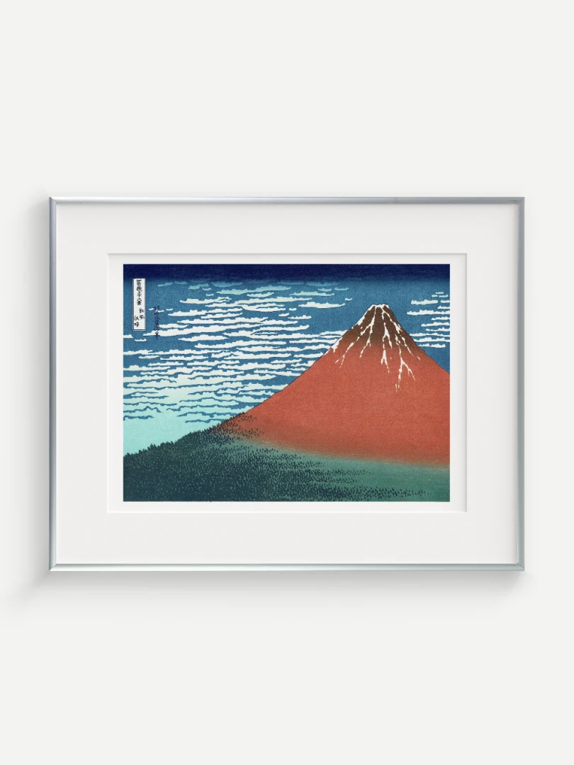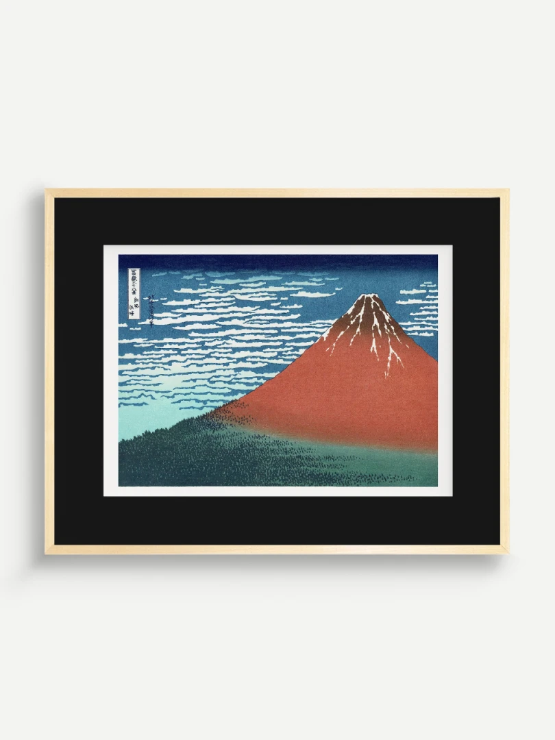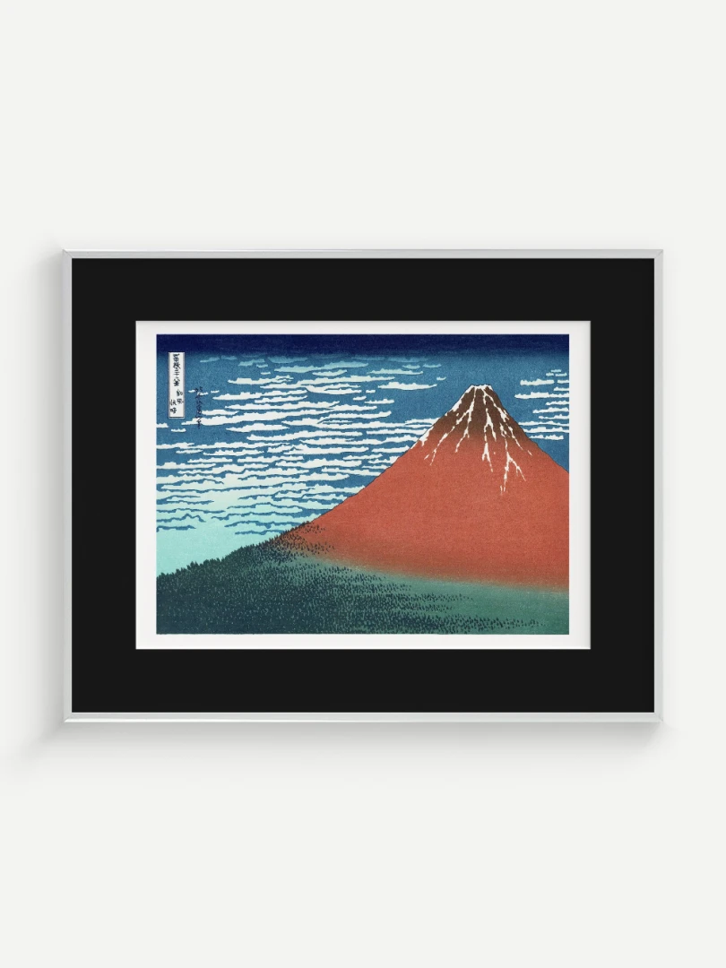 Tento nádherný umelecký print patrí do slávnej série „Tridsaťšesť pohľadov na horu Fudži“, ktorá je jednou z najvýznamnejších umeleckých reprezentácií konkrétneho miesta v dejinách umenia. Hokusai v tomto diele zachytil horu Fudži v rannom svetle letného dňa, keď sa jej svahy zafarbujú do sýtych odtieňov červenej pod vplyvom vychádzajúceho slnka.