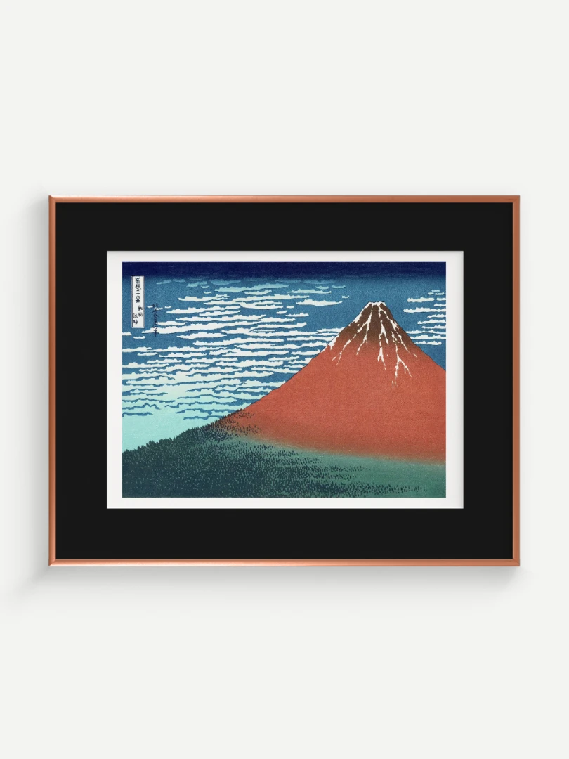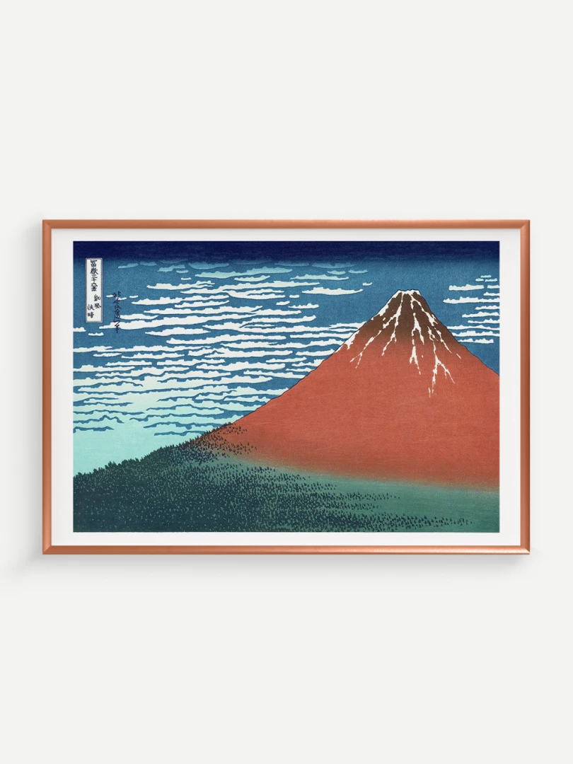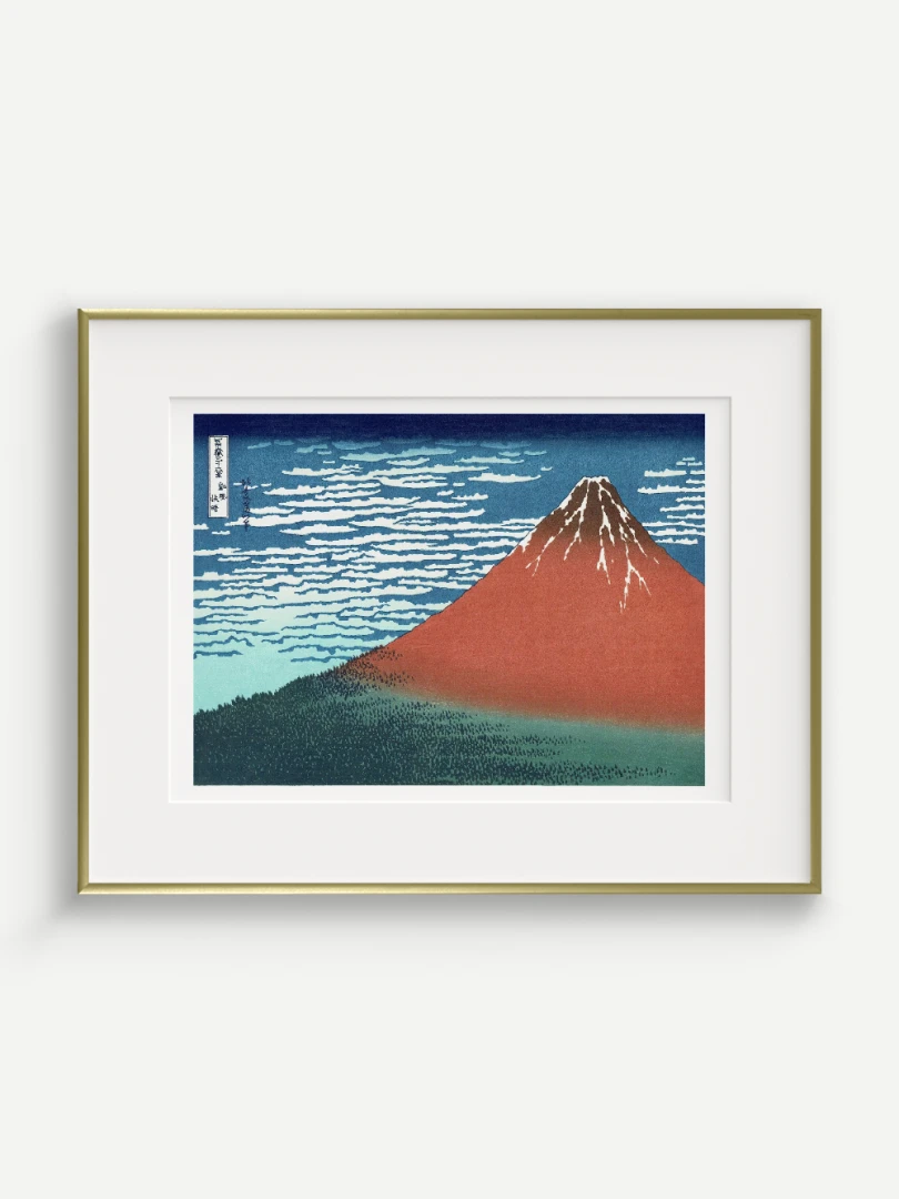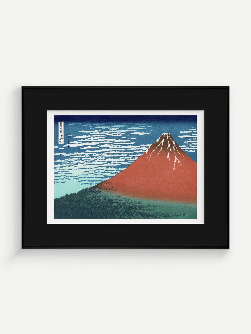 Tento nádherný umelecký print patrí do slávnej série „Tridsaťšesť pohľadov na horu Fudži“, ktorá je jednou z najvýznamnejších umeleckých reprezentácií konkrétneho miesta v dejinách umenia. Hokusai v tomto diele zachytil horu Fudži v rannom svetle letného dňa, keď sa jej svahy zafarbujú do sýtych odtieňov červenej pod vplyvom vychádzajúceho slnka.