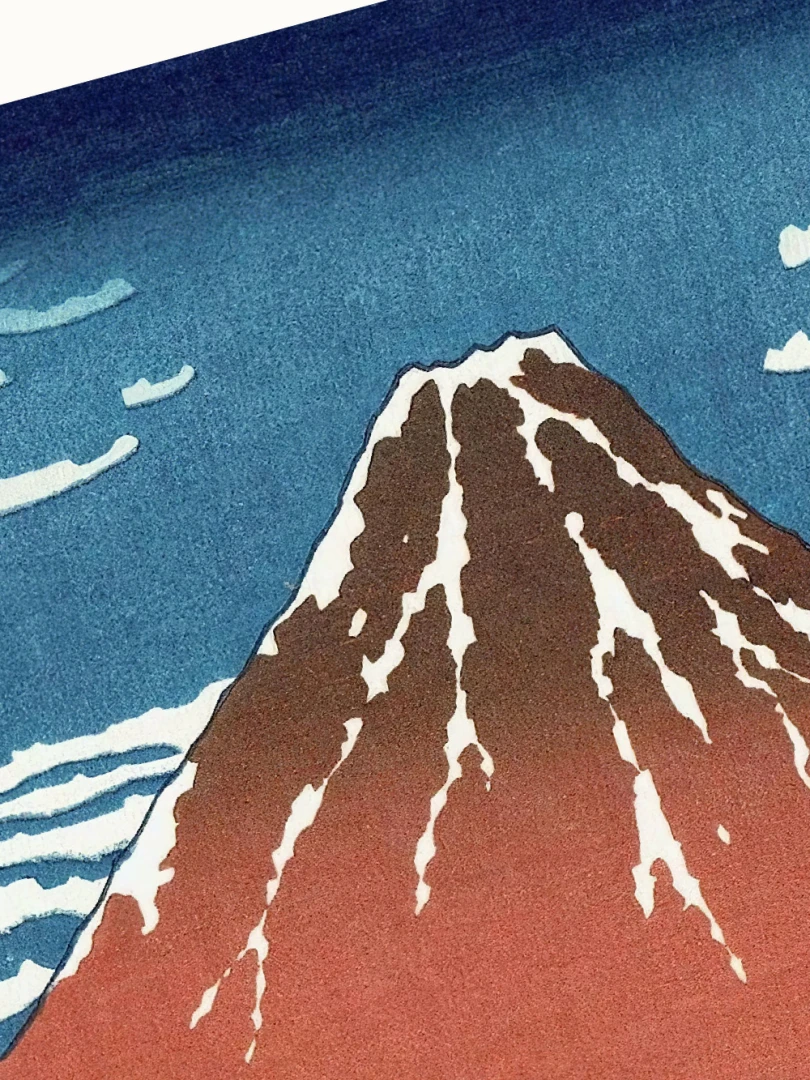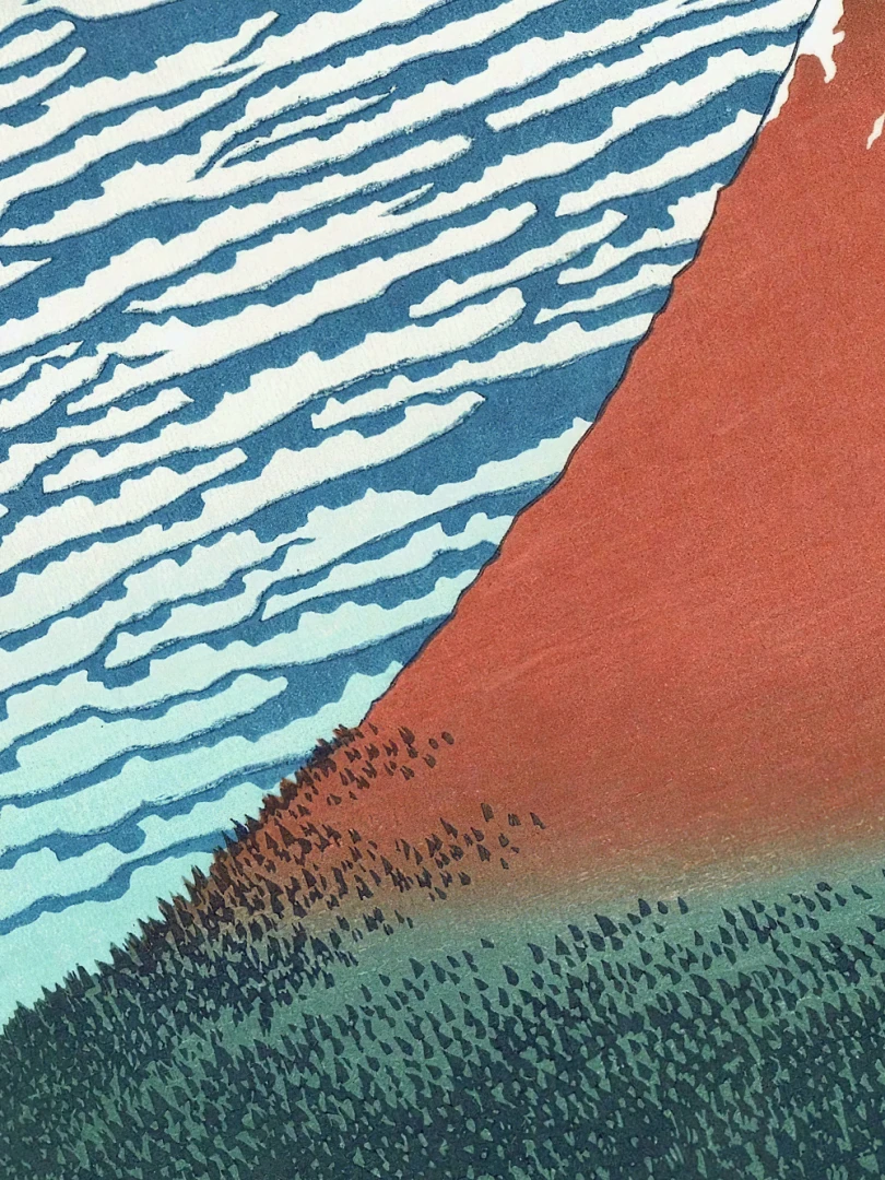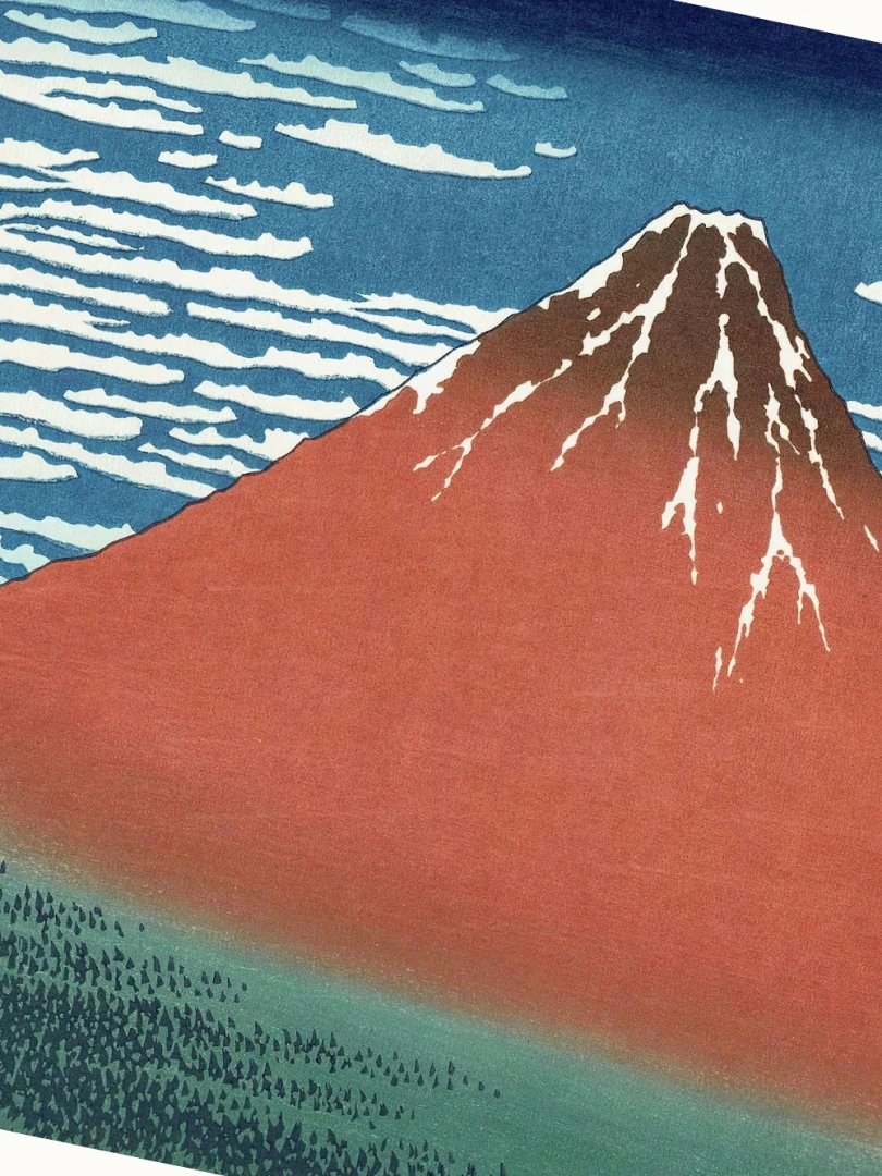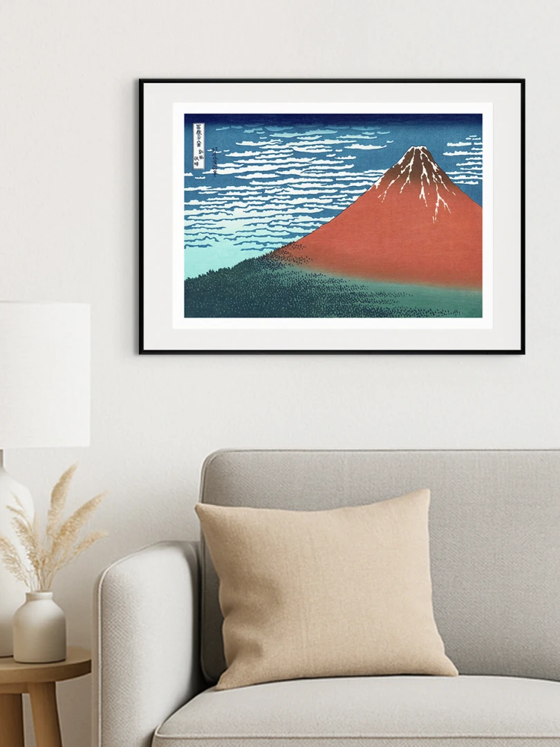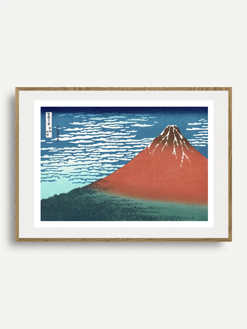 Tento nádherný umelecký print patrí do slávnej série „Tridsaťšesť pohľadov na horu Fudži“, ktorá je jednou z najvýznamnejších umeleckých reprezentácií konkrétneho miesta v dejinách umenia. Hokusai v tomto diele zachytil horu Fudži v rannom svetle letného dňa, keď sa jej svahy zafarbujú do sýtych odtieňov červenej pod vplyvom vychádzajúceho slnka.