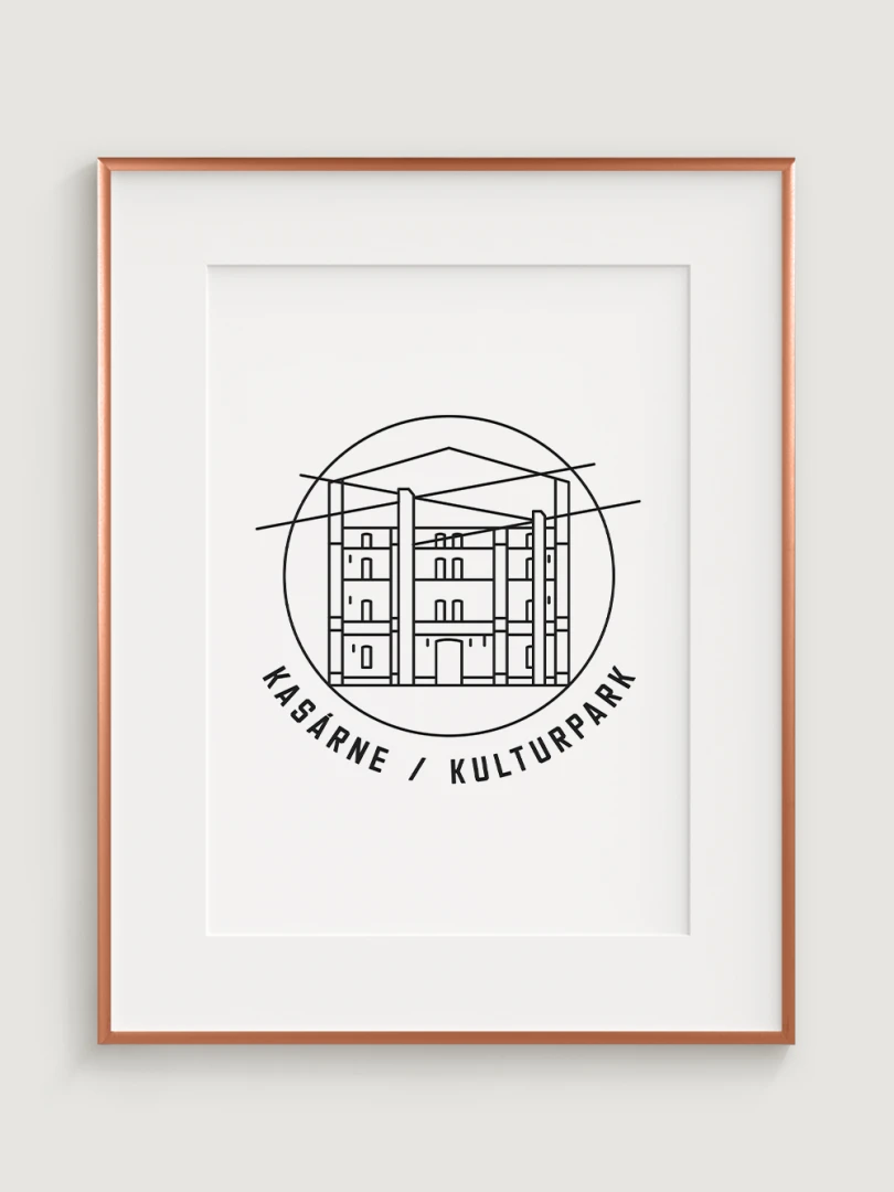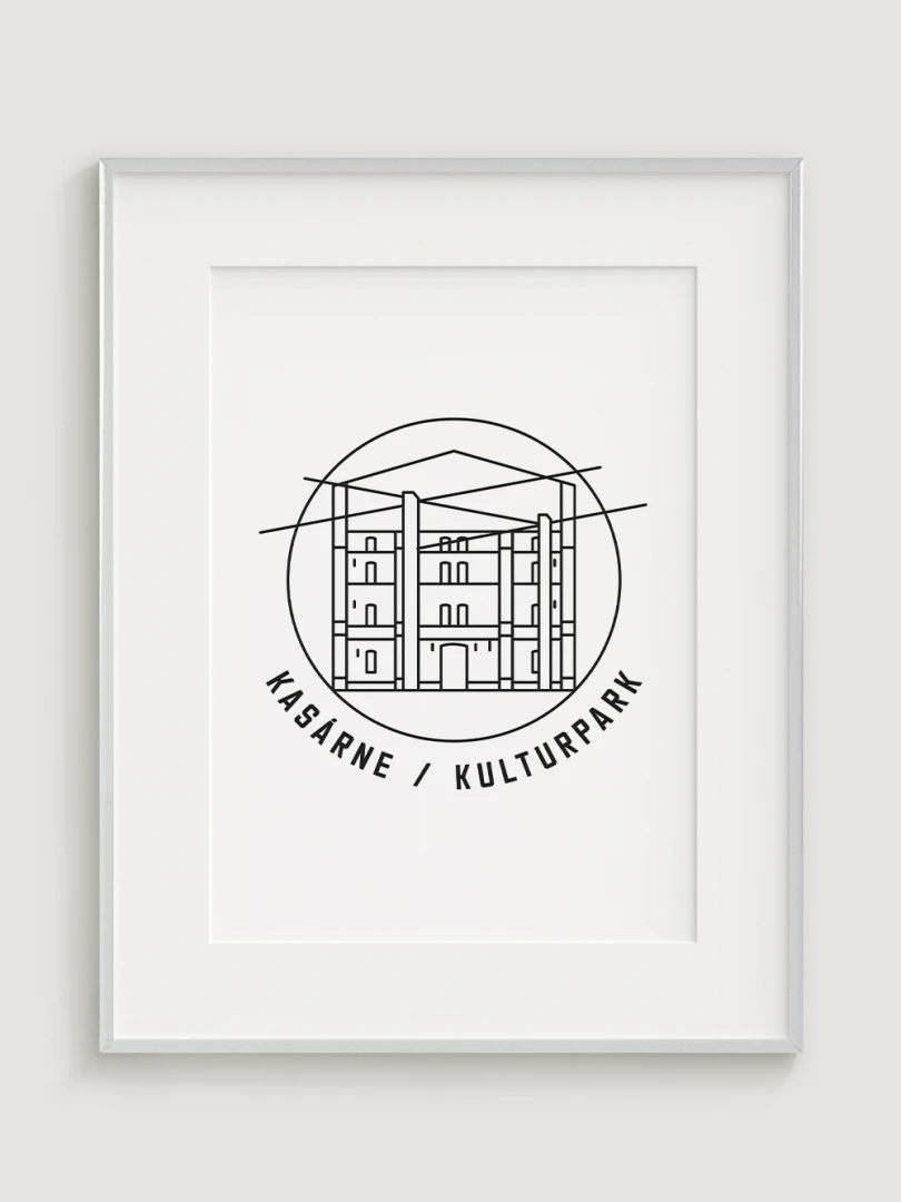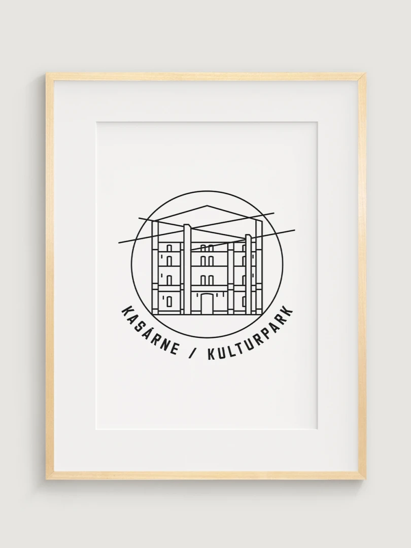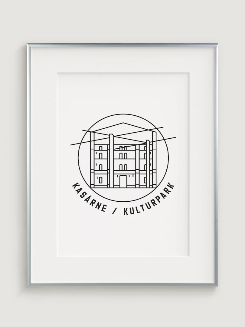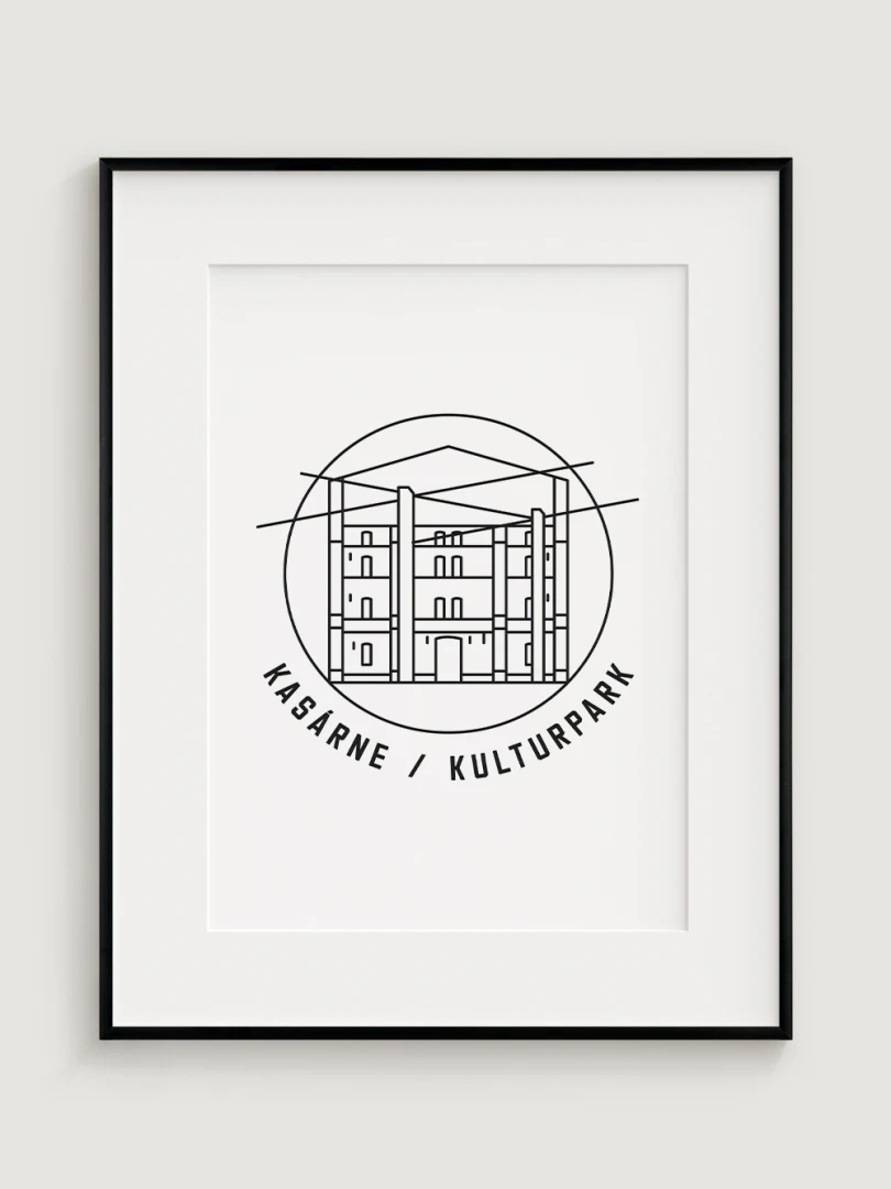 Tento print predstavuje štýlizované, minimalistické zobrazenie Kasární v Košiciach, budovy, ktorá prešla z vojenského využitia na kultúrne centrum s moderným charakterom. Vypracovaný s jemnou čiernou linkovou kresbou na kvalitnom papieri, táto ilustrácia zachytáva pôsobivé línie a detaily budovy v súčasnom a nadčasovom štýle.