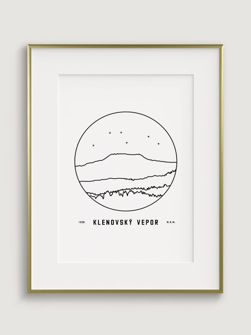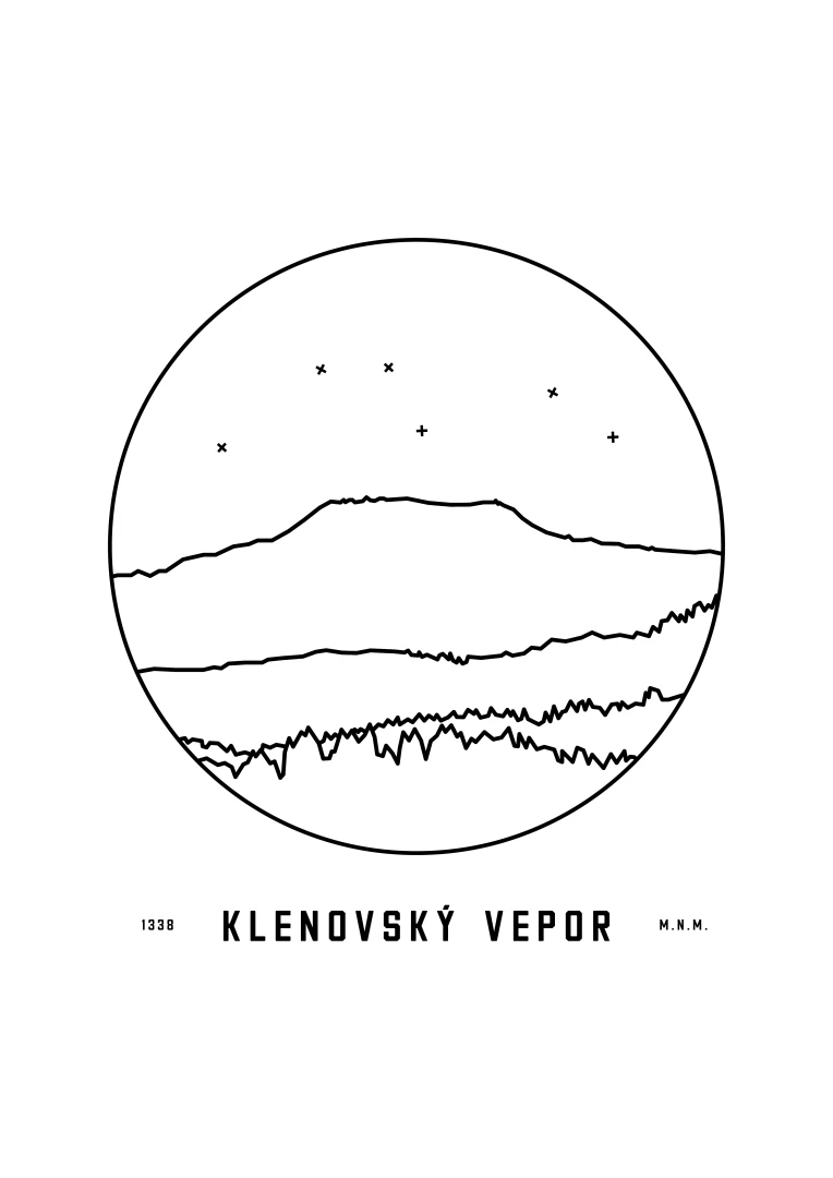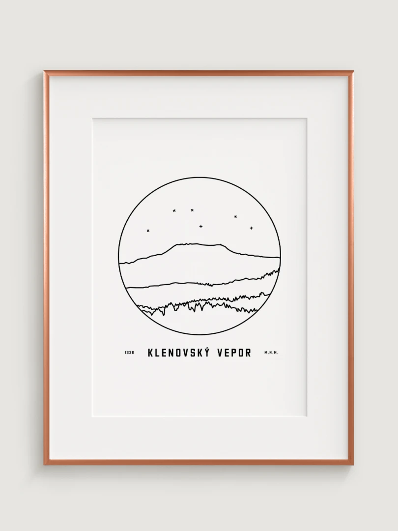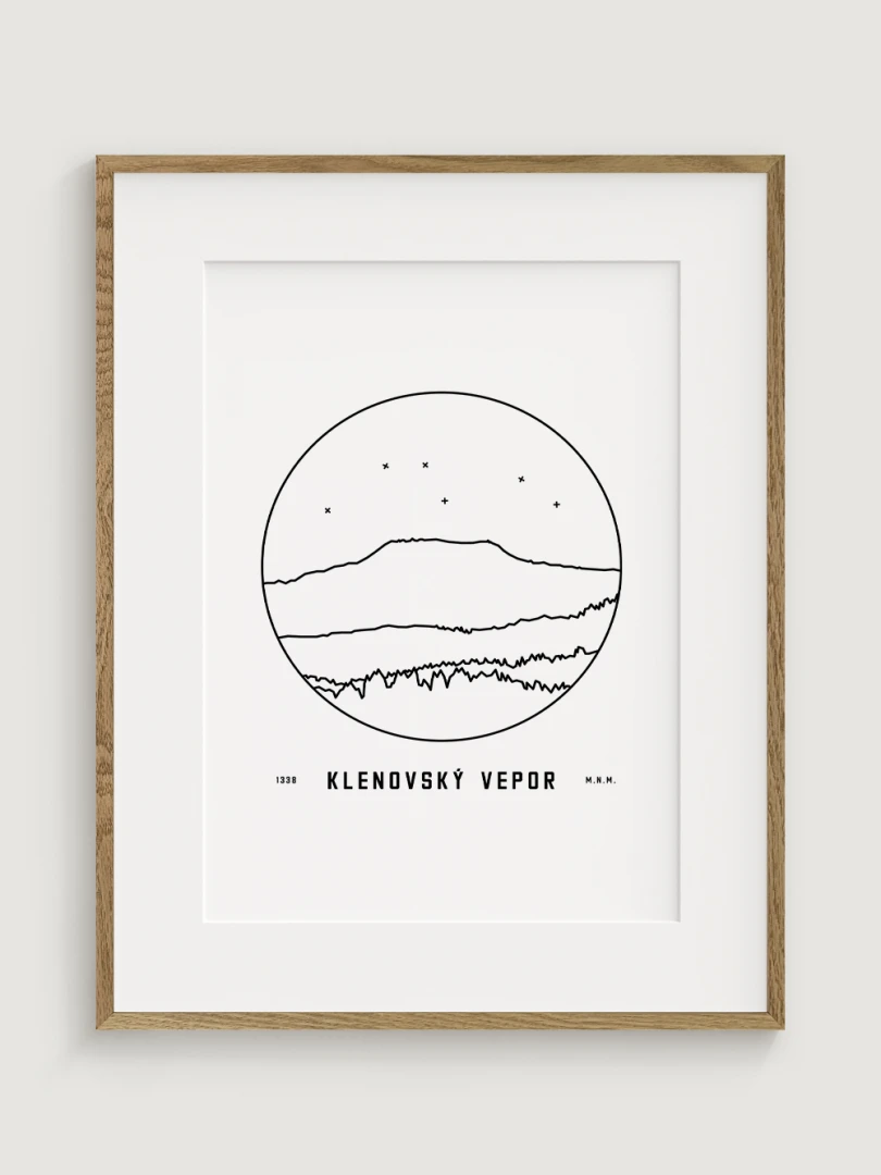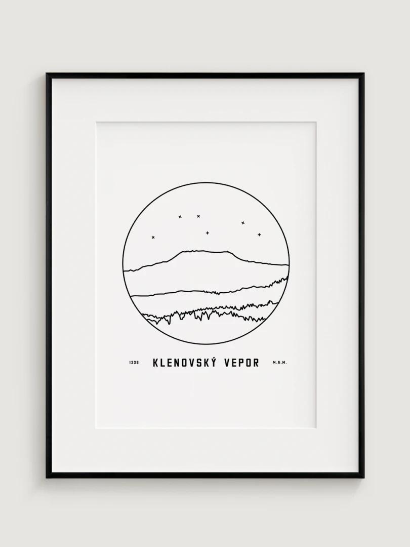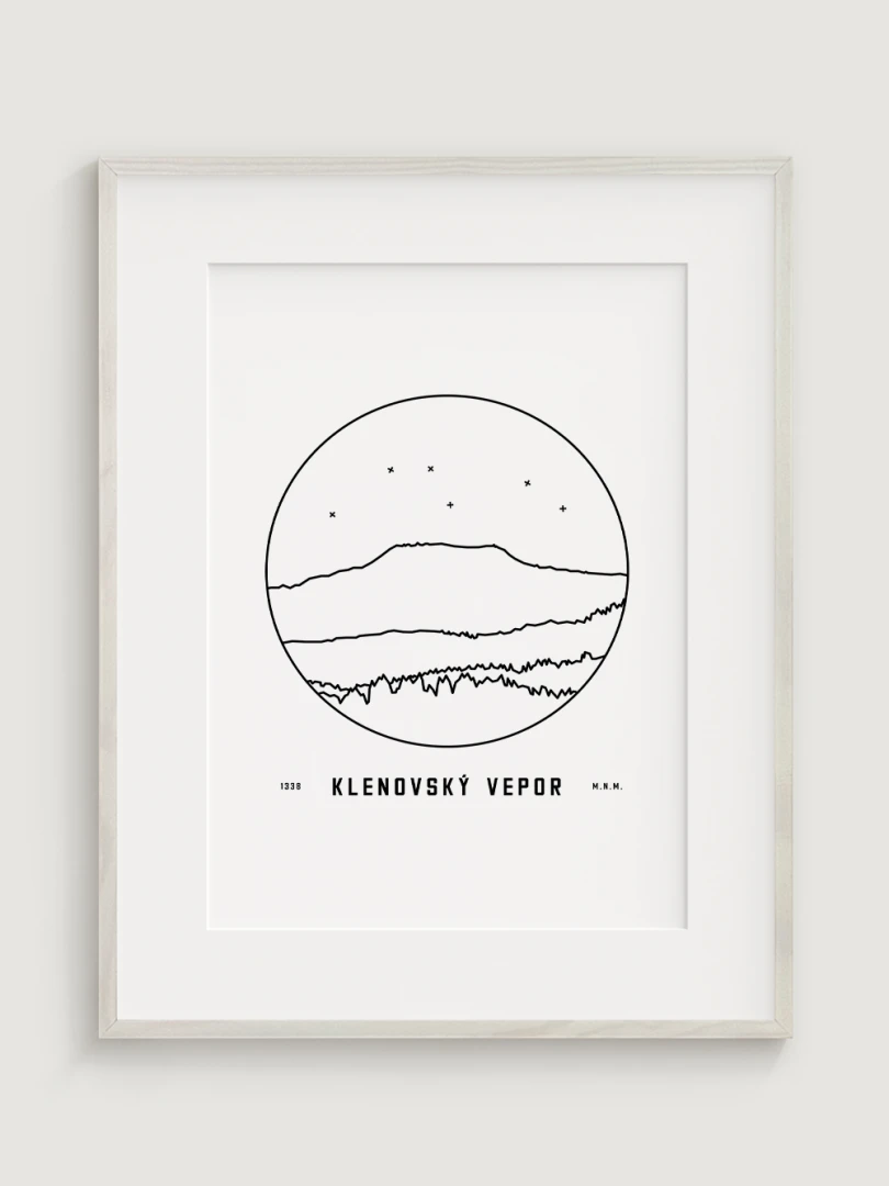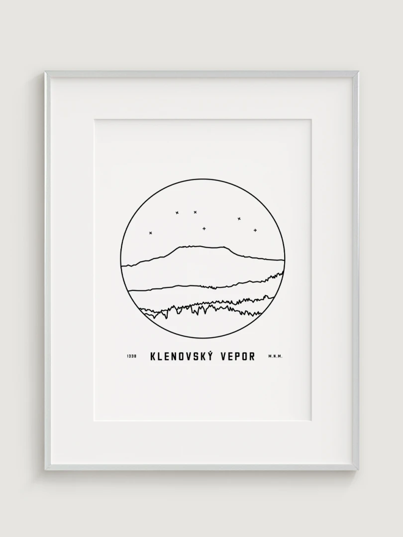 Klenovský vepor je znázornený v detailnej kruhovej vinete s uvedením jeho názvu a nadmorskej výšky, čo vytvára jedinečný a estetický doplnok pre milovníkov prírody a hôr. Tento print je ideálnym darčekom pre tých, ktorí si chcú domov priniesť kúsok slovenskej krajiny a majestátnosť jej vrcholov.