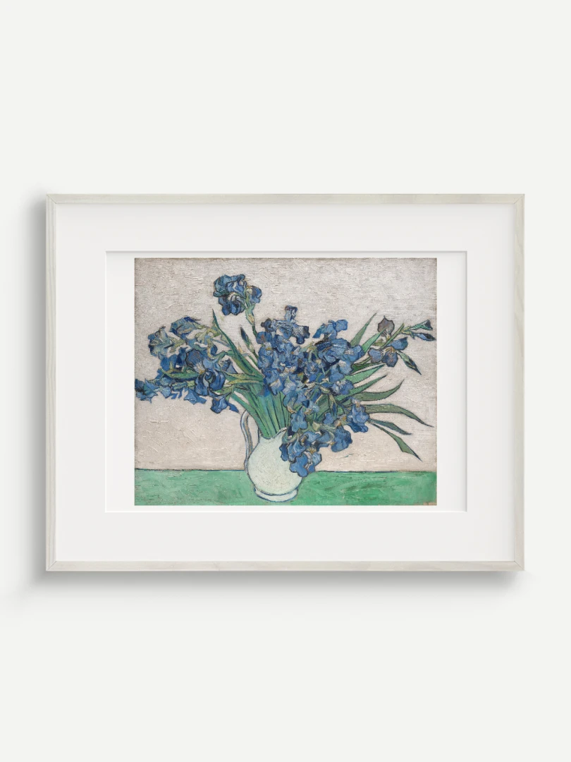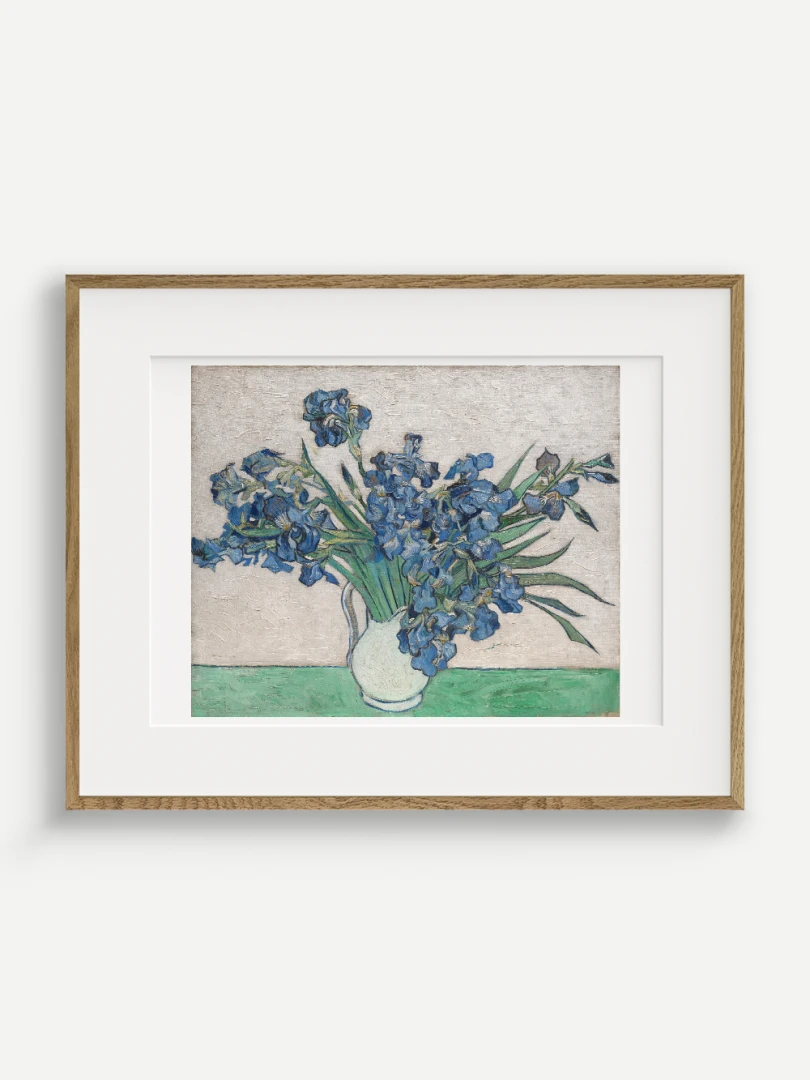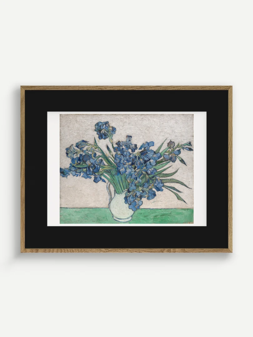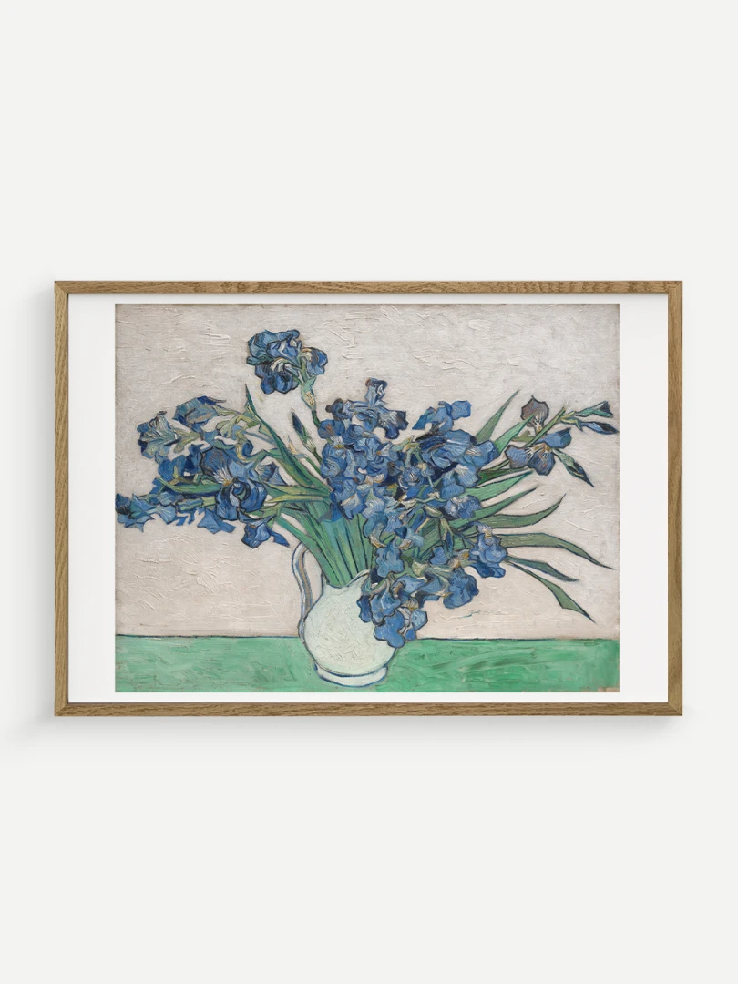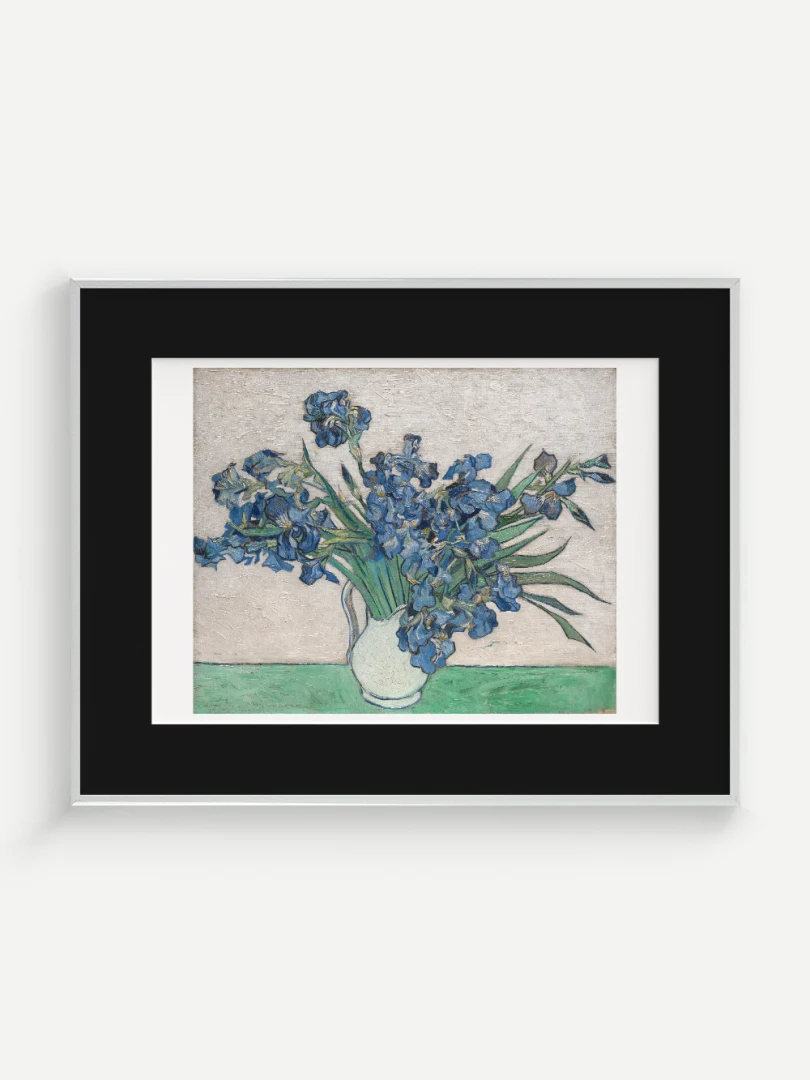Tento nádherný umelecký print zachytáva záplavu rozkvitnutých kosatcov, ktoré Van Gogh namaľoval v máji 1890, krátko pred svojím odchodom z azylu v Saint-Rémy. Toto dielo patrí k jeho štyrom veľkolepým zátišiam s jarnými kvetmi, ktoré vytvoril počas svojho posledného roka v azyle. Dve z nich zobrazovali kosatce, dve ruže, pričom každé dielo sa vyznačovalo kontrastnými farebnými schémami a kompozíciou.