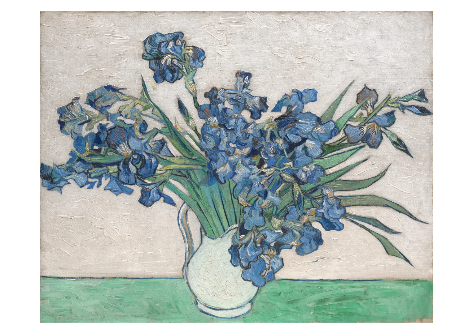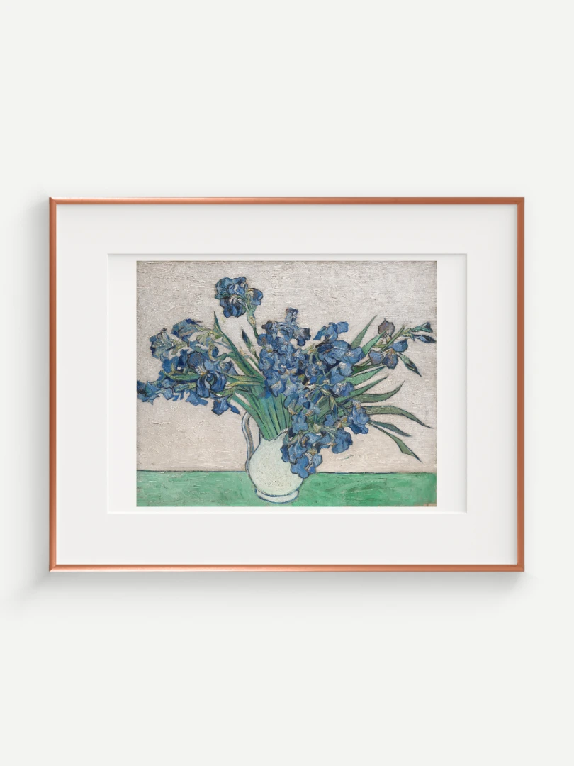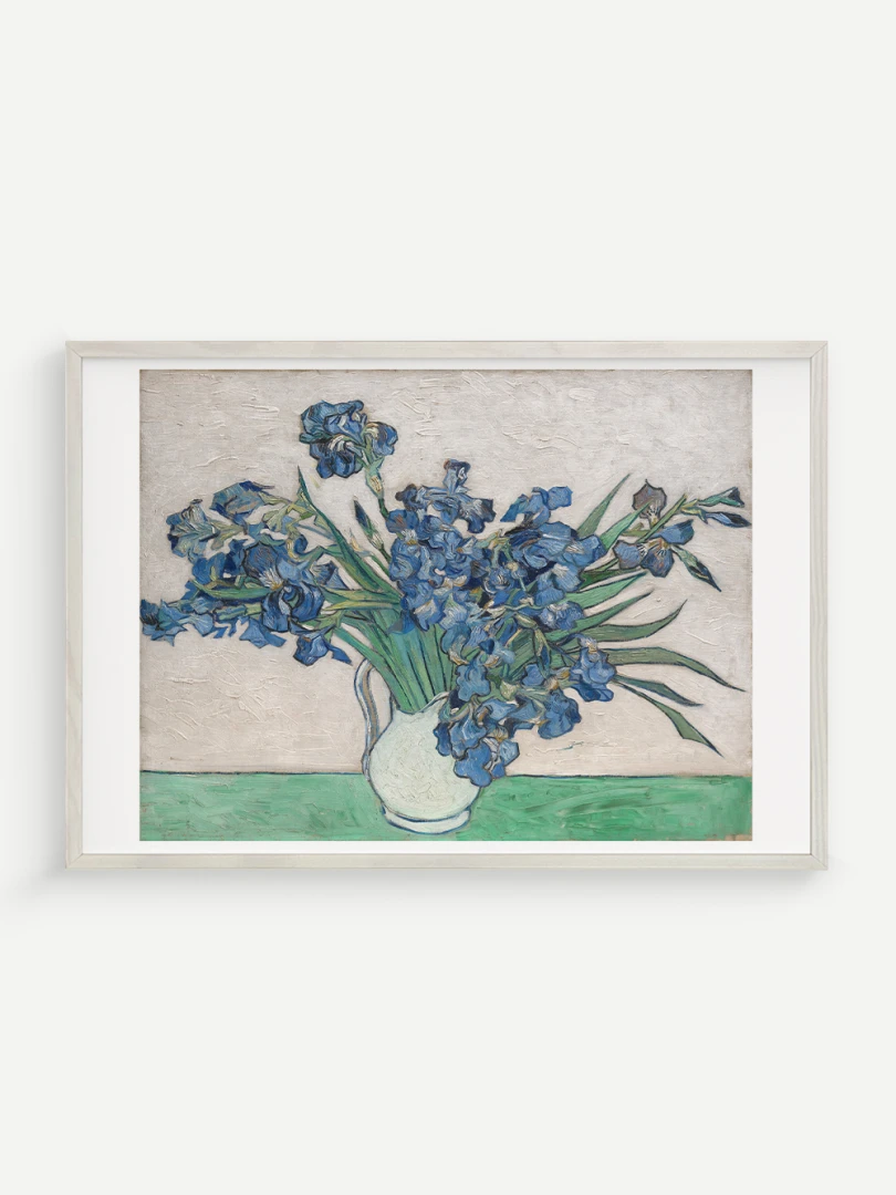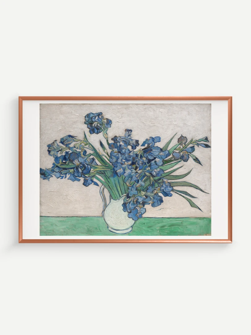 Tento nádherný umelecký print zachytáva záplavu rozkvitnutých kosatcov, ktoré Van Gogh namaľoval v máji 1890, krátko pred svojím odchodom z azylu v Saint-Rémy. Toto dielo patrí k jeho štyrom veľkolepým zátišiam s jarnými kvetmi, ktoré vytvoril počas svojho posledného roka v azyle. Dve z nich zobrazovali kosatce, dve ruže, pričom každé dielo sa vyznačovalo kontrastnými farebnými schémami a kompozíciou.