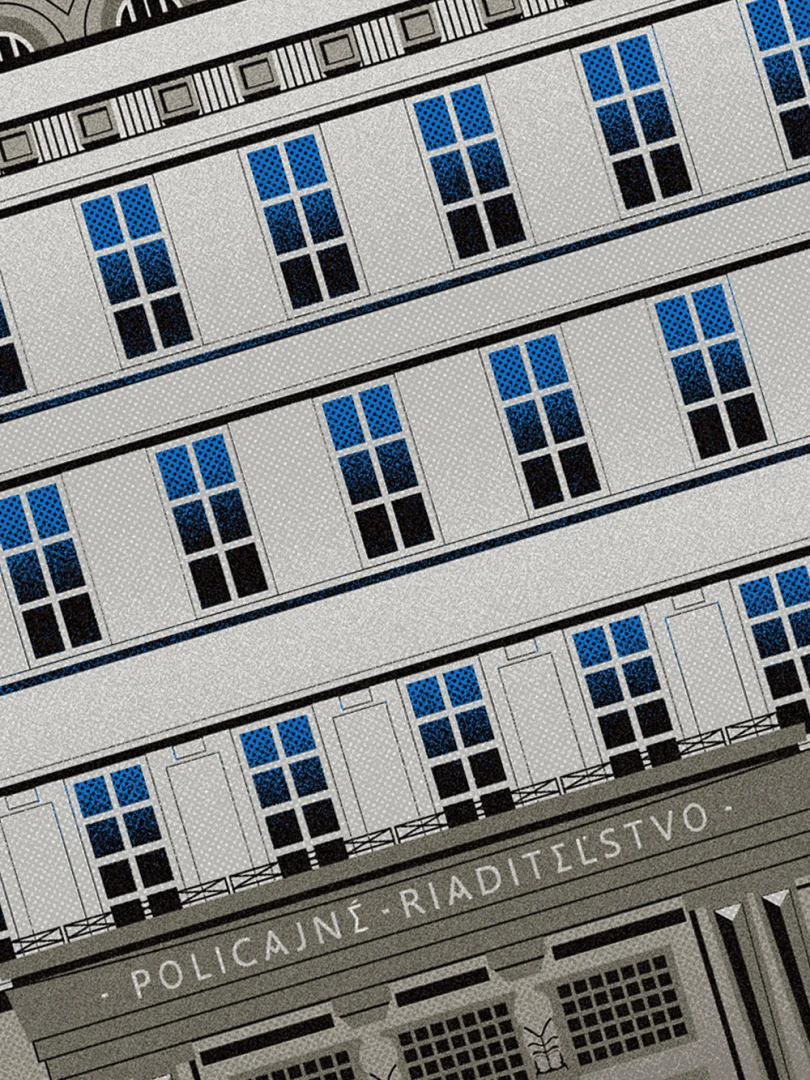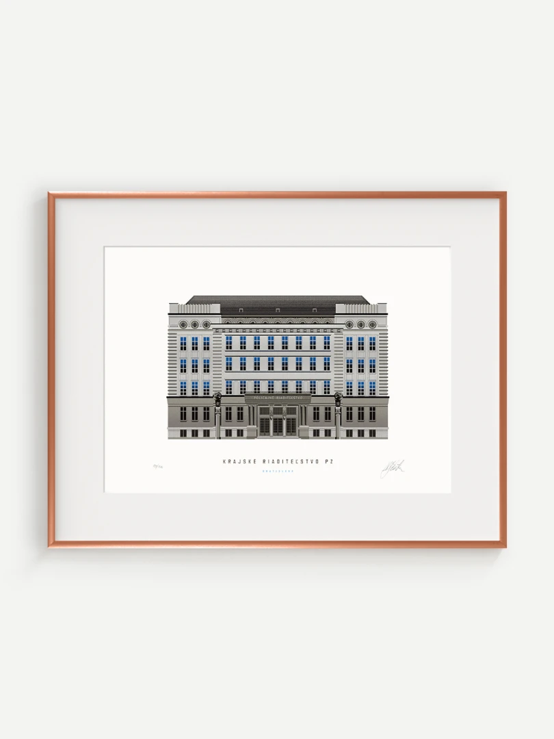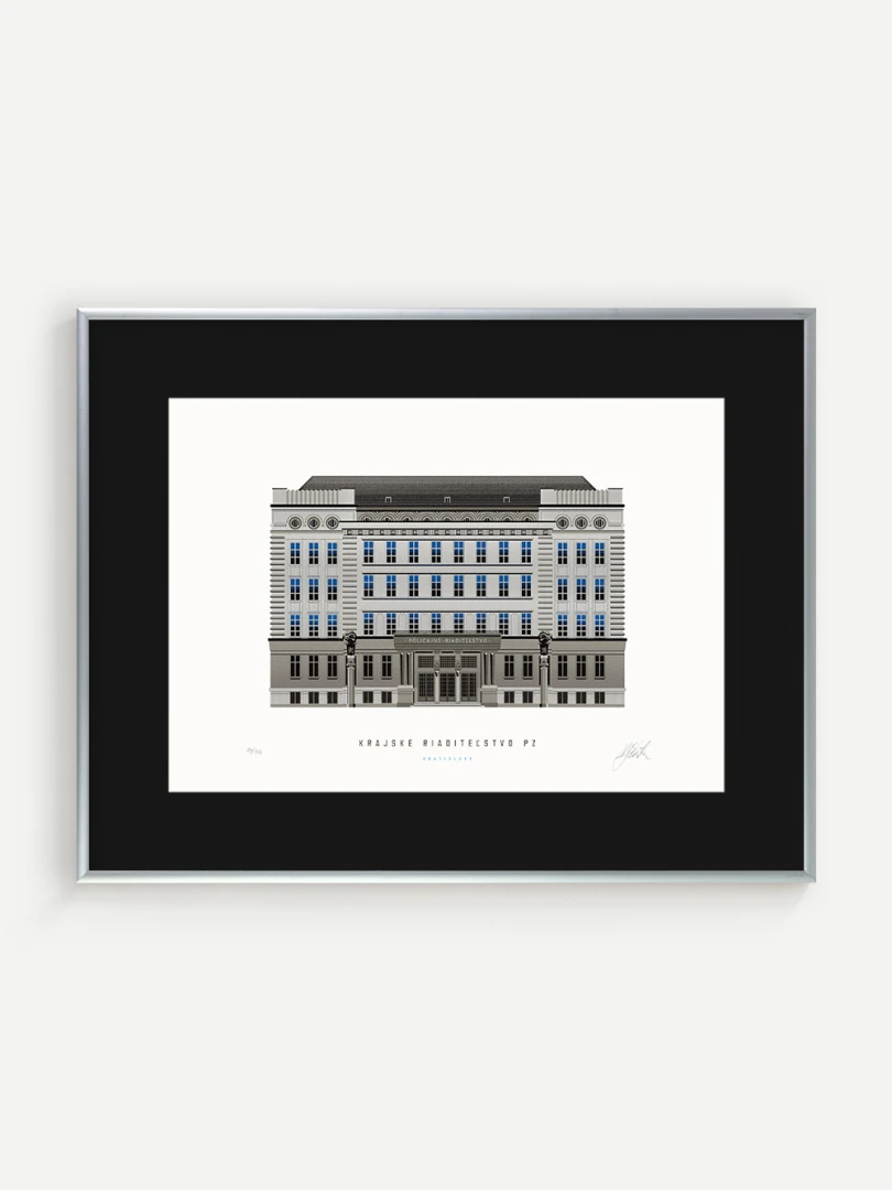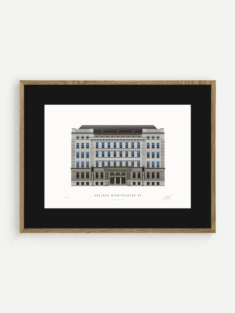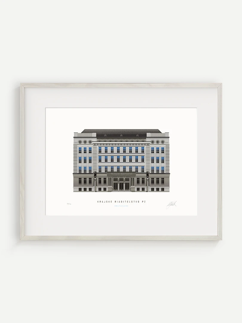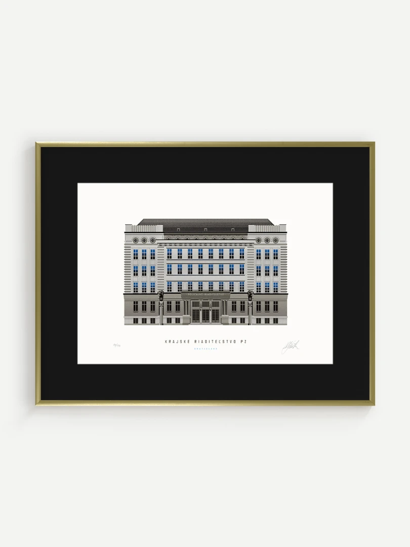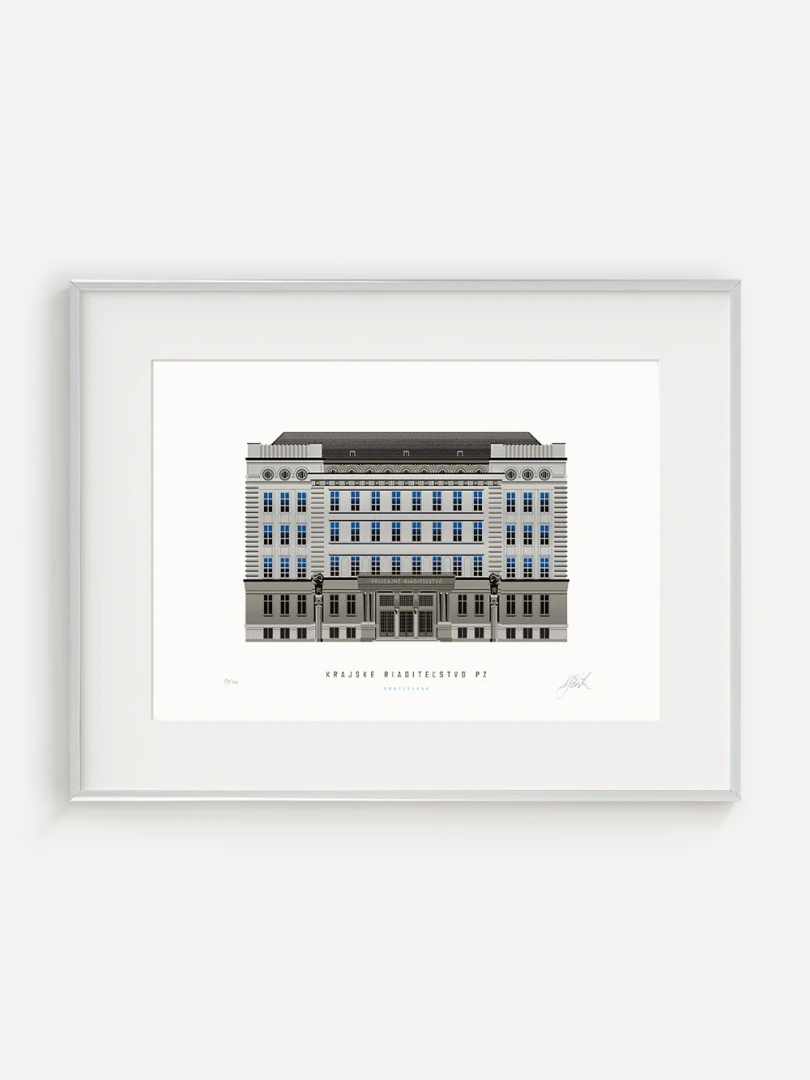 Krajské riaditeľstvo Policajného zboru v Bratislave Budovu Krajského riaditeľstva Policajného zboru v Bratislave pozná väčšina Bratislavčanov pod názvom „U dvoch levov“. Postavili ju v roku 1924 podľa návrhu českého architekta Františka Krupku. Nad vchodom sú umiestnené plastiky Atlantov v podobe spútaných väzňov, a po stranách plastiky dvoch sediacich levov, ktorí v labách držia štíty s československým štátnym znakom. Ich autorom je český sochár Augustín Paukert. Budova sa nesie v štýle takzvaného národného slohu, ktorý bol kombináciou pražského kubizmu s prvkami ľudovej architektúry a umenia. V tom čase patrila k najmodernejším policajným budovám v Európe, obdobné budovy boli postavené pre policajné riaditeľstvo v Košiciach a pre francúzsku políciu v Lyone. Do užívania bola odovzdaná v marci 1926. Od roku 1997do súčasnosti budova slúži ako sídlo Krajského riaditeľstva Policajného zboru v Bratislave.Jedným z podnetov na vznik grafiky bola aj knižka Zabudnutí detektívi od Petra Nevolného.Na pamiatku Dr. Jaroslava Klímu, bratislavského policajného riaditeľa, bez ktorého iniciatívyby budova riaditeľstva nebola postavená. Venované všetkým policajtom, ktorí v minulosti bojovali a doteraz bojujú s kriminalitou v bratislavských uliciach a robia naše mesto bezpečnejším.