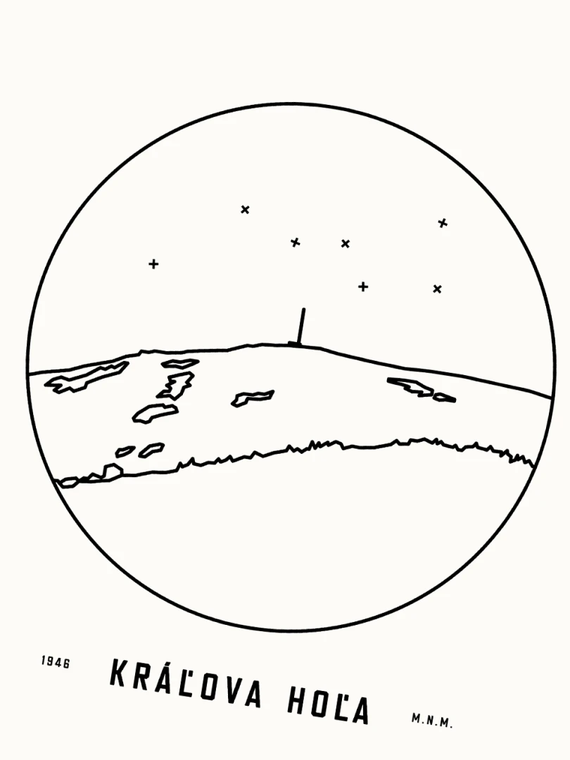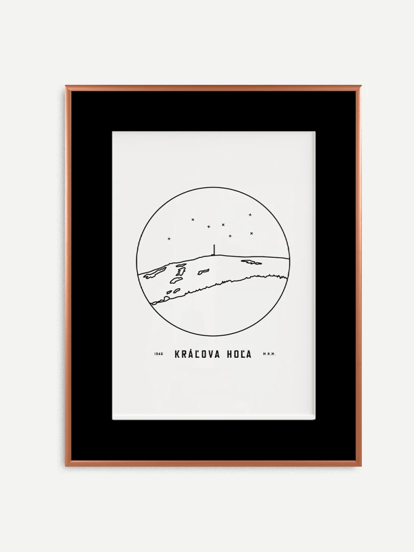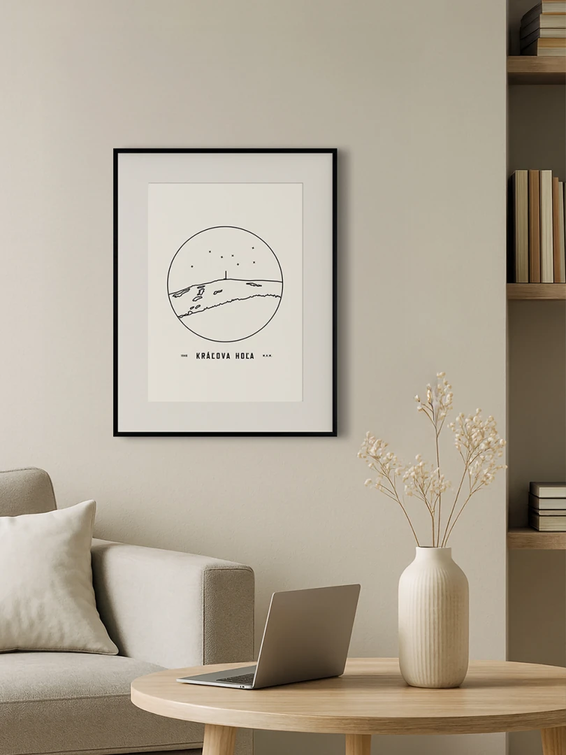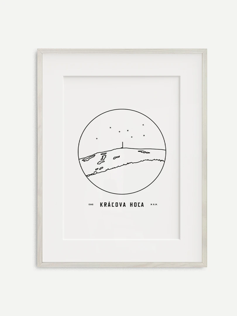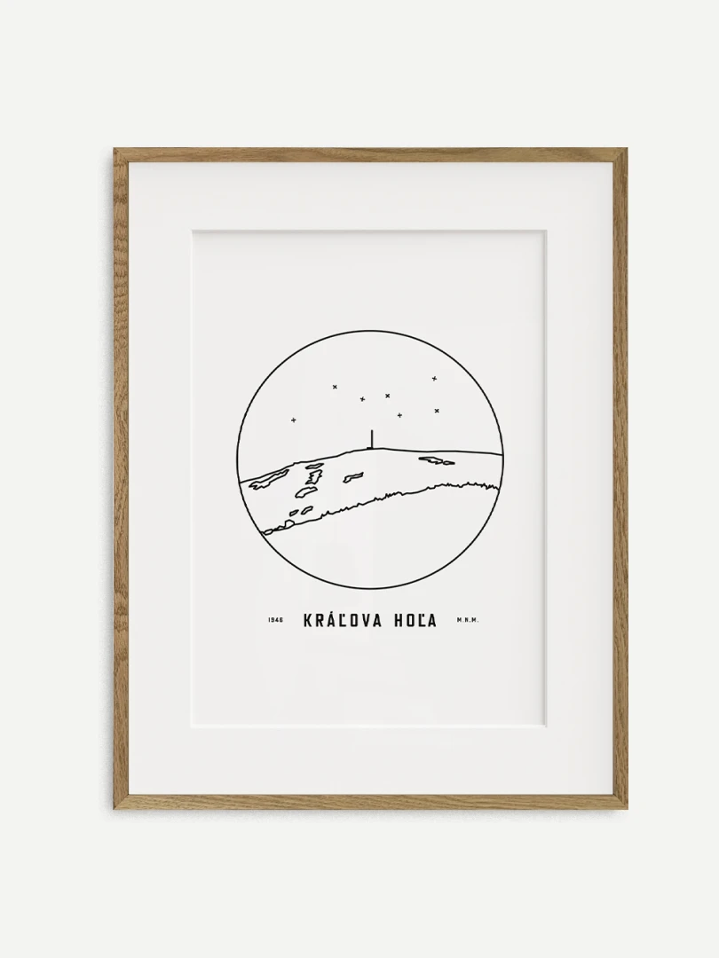 Kráľova hoľa je znázornená v detailnej kruhovej vinete s uvedením jeho názvu a nadmorskej výšky, čo vytvára jedinečný a estetický doplnok pre milovníkov prírody a hôr. Tento print je ideálnym darčekom pre tých, ktorí si chcú domov priniesť kúsok slovenskej krajiny a majestátnosť jej vrcholov.