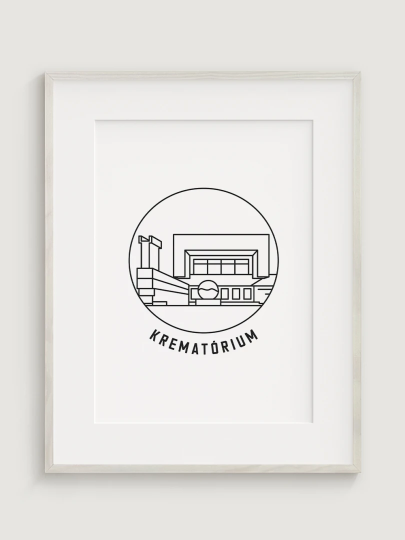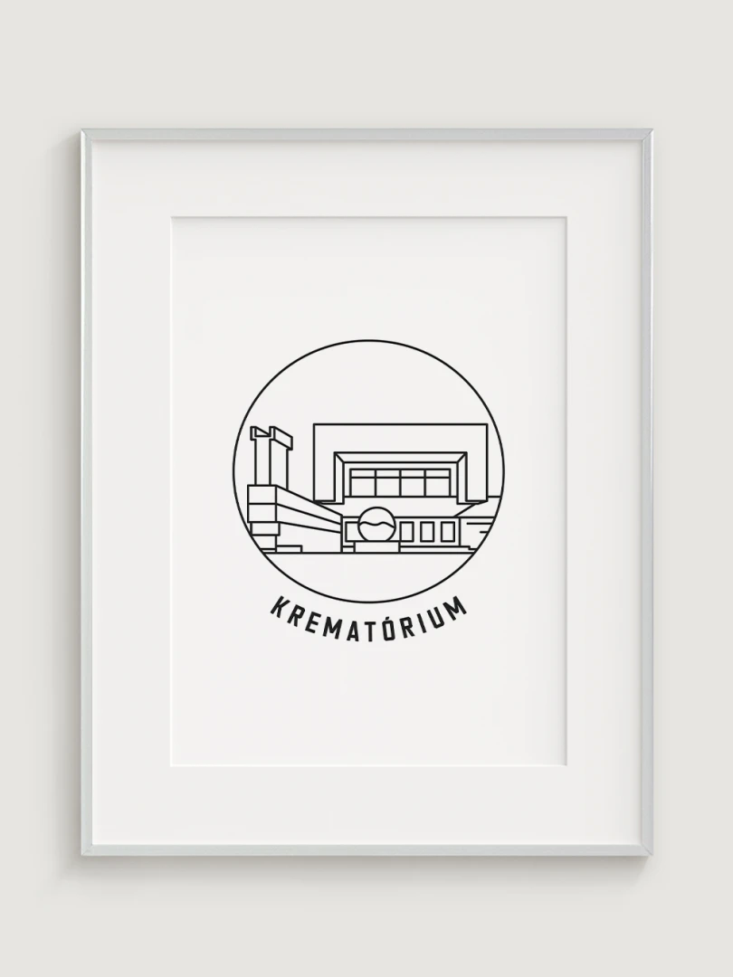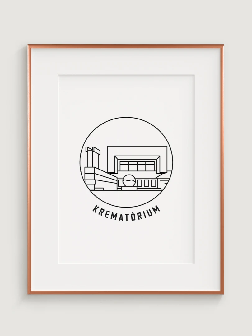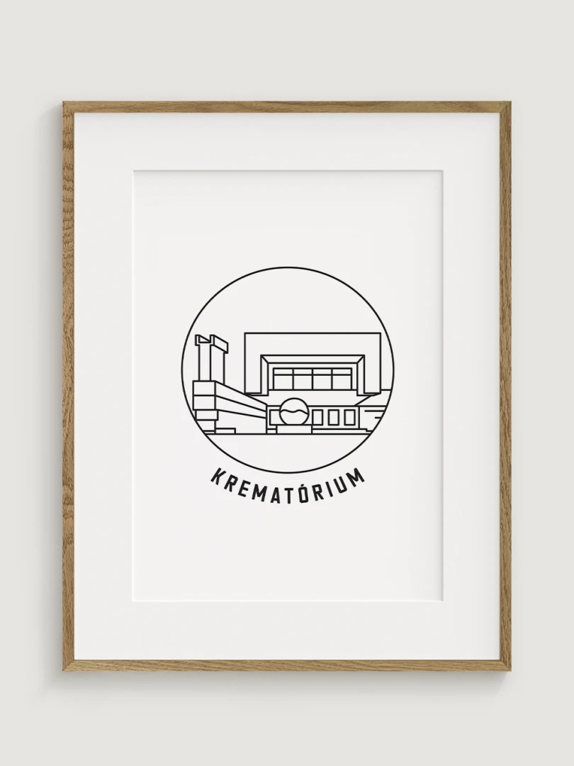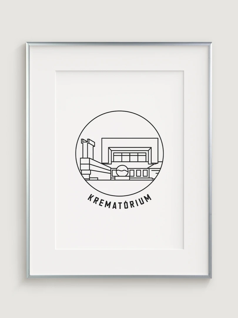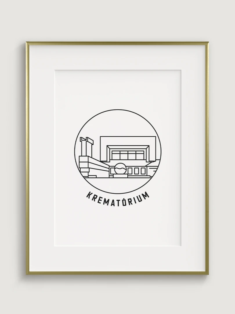 Tento print predstavuje štýlizované, minimalistické zobrazenie Krematória v Košiciach, funkcionalistickej stavby s výraznými architektonickými prvkami. Vypracovaný s jemnou čiernou linkovou kresbou na kvalitnom papieri, táto ilustrácia verne zachytáva jedinečné formy budovy v modernom a nadčasovom štýle.