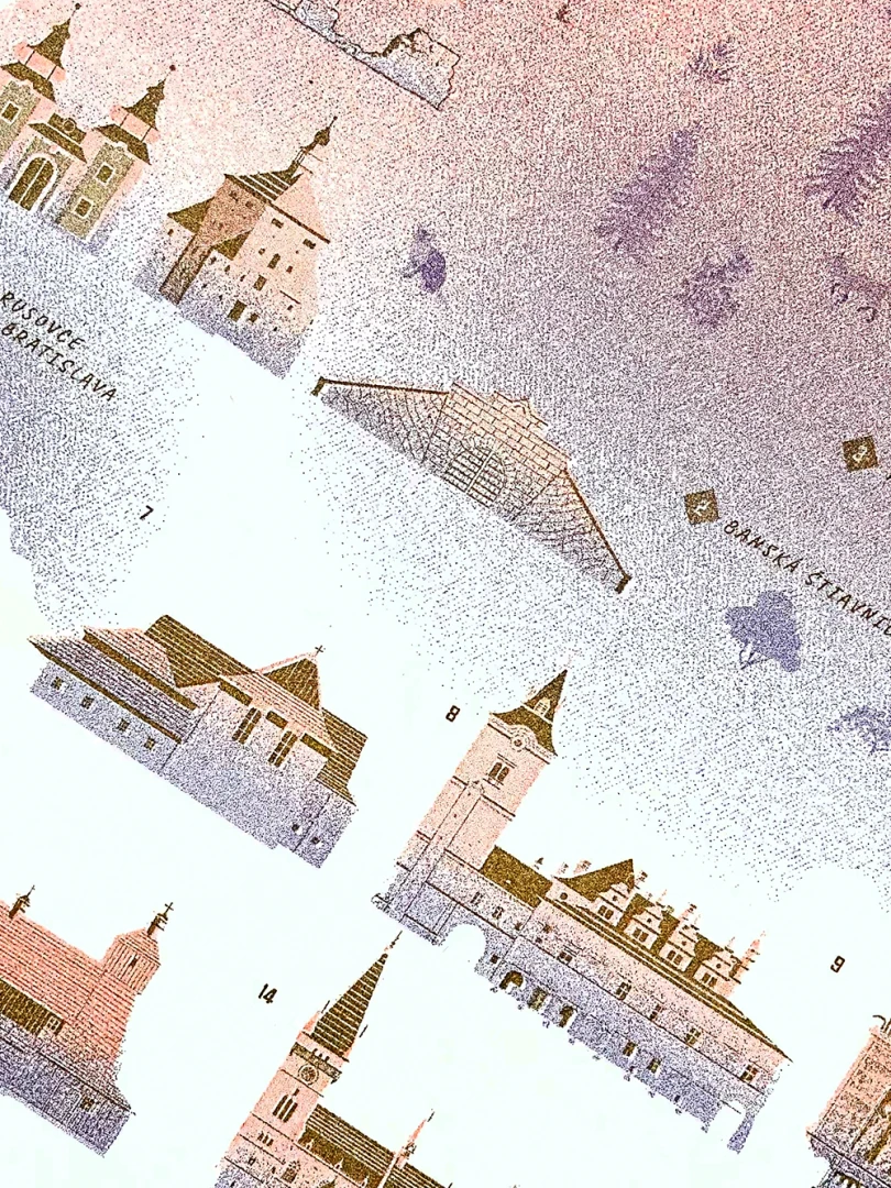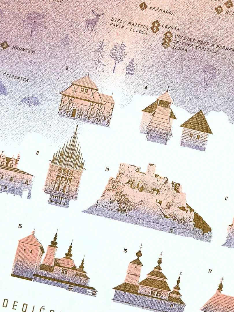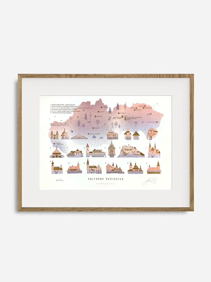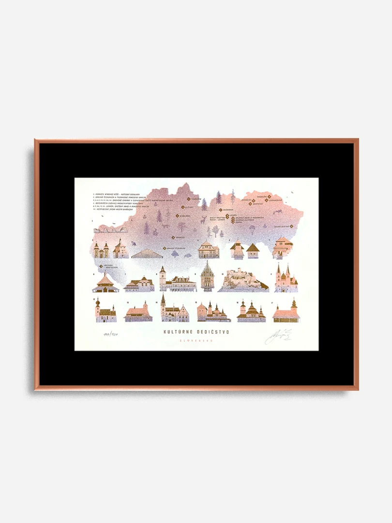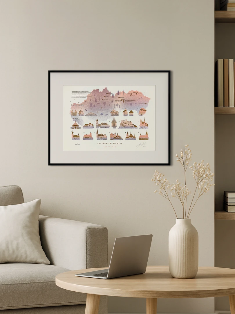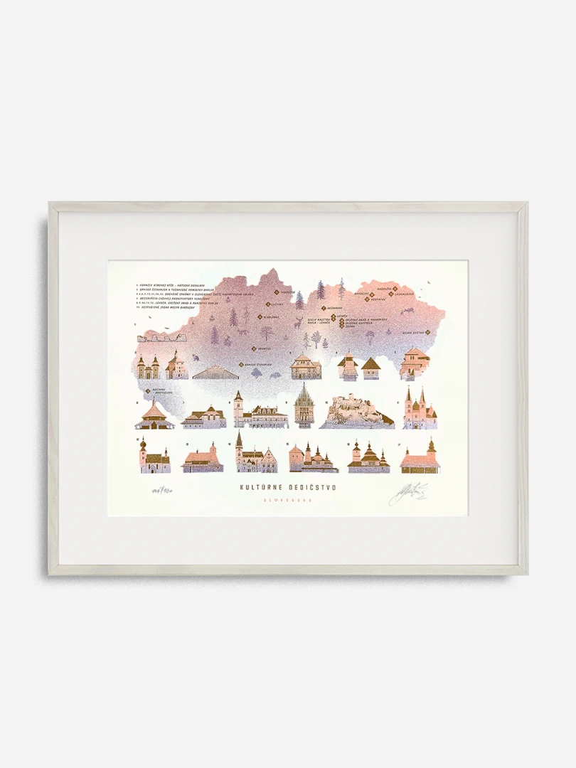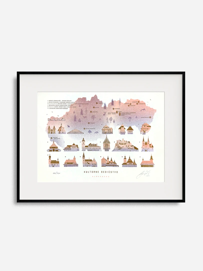 Tento print zachytáva najvýznamnejšie kultúrne miesta Slovenska, ktoré formovali podobu krajiny a miest v priebehu storočí. Každé z nich predstavuje inú vrstvu dejín, architektúry a identity. Historické mestá Bardejov, Banská Štiavnica a Levoča dokumentujú vývoj mestského života od stredoveku. Námestia, kostoly, radnice, hradby a technické stavby ukazujú prepojenie obchodu, viery a remesiel. Dielo Majstra Pavla v Levoči patrí k najvýznamnejším umeleckým prejavom tohto obdobia. Spišský hrad s okolím tvorí rozsiahly historický celok. Spolu so Spišskou Kapitulou, Spišským Podhradím a Žehrou vytvára krajinu, kde sa architektúra prirodzene spája s terénom. Drevené kostoly Karpát predstavujú tradičnú sakrálnu architektúru regiónov východného a severného Slovenska. Zastúpené sú stavby v Bodružali, Hervartove, Hronseku, Kežmarku, Ladomirovej, Leštinách, Ruskej Bystrej a Tvrdošíne. Každá z nich nesie silnú miestnu identitu a remeselnú tradíciu. Vlkolínec dopĺňa tento obraz ako zachovaná horská osada s pôvodnou zástavbou. Súčasťou výberu je aj antická Gerulata v Rusovciach, významná rímska vojenská stavba, ktorá dokladá najstaršie vrstvy osídlenia na území dnešnej Bratislavy. Spolu tieto miesta vytvárajú prehľad kultúrnych ikon Slovenska a mapu jeho historickej pamäte v koncentrovanej podobe.