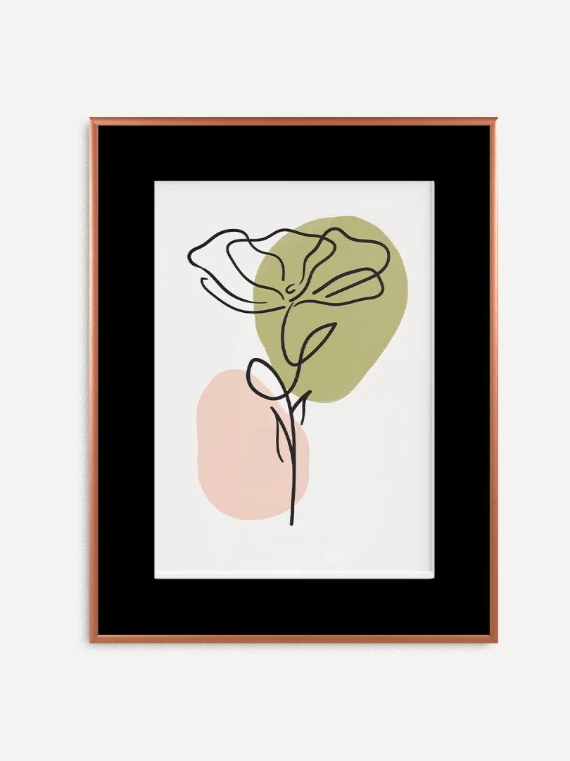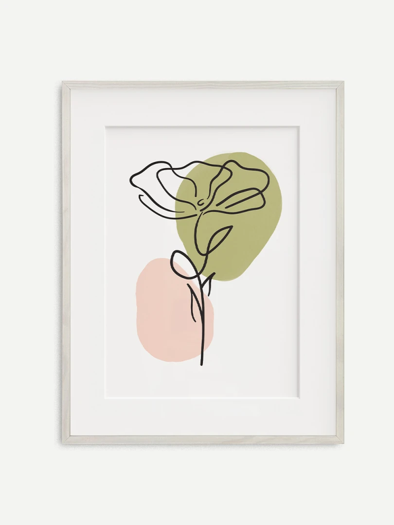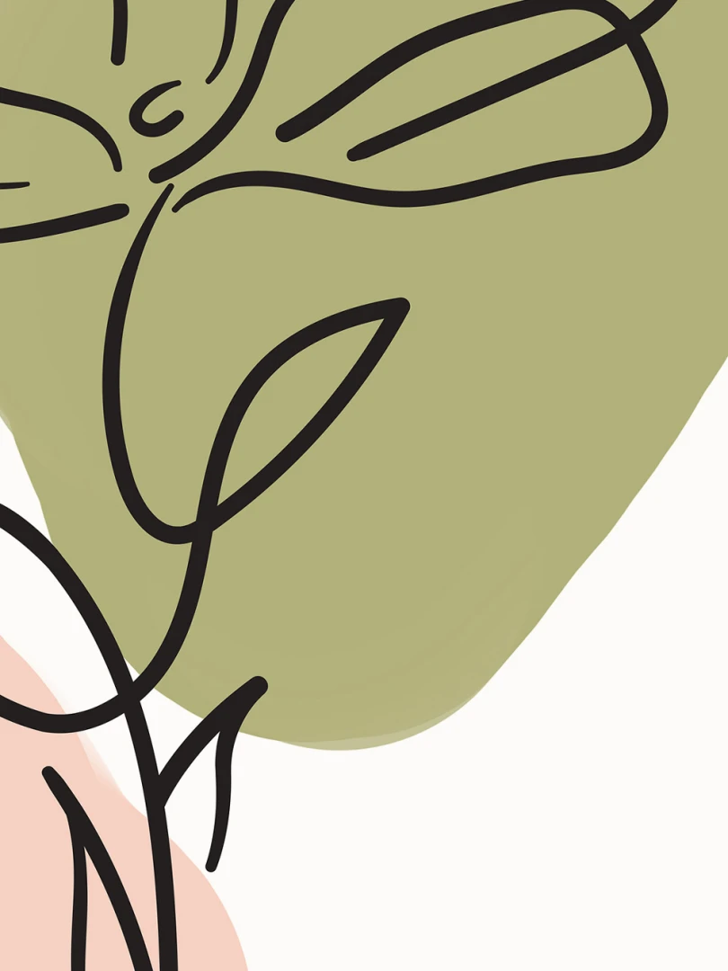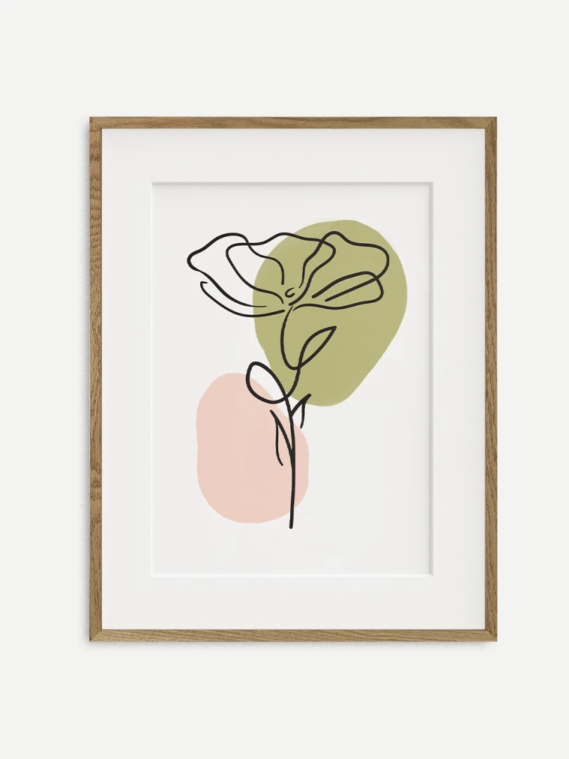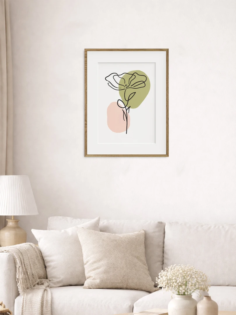 Tento print zobrazuje kvet vytvorený jednou plynulou líniou. Minimalistická kresba je doplnená jemnými farebnými plochami, ktoré podčiarkujú tvar bez toho, aby ho preťažili. Motív pôsobí vyvážene, čisto a nadčasovo. Ilustrácia pracuje s jednoduchosťou línie a prirodzenou eleganciou rastlinného tvaru. Vďaka redukovanej farebnosti a abstrahovanému spracovaniu sa hodí do moderných aj škandinávsky ladených interiérov.
