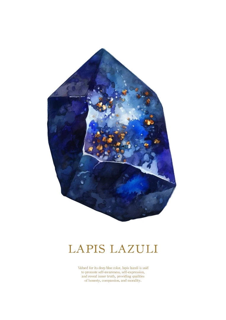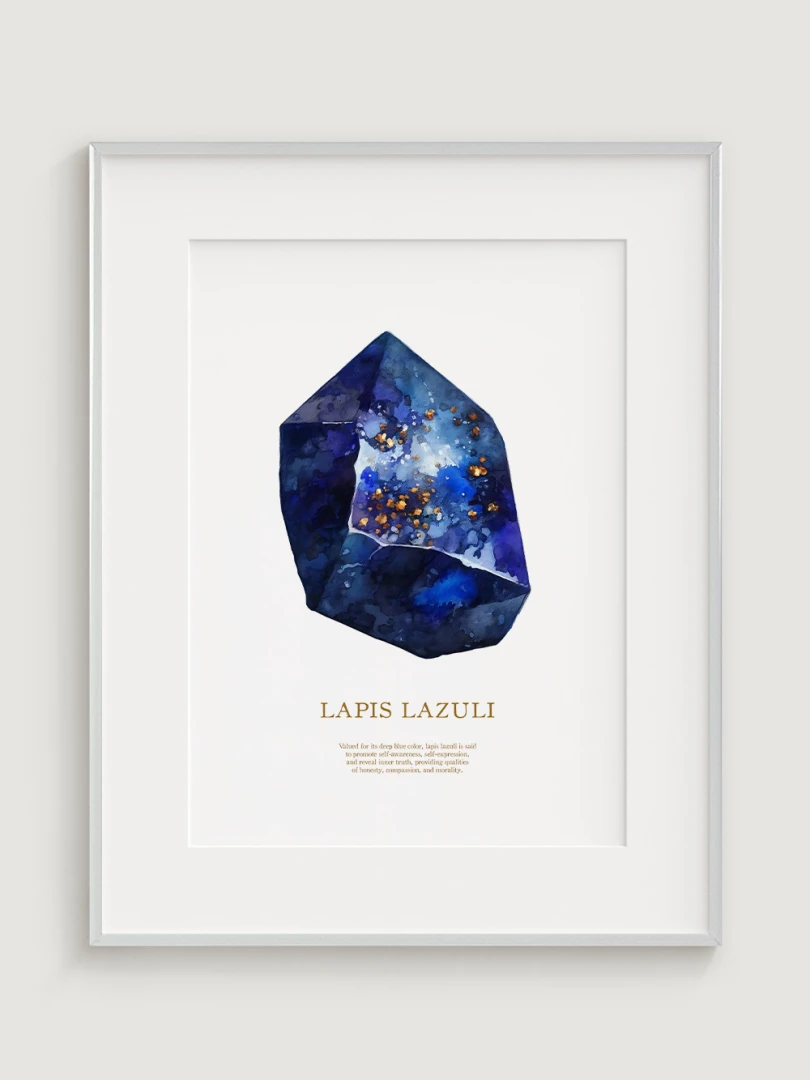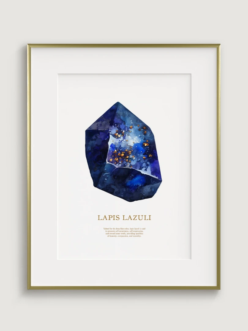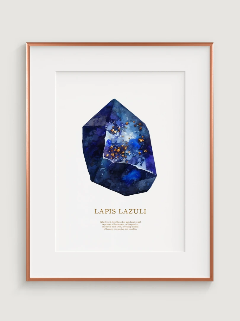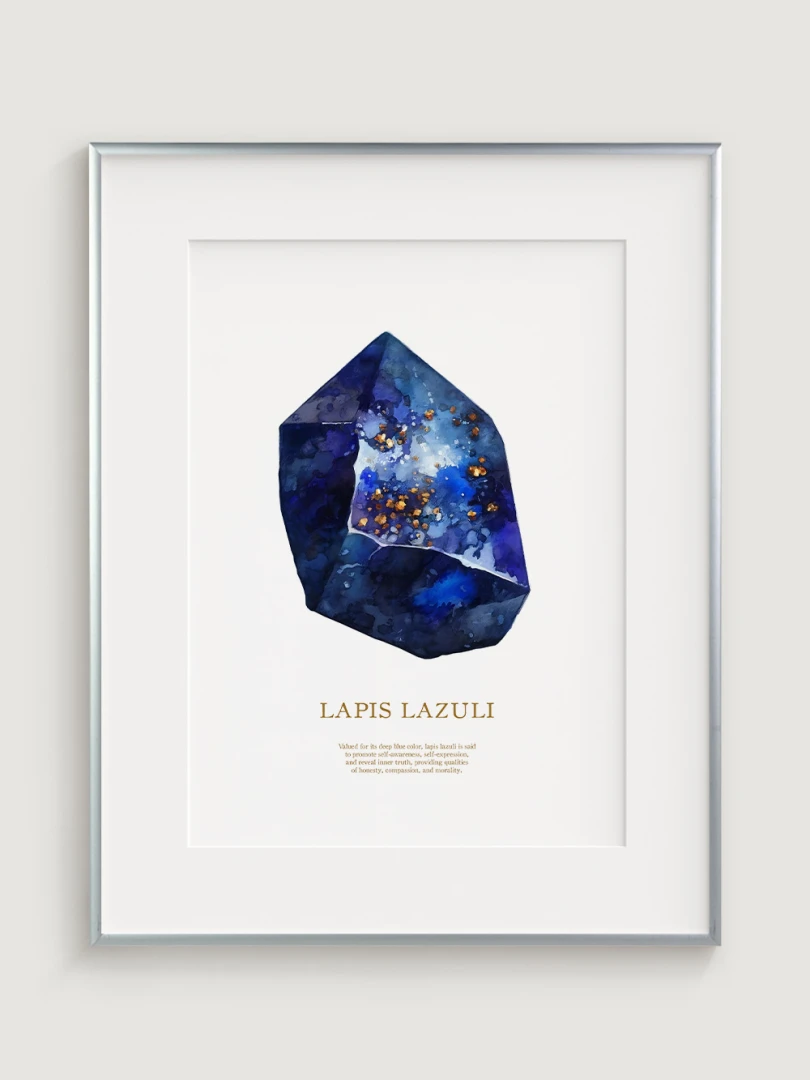 Lapis Lazuli je od staroveku oceňovaný pre svoju schopnosť podporovať pokoj a vnútorné osvietenie, a tento print na to krásne nadväzuje. S jeho bohatou textúrou a tajomnou atmosférou je ideálny na pridanie sofistikovanej a inšpirujúcej atmosféry do akéhokoľvek priestoru. Perfektný ako darček pre milovníkov kameňov alebo ako štýlový doplnok do modernej domácnosti.