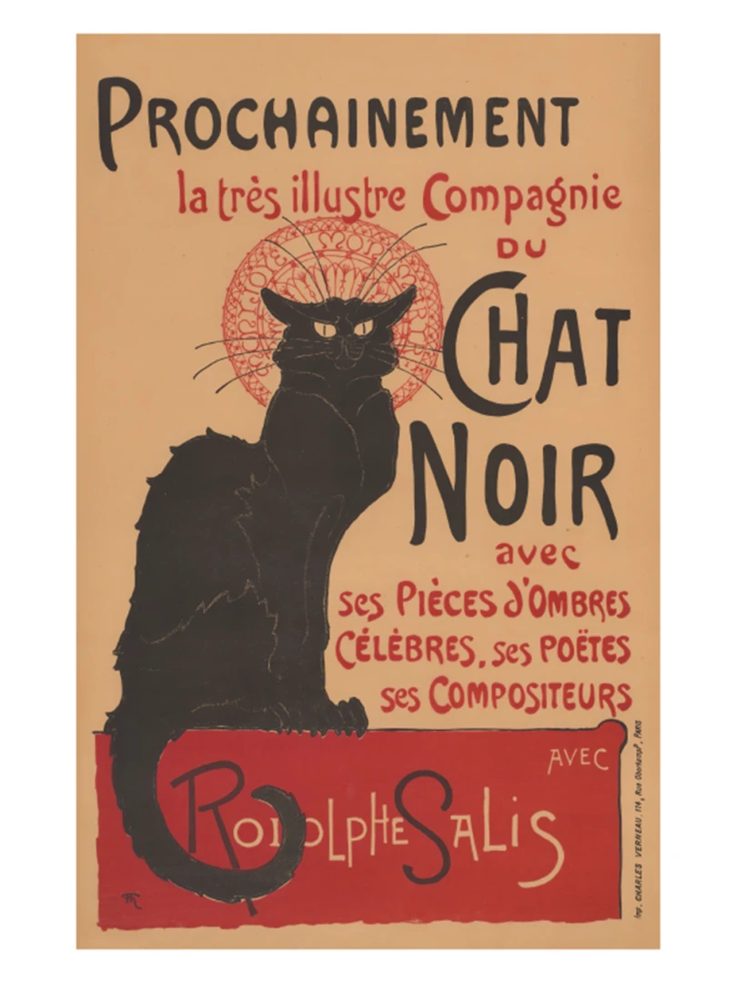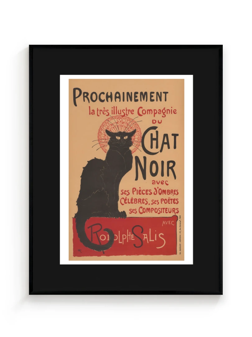 Tento print vychádza z legendárneho plagátu Prochainement la très illustre Compagnie du Chat Noir, ktorý v roku 1896 vytvoril francúzsky maliar a ilustrátor Théophile Alexandre Steinlen. Dielo vzniklo ako reklama pre umeleckú skupinu a kabaret Le Chat Noir v Montmartri - symbol bohémskeho Paríža na prelome 19. a 20. storočia. Tajomný čierny kocúr s intenzívnym pohľadom, posadený na okraji červenej plochy, sa stal ikonou francúzskeho fin de siècle.