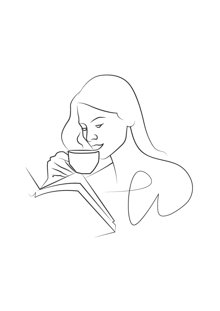 Tento kúsok využíva jednoduché, čisté línie na zobrazenie postavy ženy, ktorej tvár je zjemnená tichým úsmevom, keď drží šálku blízko seba, čo naznačuje moment tichého zamyslenia alebo pokojnej prestávky v jej dni.