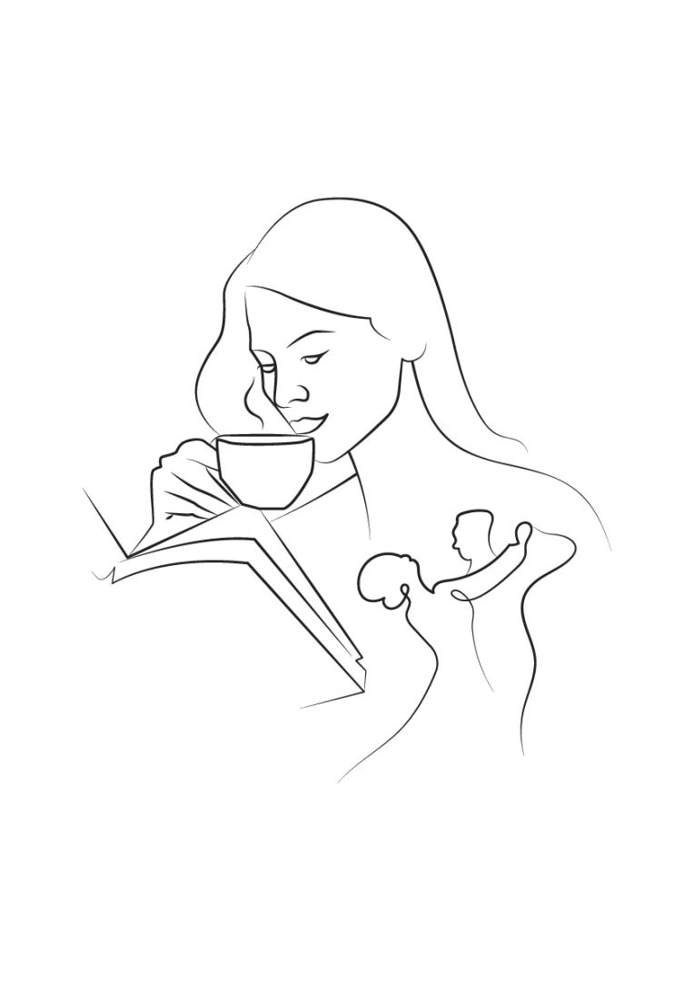 Tento kúsok využíva jednoduché, čisté línie na zobrazenie postavy ženy, ktorej tvár je zjemnená tichým úsmevom, keď drží šálku blízko seba, čo naznačuje moment tichého zamyslenia alebo pokojnej prestávky v jej dni.