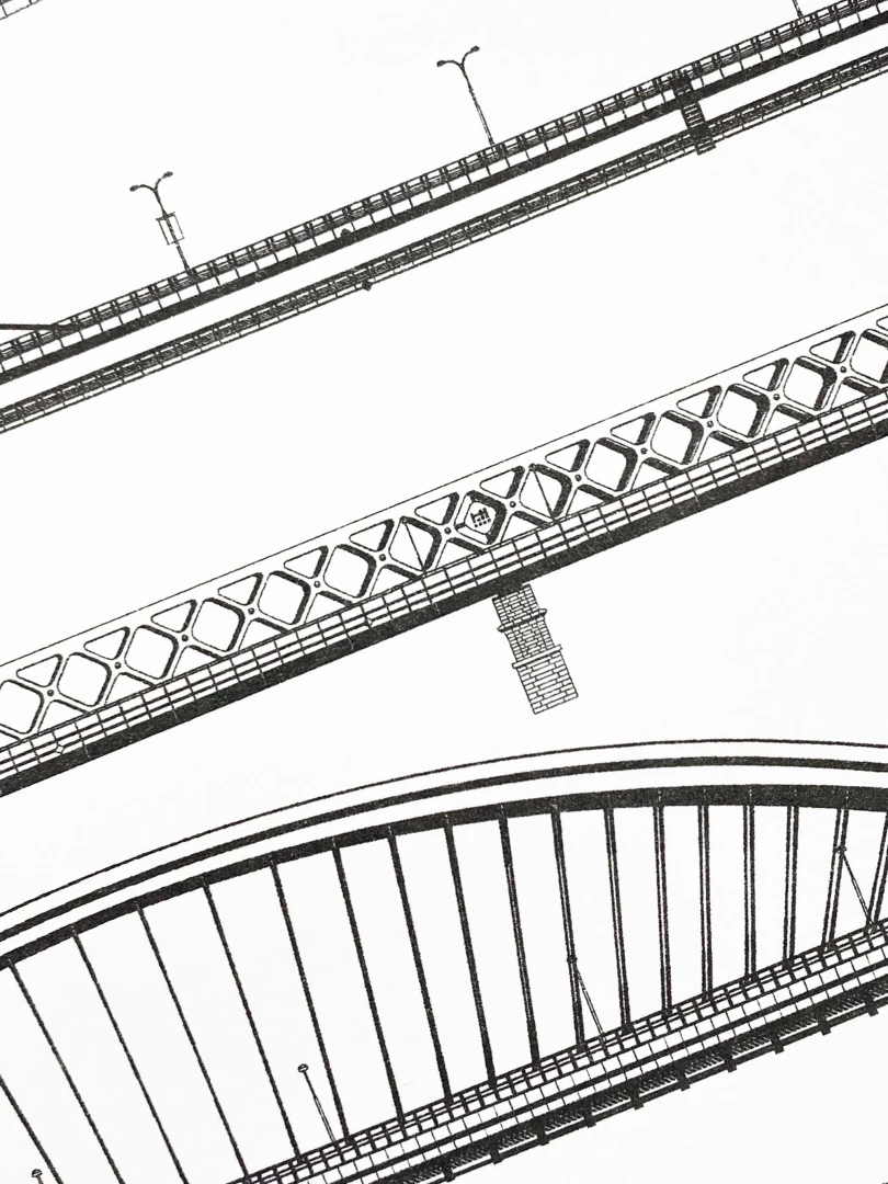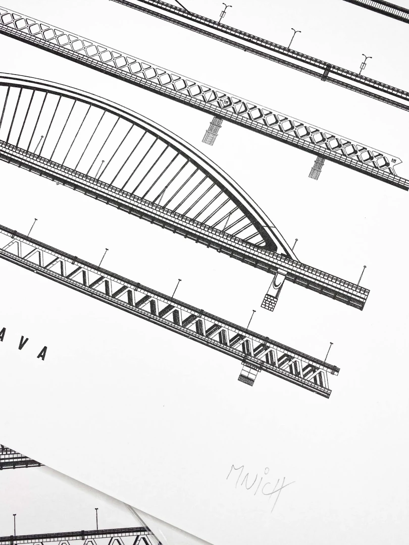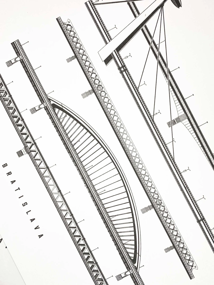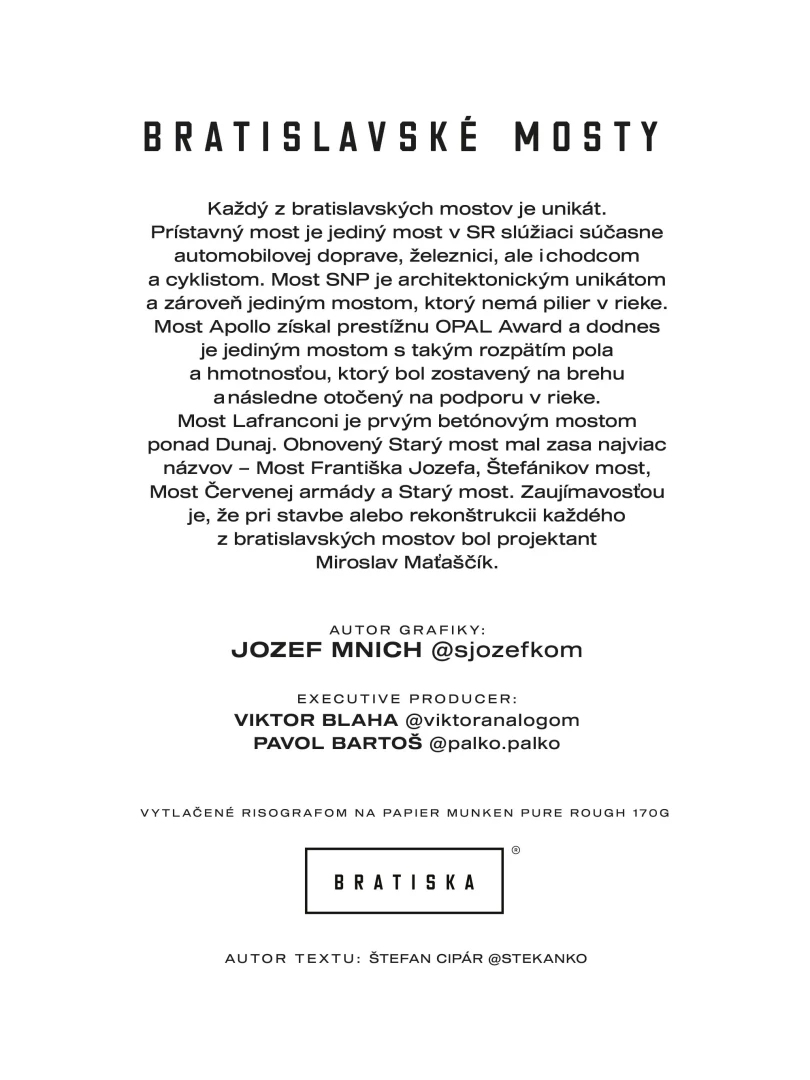 Každý z bratislavských mostov je unikát. Prístavný most je jediný most v SR slúžiaci súčasne automobilovej doprave, železnici, ale i chodcom a cyklistom. Most SNP je architektonickým unikátom a zároveň jediným mostom, ktorý nemá pilier v rieke. Most Apollo získal prestížnu OPAL Award a dodnes je jediným mostom s takým rozpätím pola a hmotnosťou, ktorý bol zostavený na brehu a následne otočený na podporu v rieke. Most Lafranconi je prvým betónovým mostom ponad Dunaj. Obnovený Starý most mal zasa najviac názvov – Most Františka Jozefa, Štefánikov most, Most Červenej armády a Starý most. Zaujímavosťou je, že pri stavbe alebo rekonštrukcii každého z bratislavských mostov bol projektant Miroslav Maťaščík. — Autor textu: Štefan Cipár — Autor printu: Jozef Mnich — Formát printu: A3 — Náklad: limitovaný počet 200ks (Dotlače nebudeme robiť.) — Vytlačené risografom na papier Munken Pure Rough 170g — Maximálne 2ks na 1 objednávku.