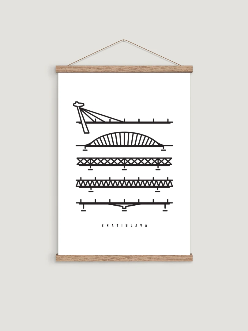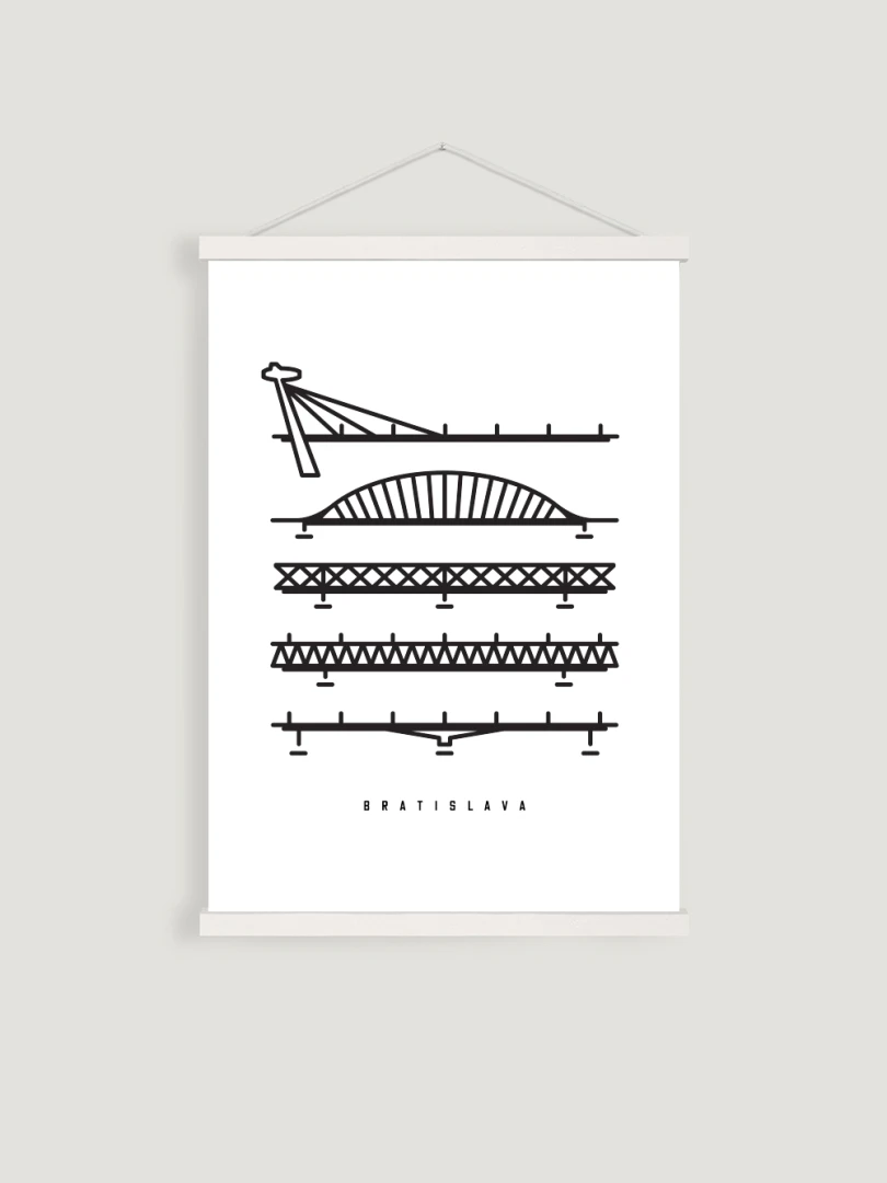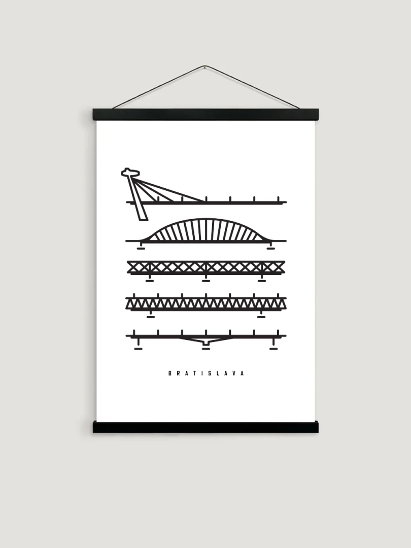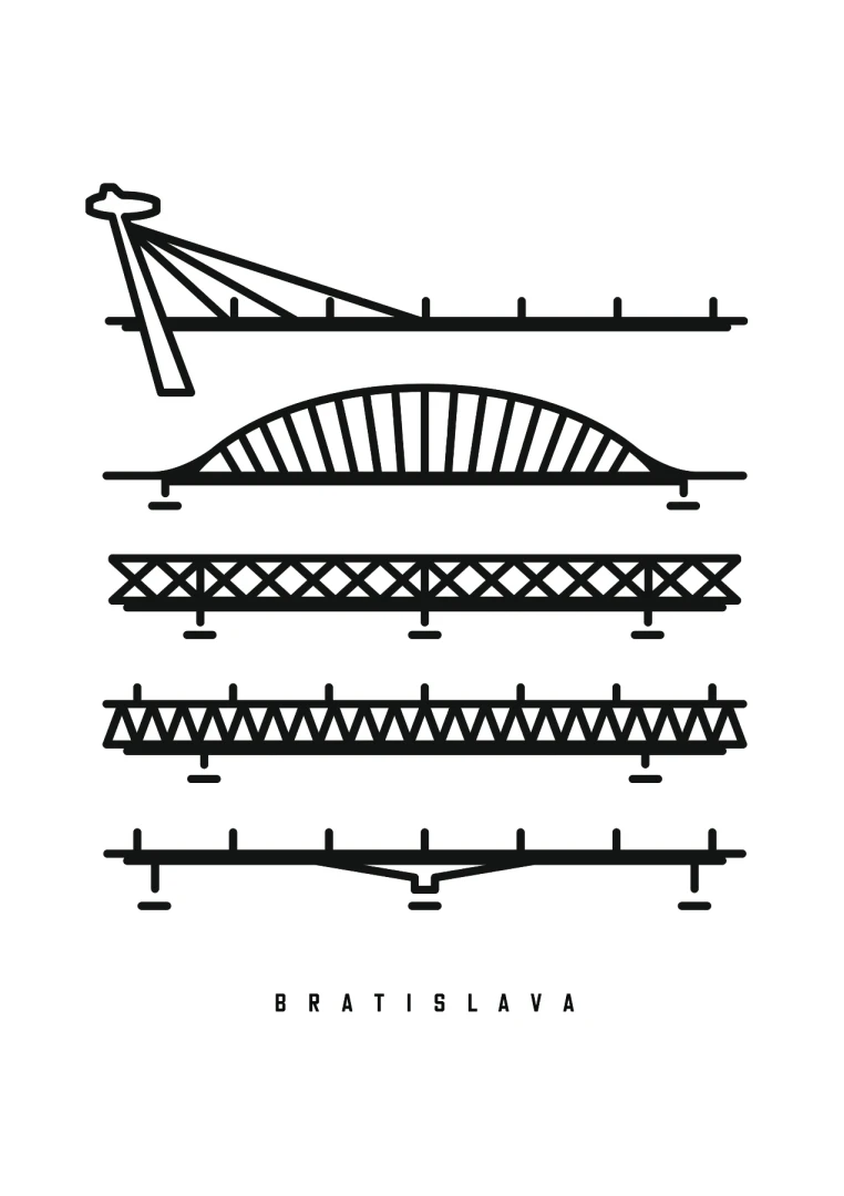 Tento jedinečný print zobrazuje najikonickejšie mosty mesta, každý vykreslený v čistom minimalistickom štýle, ktorý zachytáva ich charakteristické siluety na jasnom, nenáročnom pozadí. Použitím ostrých čiernych línií na kvalitnom papieri táto potlač zdôrazňuje štrukturálnu krásu a dizajn rôznych mostov, od moderného Mosta Apollo po historický Starý most, každý z nich je znázornený s geometrickou presnosťou.