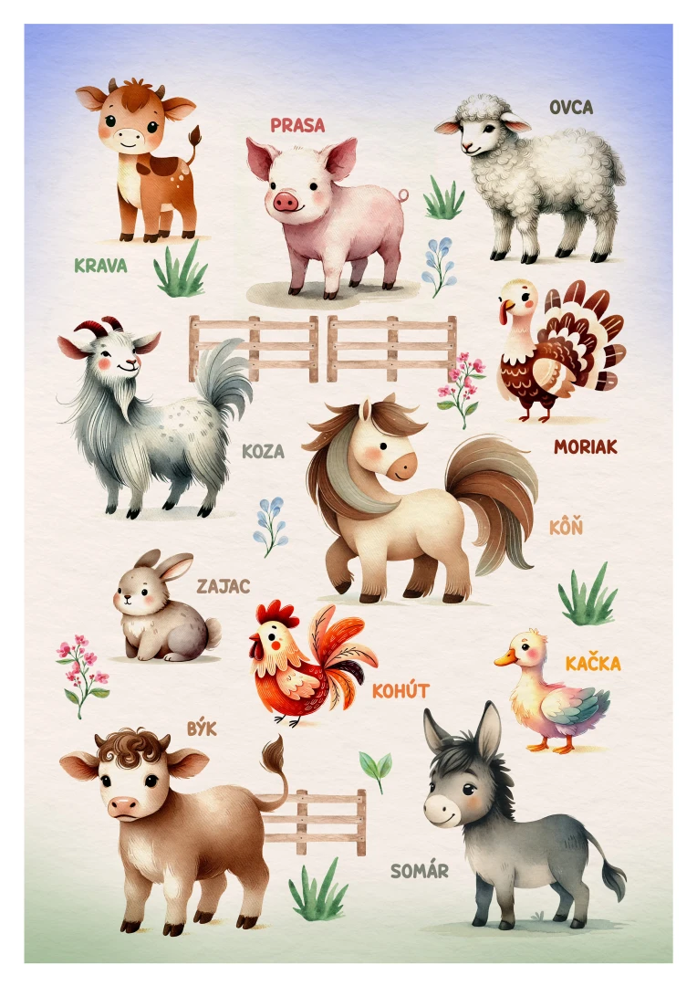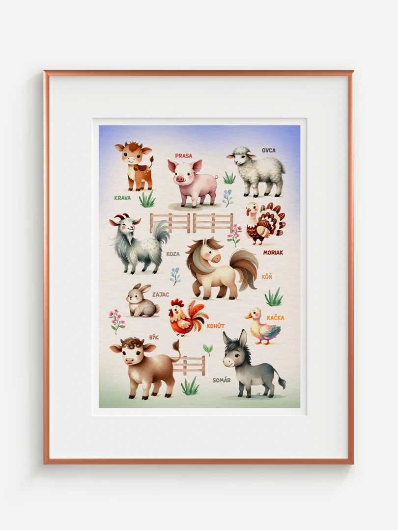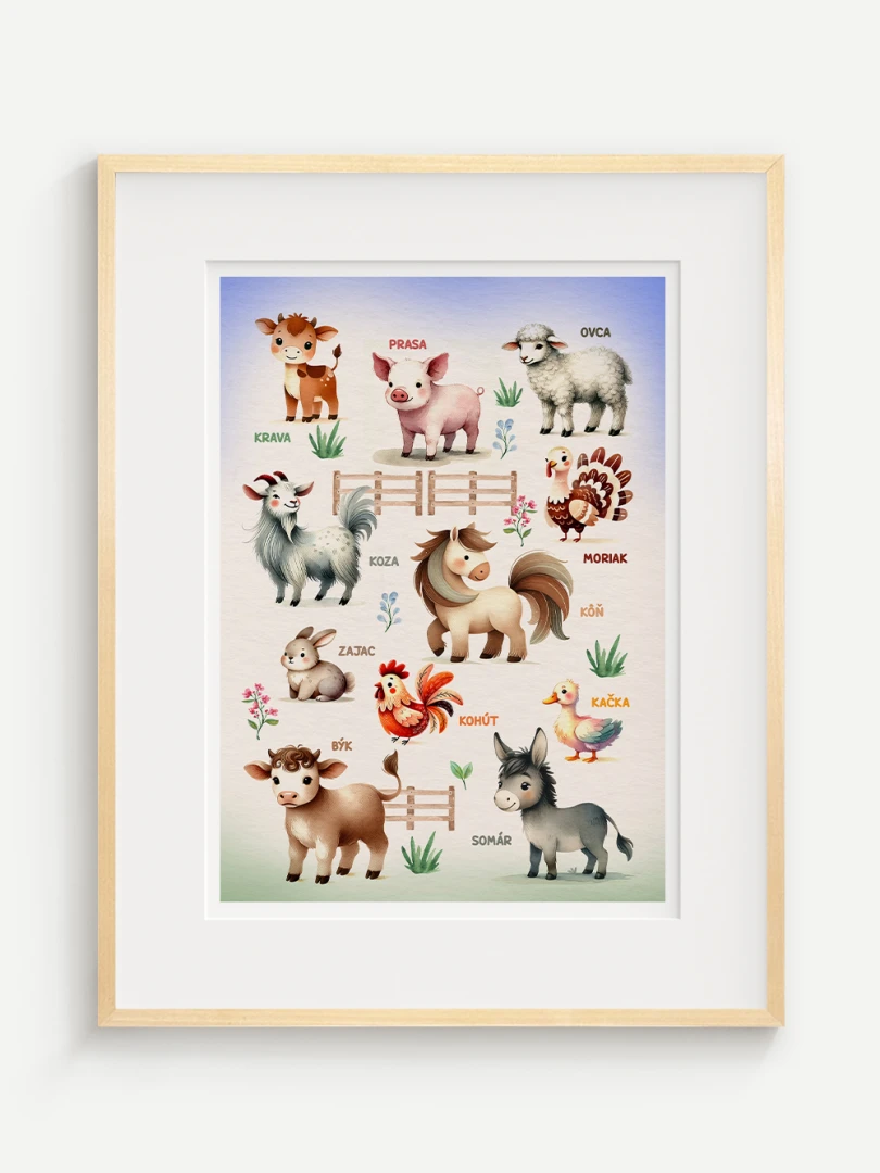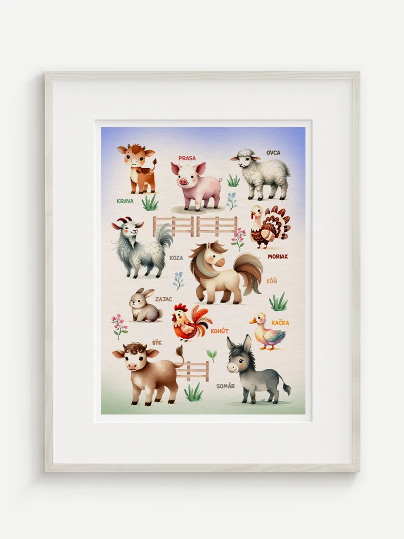 Tento očarujúci a farebný print zobrazuje život na farme plný milých hospodárskych zvieratiek, a tak deťom pomáha spoznávať rôzne druhy zvierat zábavným a príjemným spôsobom. Každé zvieratko je krásne ilustrované a doplnené svojím názvom v slovenčine, čo z tohto printu robí výborný vzdelávací nástroj.