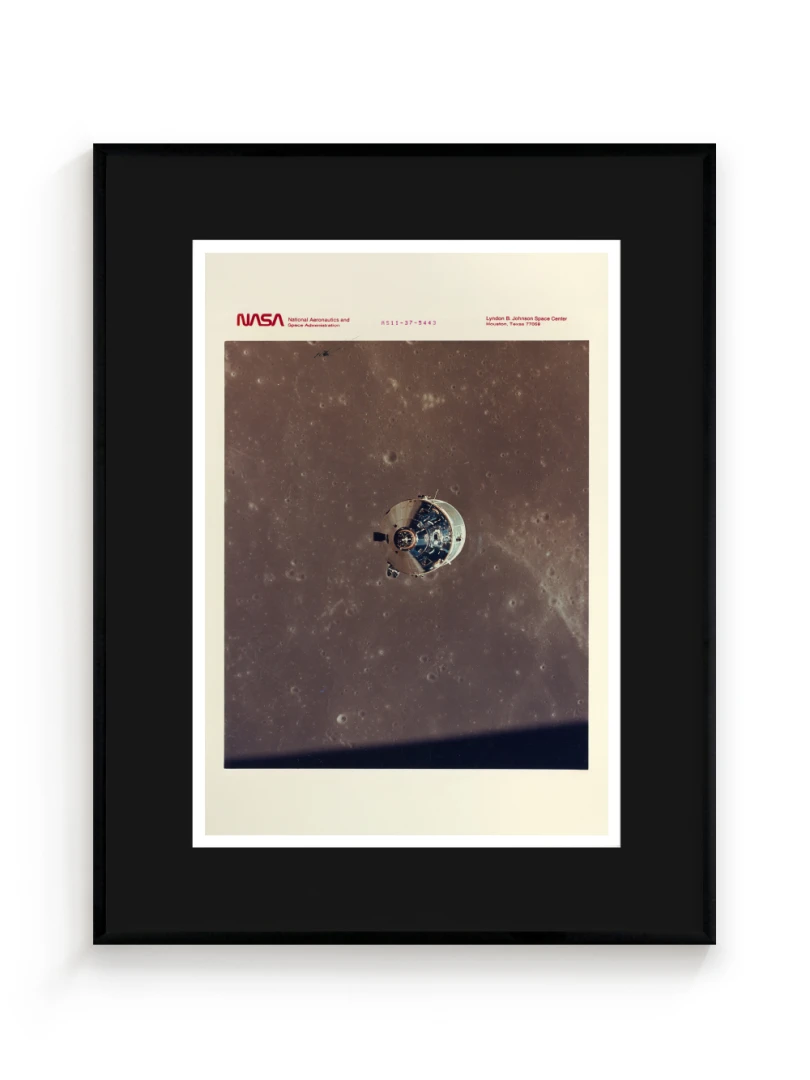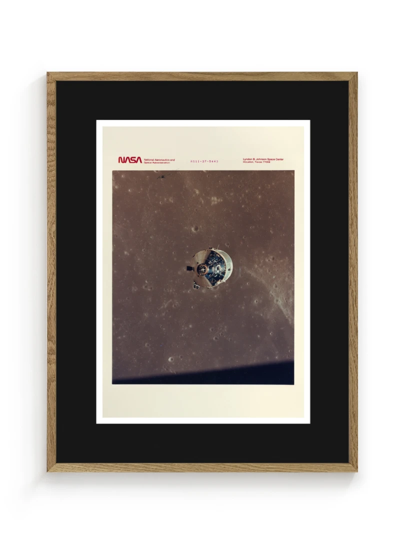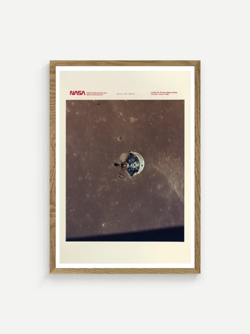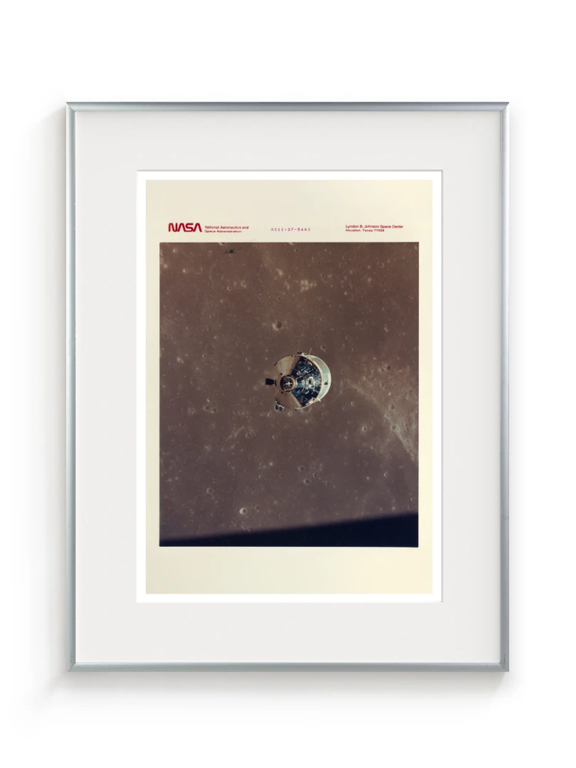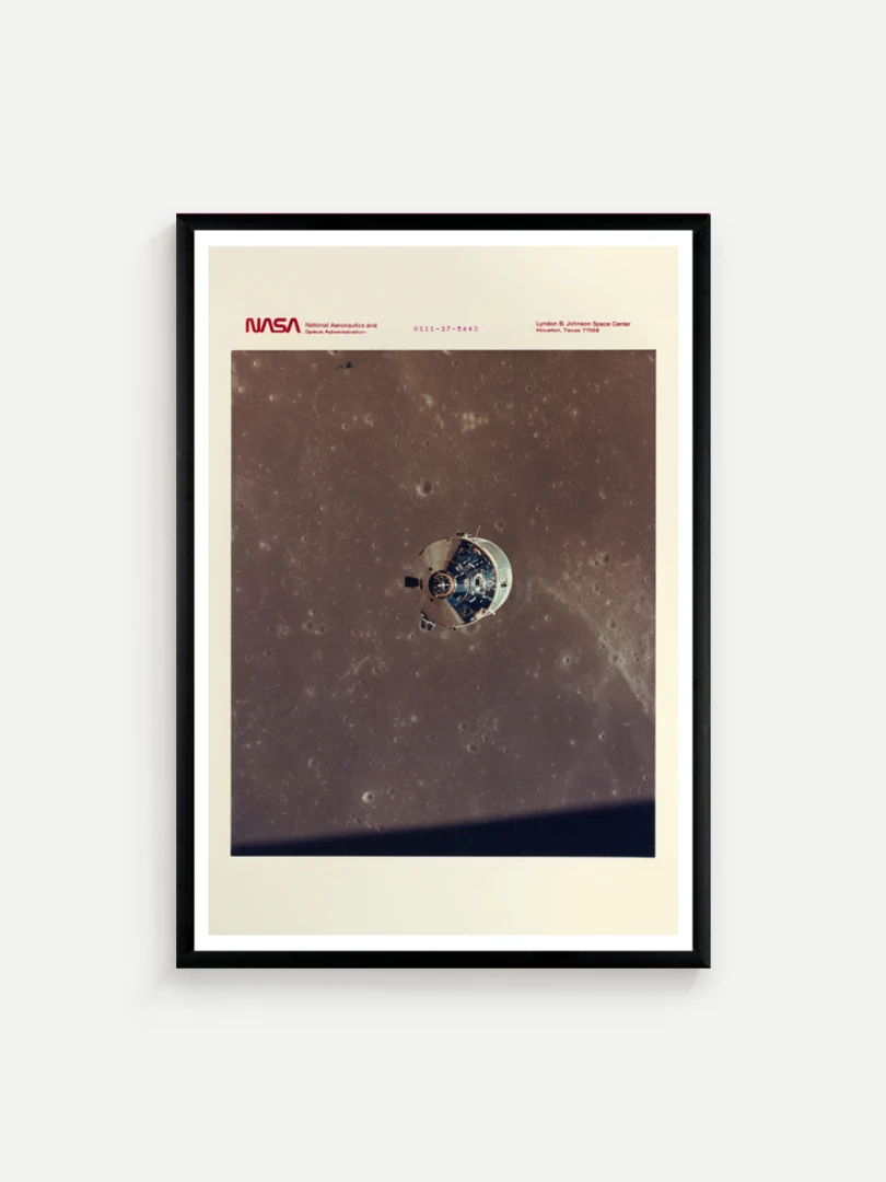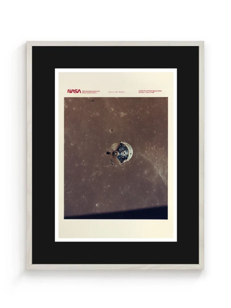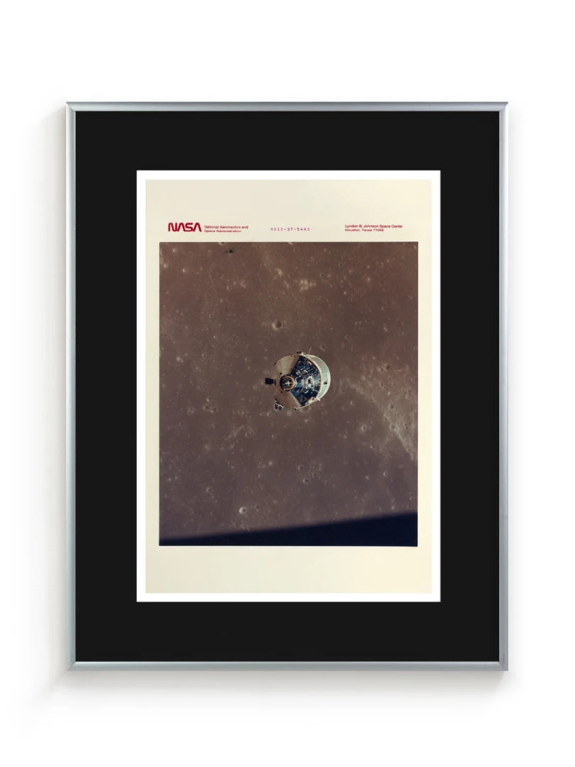 Tento print vychádza z fotografie Apollo 11 Command and Service Modules Photographed from the Lunar Module in Orbit, ktorú v roku 1969 vytvorila americká vesmírna agentúra NASA. Zobrazuje veliteľský a servisný modul misie Apollo 11, ako boli zachytené z lunárneho modulu na obežnej dráhe Mesiaca. Fotografia bola vytvorená počas historickej misie, ktorá prvýkrát dopravila ľudí na Mesiac. Tento konkrétny záber zachytáva moduly v priestore, s čiernym pozadím vesmíru, čo zdôrazňuje ich izoláciu a technologickú vyspelosť.