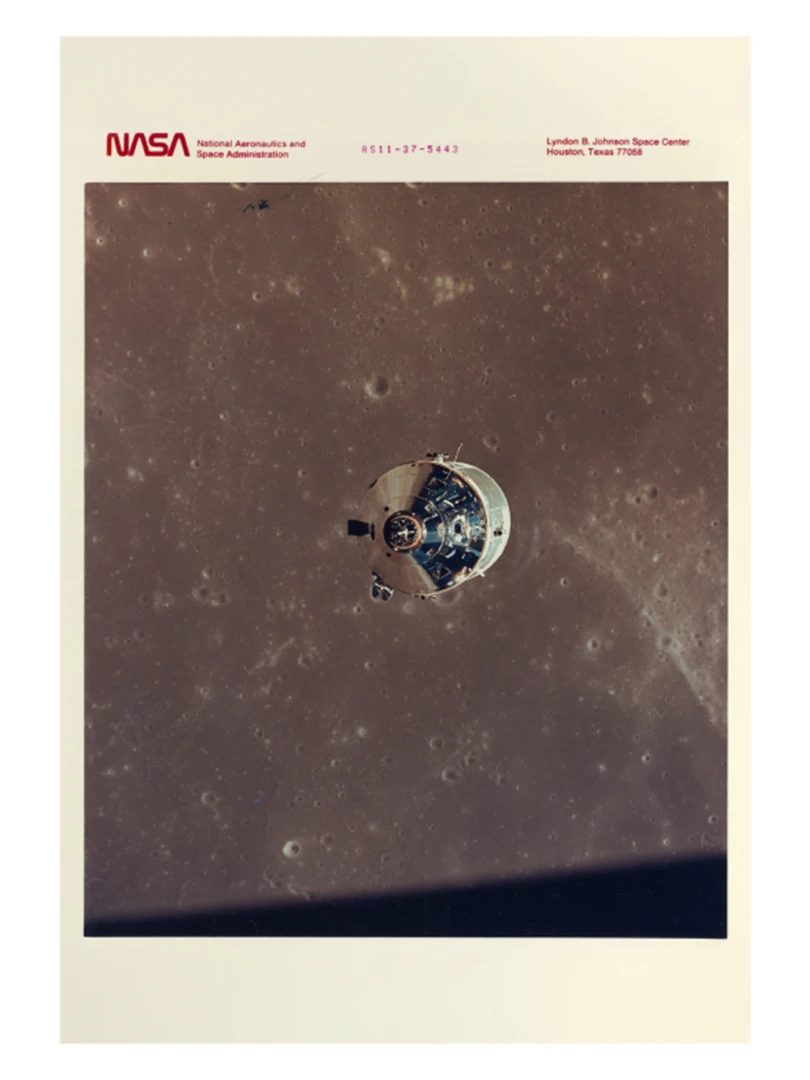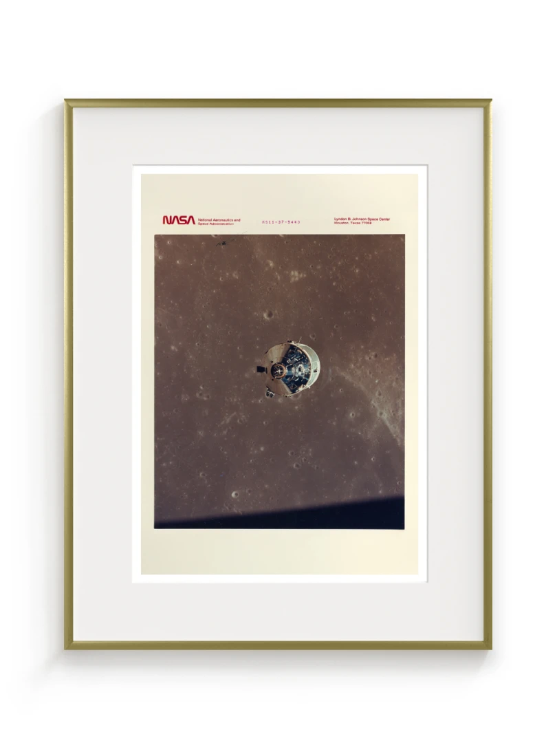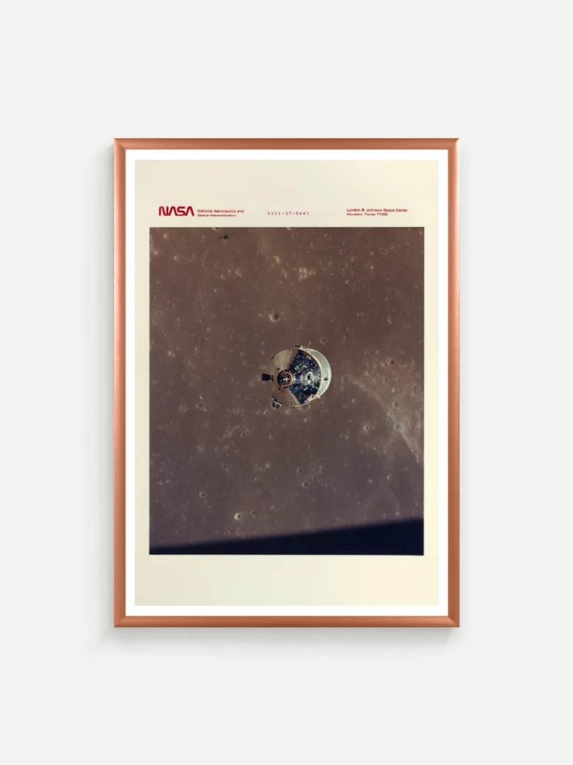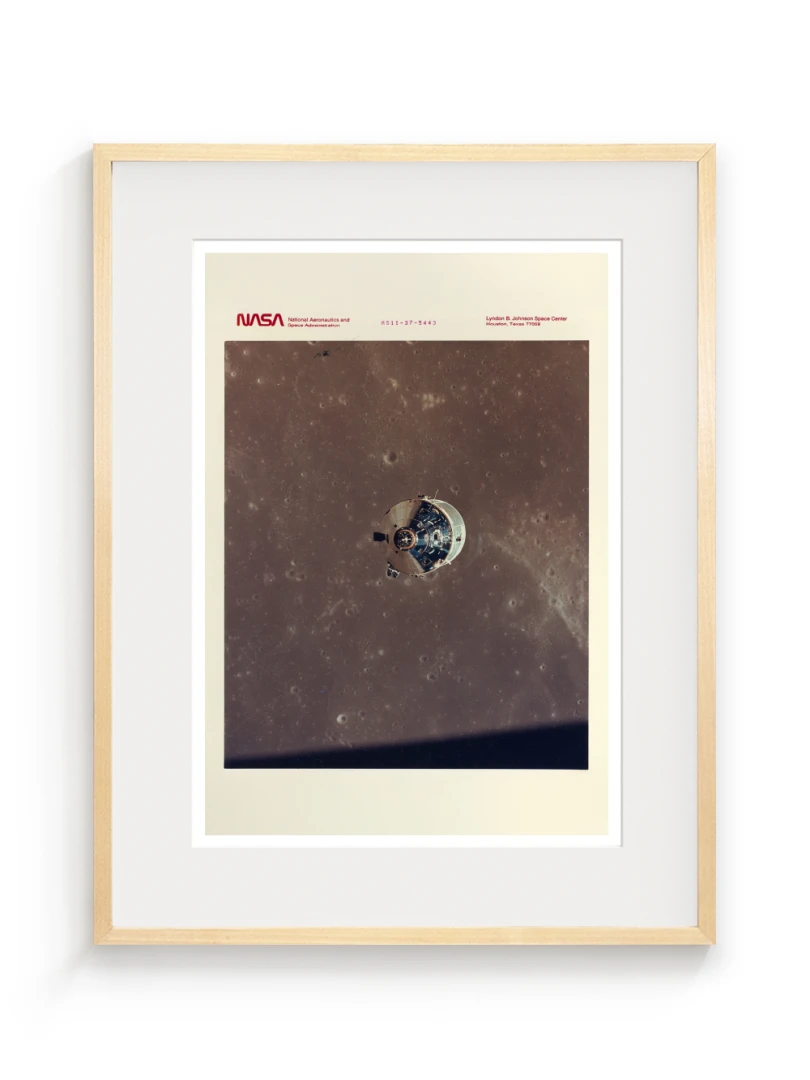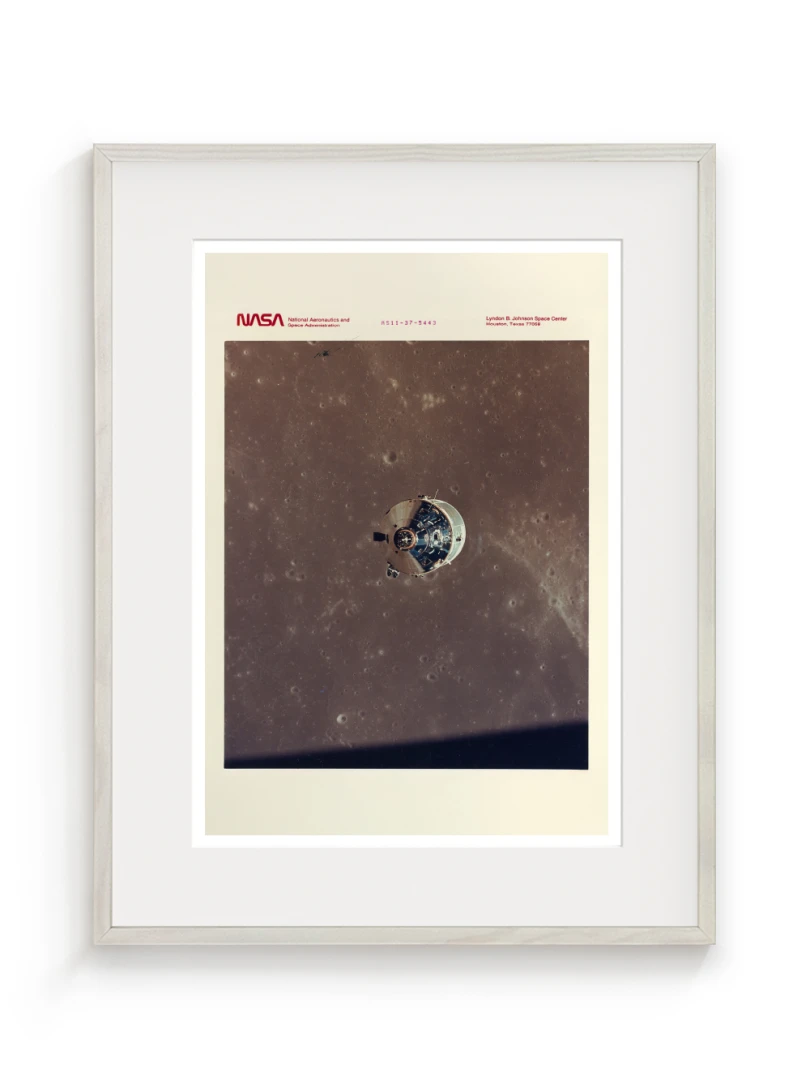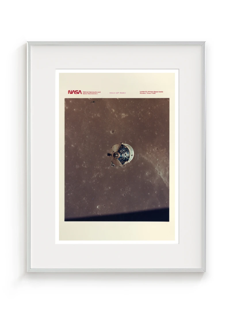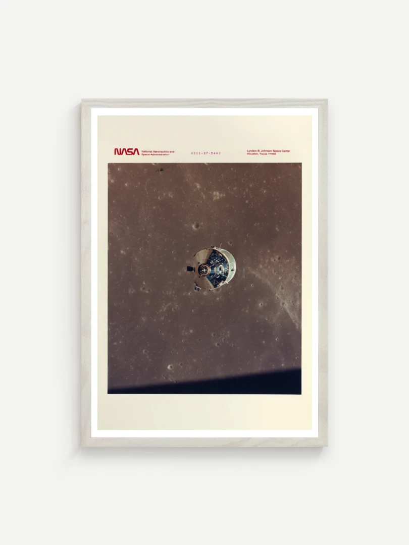 Tento print vychádza z fotografie Apollo 11 Command and Service Modules Photographed from the Lunar Module in Orbit, ktorú v roku 1969 vytvorila americká vesmírna agentúra NASA. Zobrazuje veliteľský a servisný modul misie Apollo 11, ako boli zachytené z lunárneho modulu na obežnej dráhe Mesiaca. Fotografia bola vytvorená počas historickej misie, ktorá prvýkrát dopravila ľudí na Mesiac. Tento konkrétny záber zachytáva moduly v priestore, s čiernym pozadím vesmíru, čo zdôrazňuje ich izoláciu a technologickú vyspelosť.