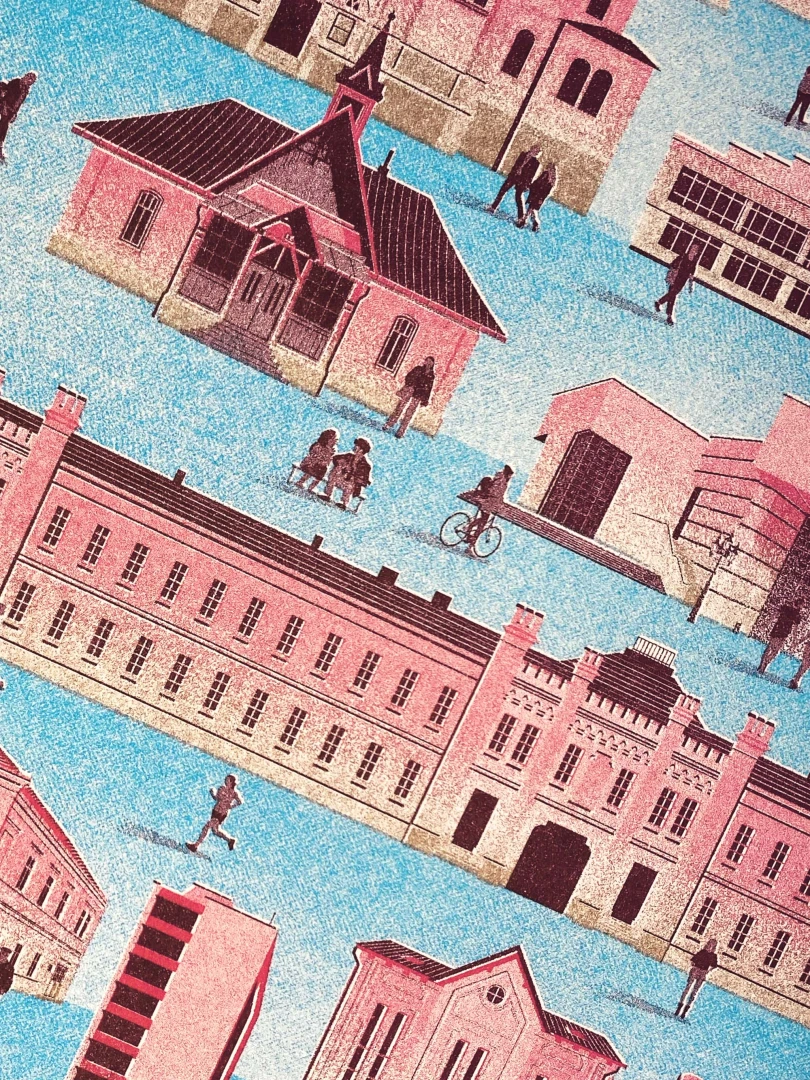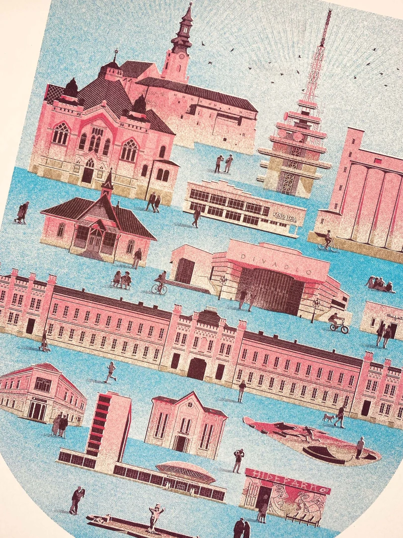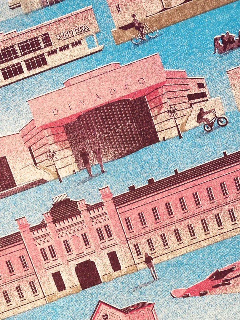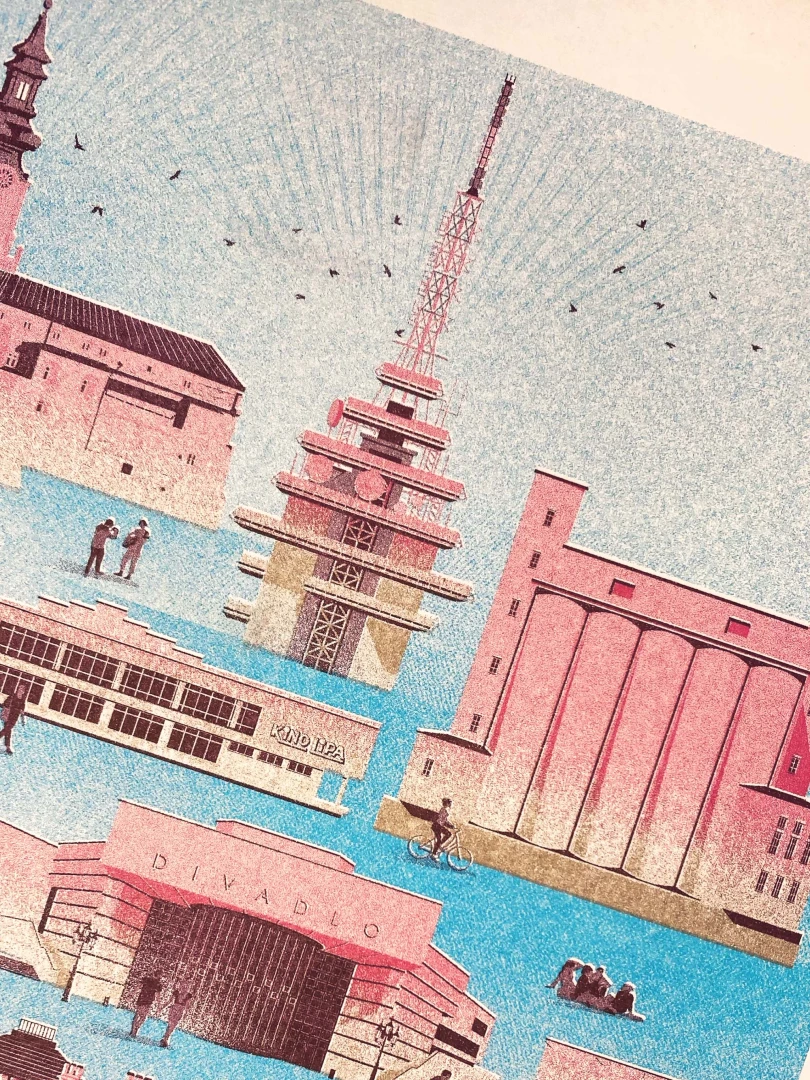 Prvá zmienka o Nitre sa datuje na rok 828, archeologické nálezy však dokazujú, že oblasť bola husto osídlenou už pred 30 000 rokmi. V dobách Veľkej Moravy, kedy tu sídlilo knieža Pribina, bolo mesto pod Zoborom významným centrom ríše. Počtom obyvateľov piate najväčšie mesto na Slovensku sa pýši mnohými pamätihodnosťami, medzi ktoré bezpochyby patria Nitriansky hrad, synagóga, Trafačka, či aula SPU od Vladimíra Dedečka. Medzi kultové miesta, známe aj za hranicami mesta, radíme Divadlo Andreja Bagara, Hidepark, vysielač Zobor, ale i skatepark Klokočina. Panorámu Nitry tvorí Sedem pahorkov: Zobor, Hradná skala, Vŕšok, Kalvária, Borina, Ľupka a Martinský vrch. — Autor textu: Štefan Cipár — Autor printu: Marek Ciesarík — Formát printu: A3 — Náklad: limitovaný počet 200ks (Dotlače nebudeme robiť.) — Vytlačené risografom na papier Munken Pure Rough 170g — Maximálne 2ks na 1 objednávku.