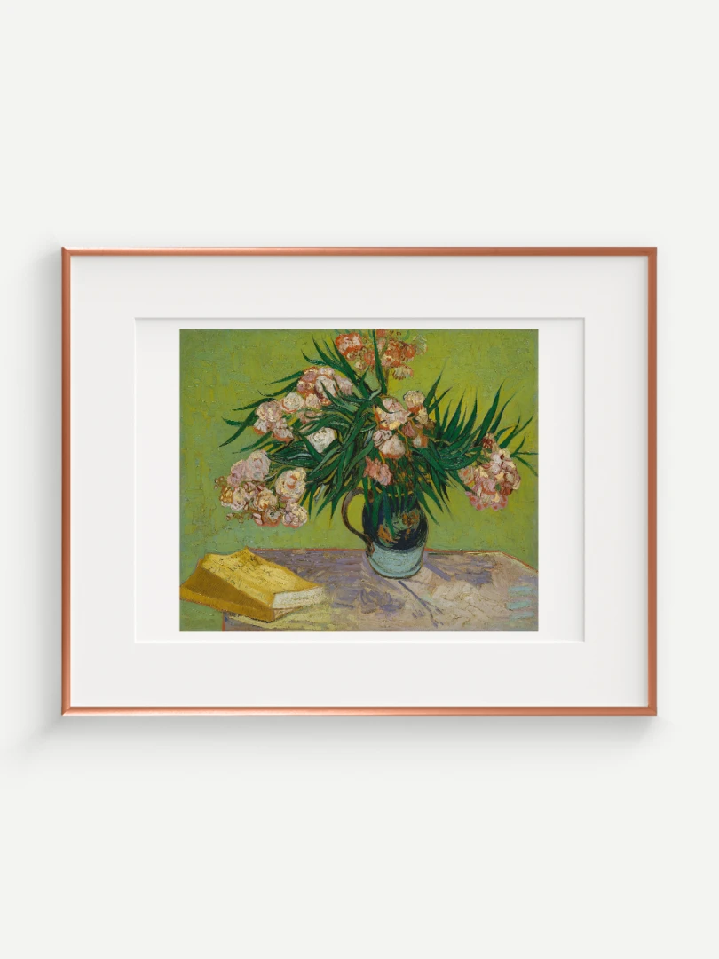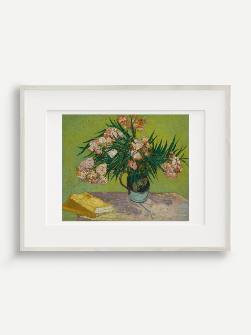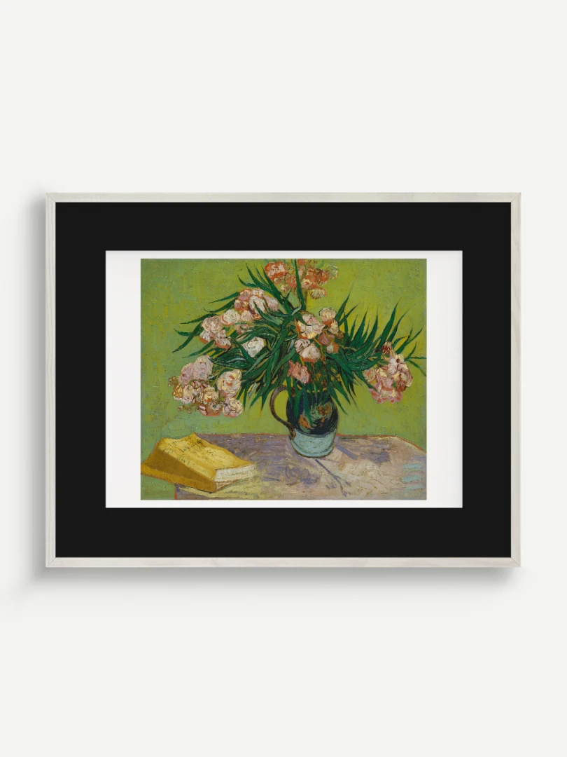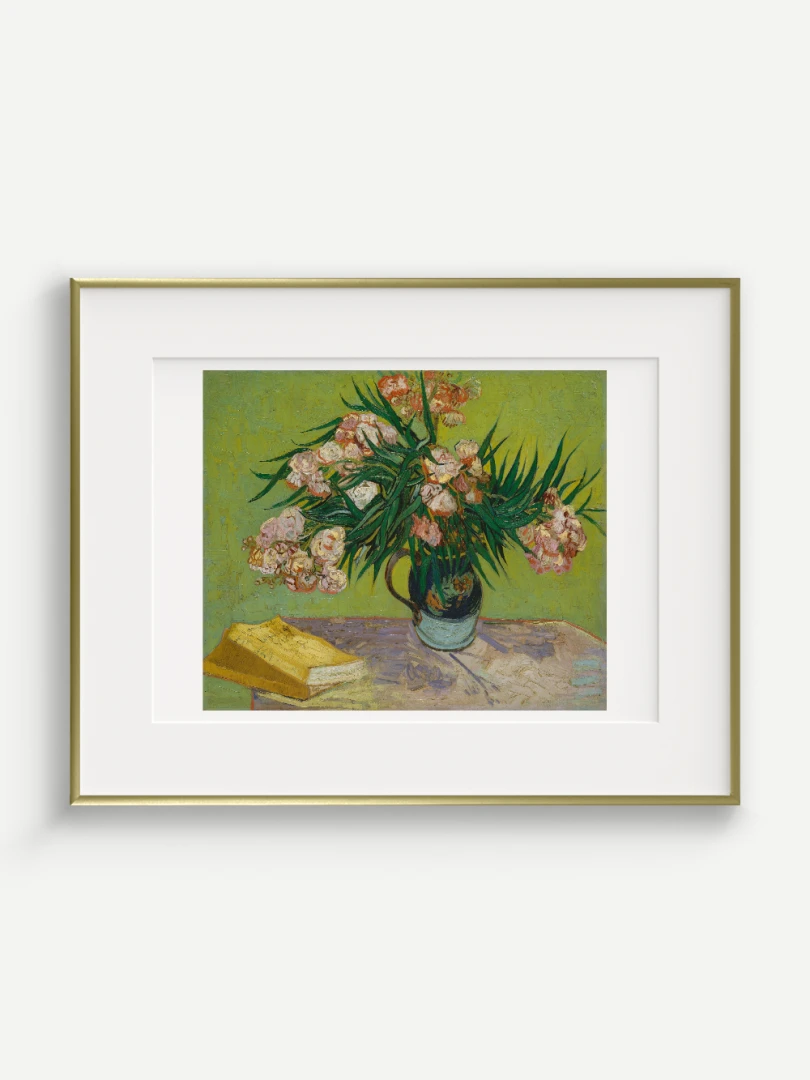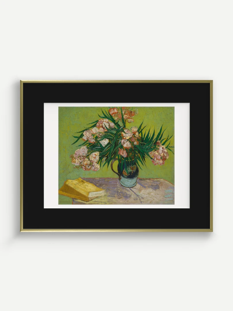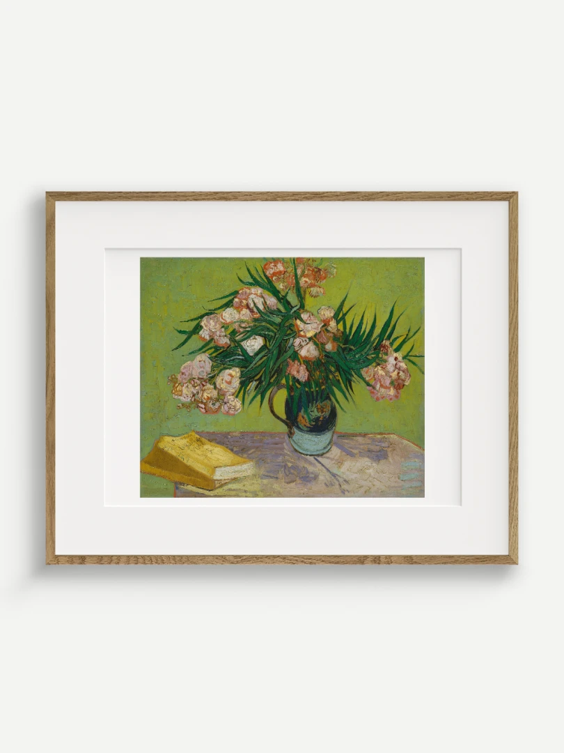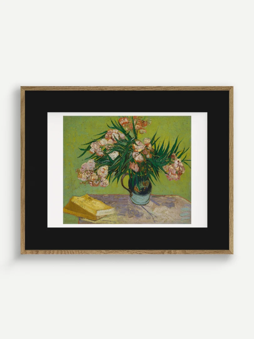 Tento žiarivý print Oleandrov (Oleanders) vychádza z diela, ktoré Vincent van Gogh namaľoval v auguste 1888 počas svojho pobytu v Arles. Pre Van Gogha mali oleandre špeciálny význam – vnímal ich ako kvety, ktoré prekypujú radosťou a životnou silou. Kvety, ktoré podľa neho „nekonečne kvitnú“ a neustále „vyrážajú nové výhonky“.