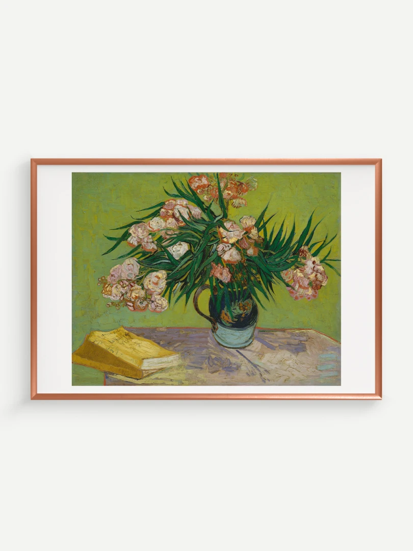 V tomto zátiší sú oleandre naaranžované v dekoratívnej majolikovej váze, ktorú Van Gogh použil aj v iných dielach z tohto obdobia. Kvety sú tu symbolicky spojené s knihou La joie de vivre od Émila Zolu – románom oslavujúcim život, ktorý Van Gogh v minulosti kontrastne postavil voči otvorenej Biblii v jednom zo svojich skorších diel. V obraze Oleandre sa však nesie tón nádeje, radosti a viery v obnovu.