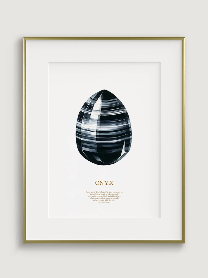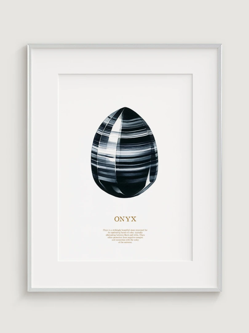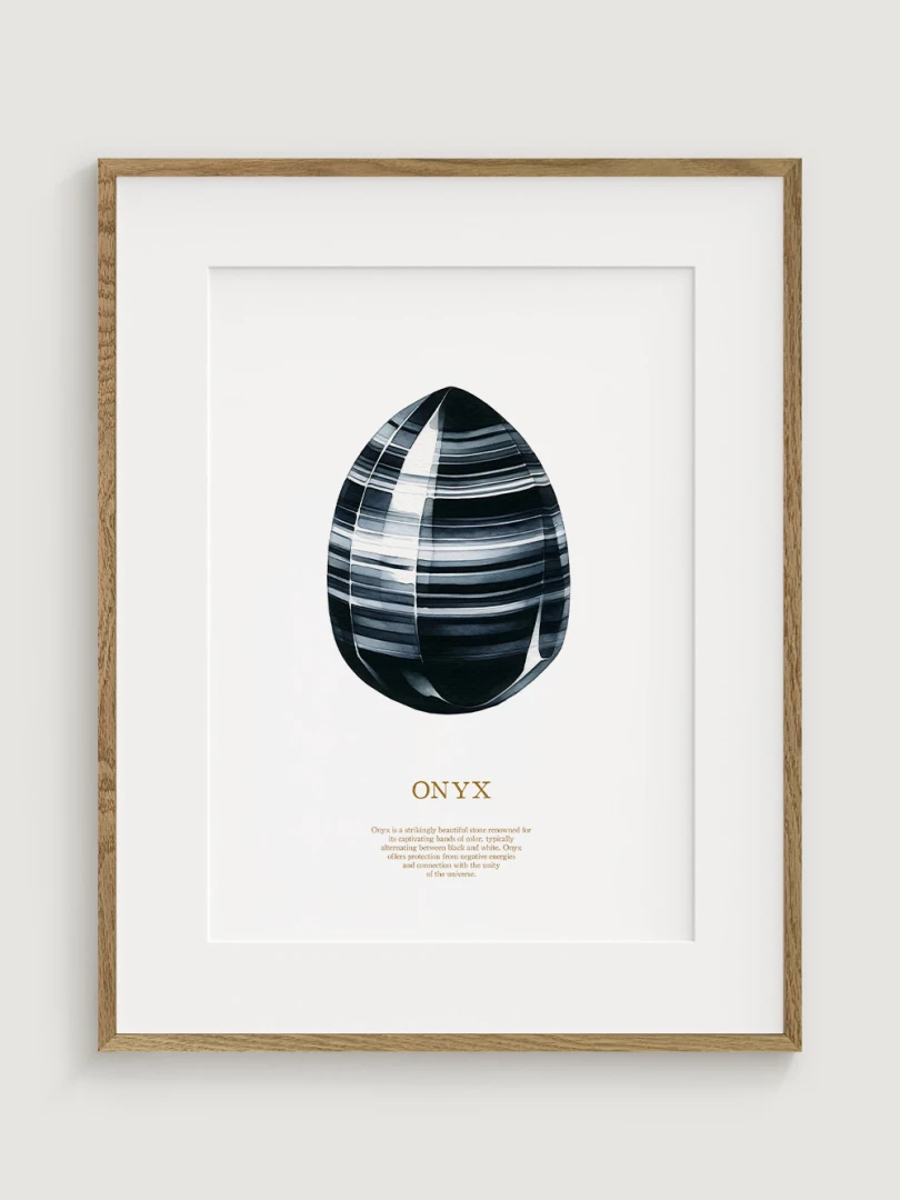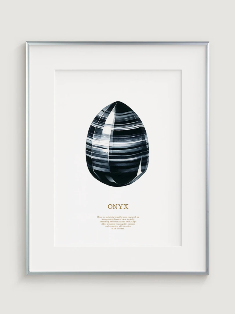 Onyx je známy svojím lesklým, čiernym vzhľadom a striedajúcimi sa bielymi pruhmi, dlho oslavovaný pre svoju estetickú príťažlivosť a metafyzické vlastnosti, symbolizujúc silu a stabilitu.