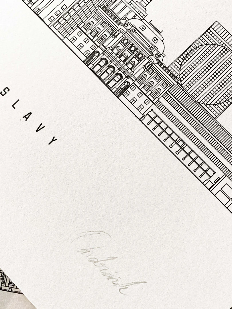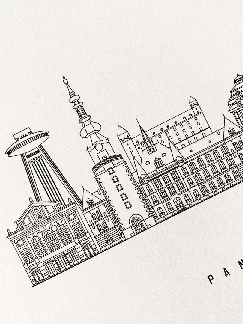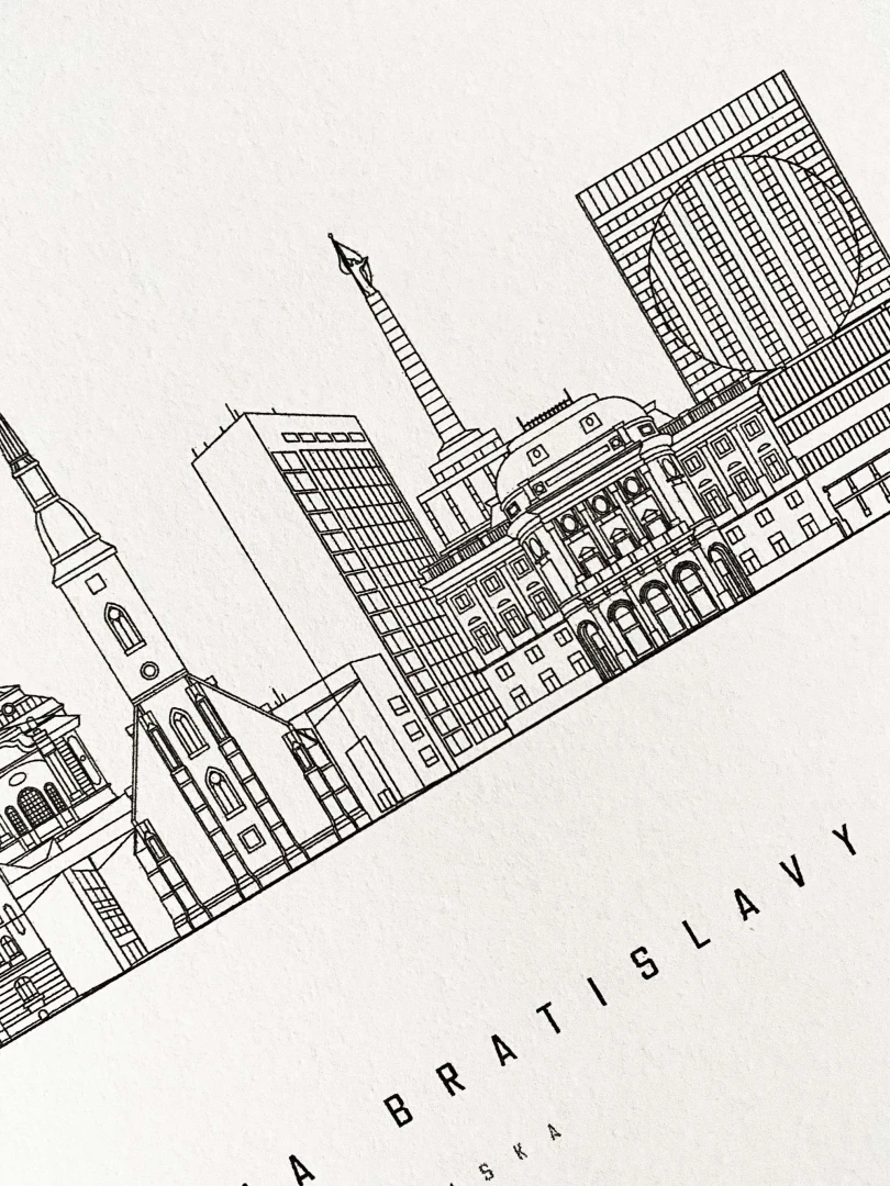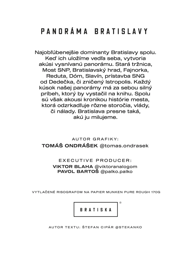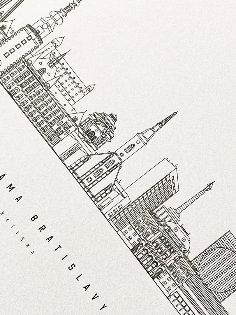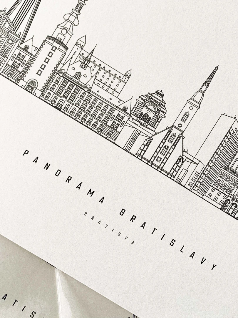 Najobľúbenejšie dominanty Bratislavy spolu. Keď ich uložíme vedľa seba, vytvoria akúsi vysnívanú panorámu. Stará tržnica, Most SNP, Bratislavský hrad, Fajnorka, Reduta, Dóm, Slavín, prístavba SNG od Dedečka, či zničený Istropolis. Každý kúsok našej panorámy má za sebou silný príbeh, ktorý by vystačil na knihu. Spolu sú však akousi kronikou histórie mesta, ktorá odzrkadľuje rôzne storočia, vlády, či nálady. Bratislava presne taká, akú ju milujeme. — Autor textu: Štefan Cipár — Autor printu: Tomáš Ondrášek — Formát printu: A3 — Náklad: limitovaný počet 100ks (Dotlače nebudeme robiť.) — Vytlačené risografom na papier Munken Pure Rough 170g — Maximálne 2ks na 1 objednávku.