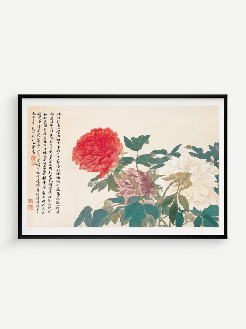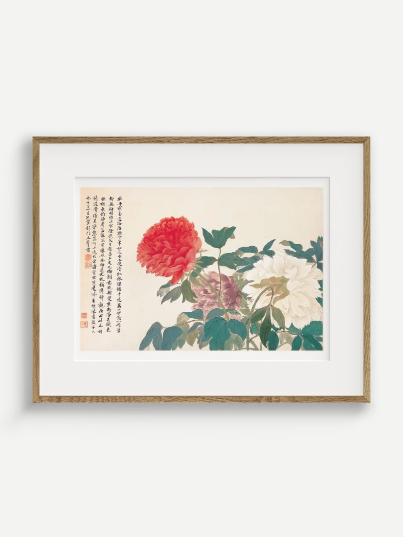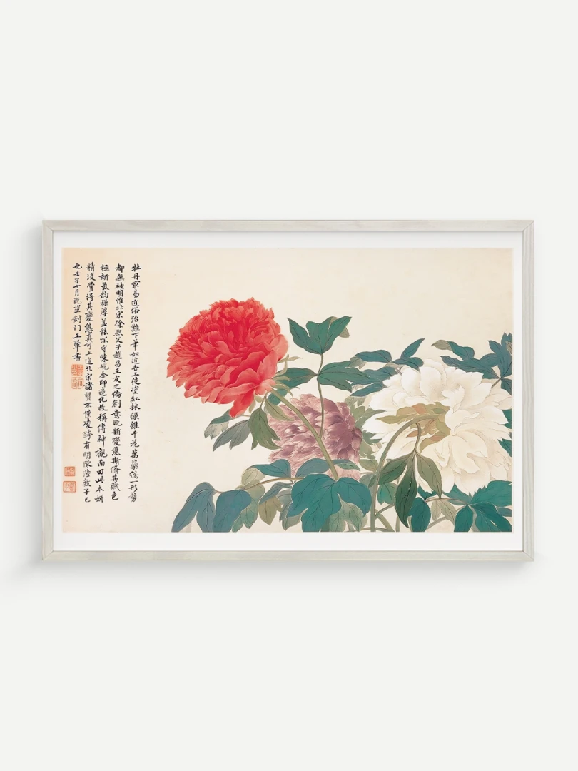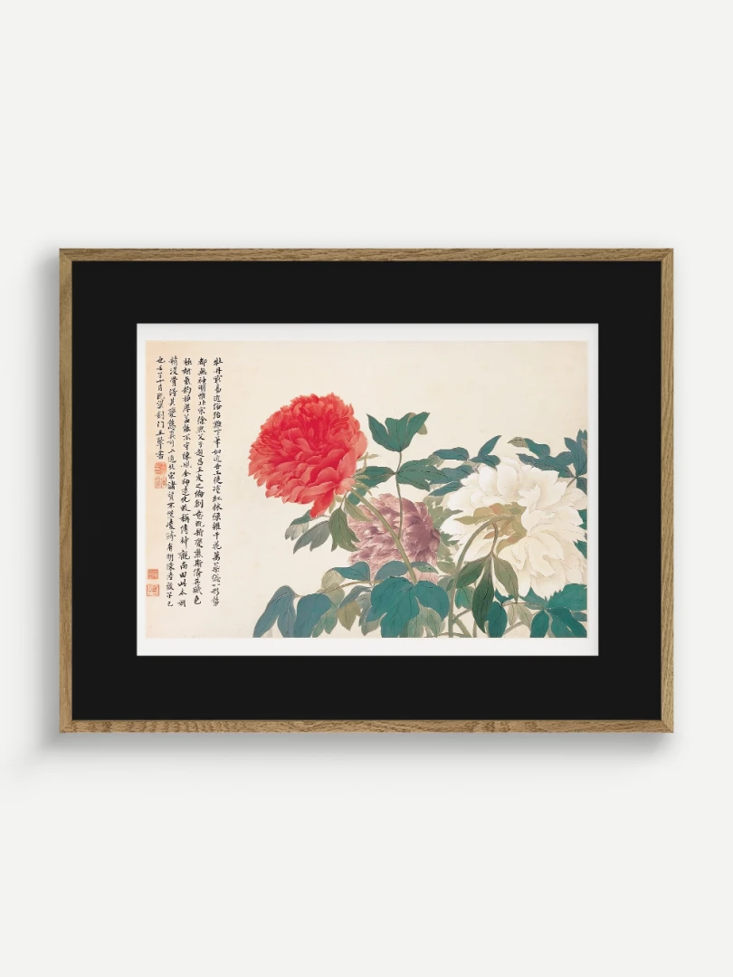 Tento nádherný umelecký print zachytáva pivonky v ich plnej kráse, tak ako ich v 17. storočí majstrovsky zobrazil čínsky umelec Yun Shouping. Bol jedným z najvýznamnejších predstaviteľov kvitnúcich štetcových malieb (huaniao) v období dynastie Čching a preslávil sa svojou schopnosťou zachytiť prírodnú krásu s jemnosťou a ľahkosťou.