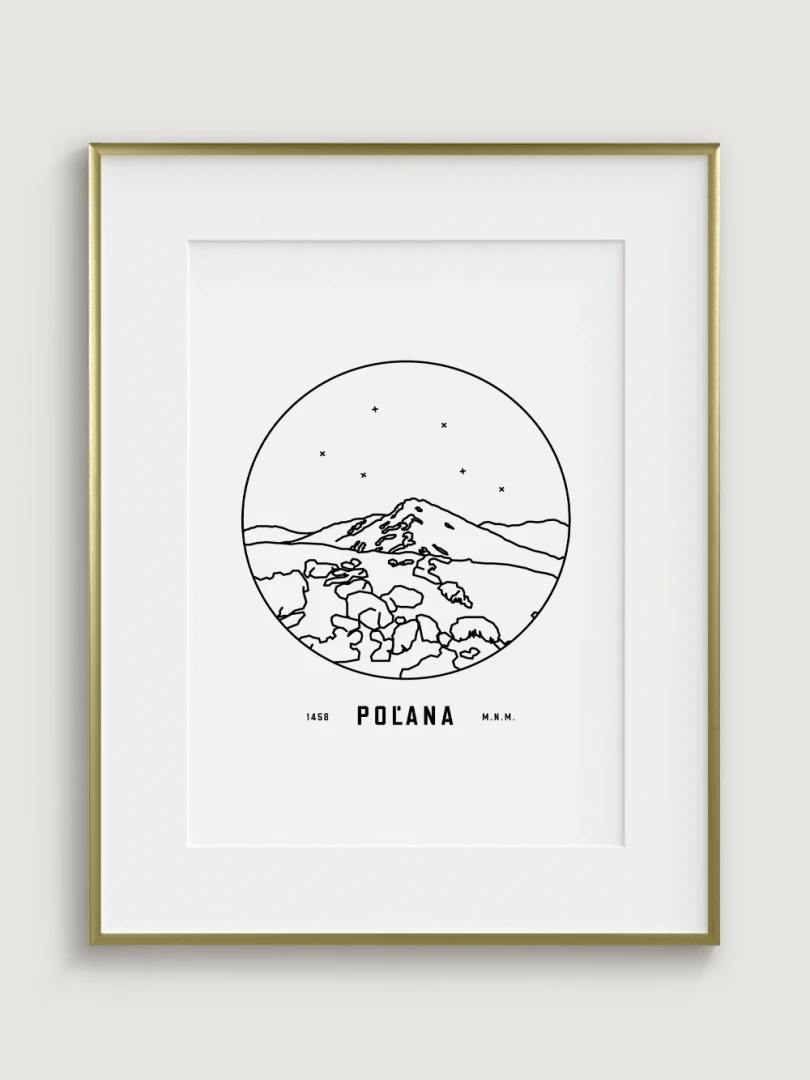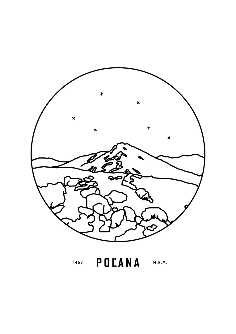 Poľa je znázornená v detailnej kruhovej vinete s uvedením jeho názvu a nadmorskej výšky, čo vytvára jedinečný a estetický doplnok pre milovníkov prírody a hôr. Tento print je ideálnym darčekom pre tých, ktorí si chcú domov priniesť kúsok slovenskej krajiny a majestátnosť jej vrcholov.