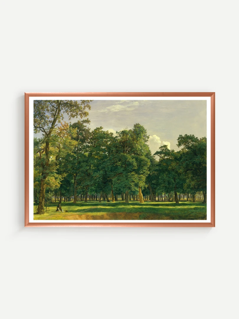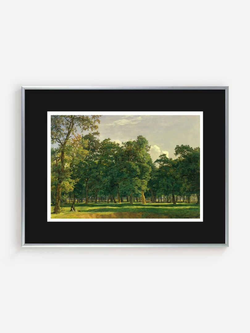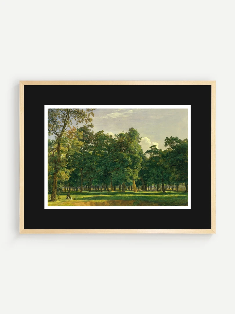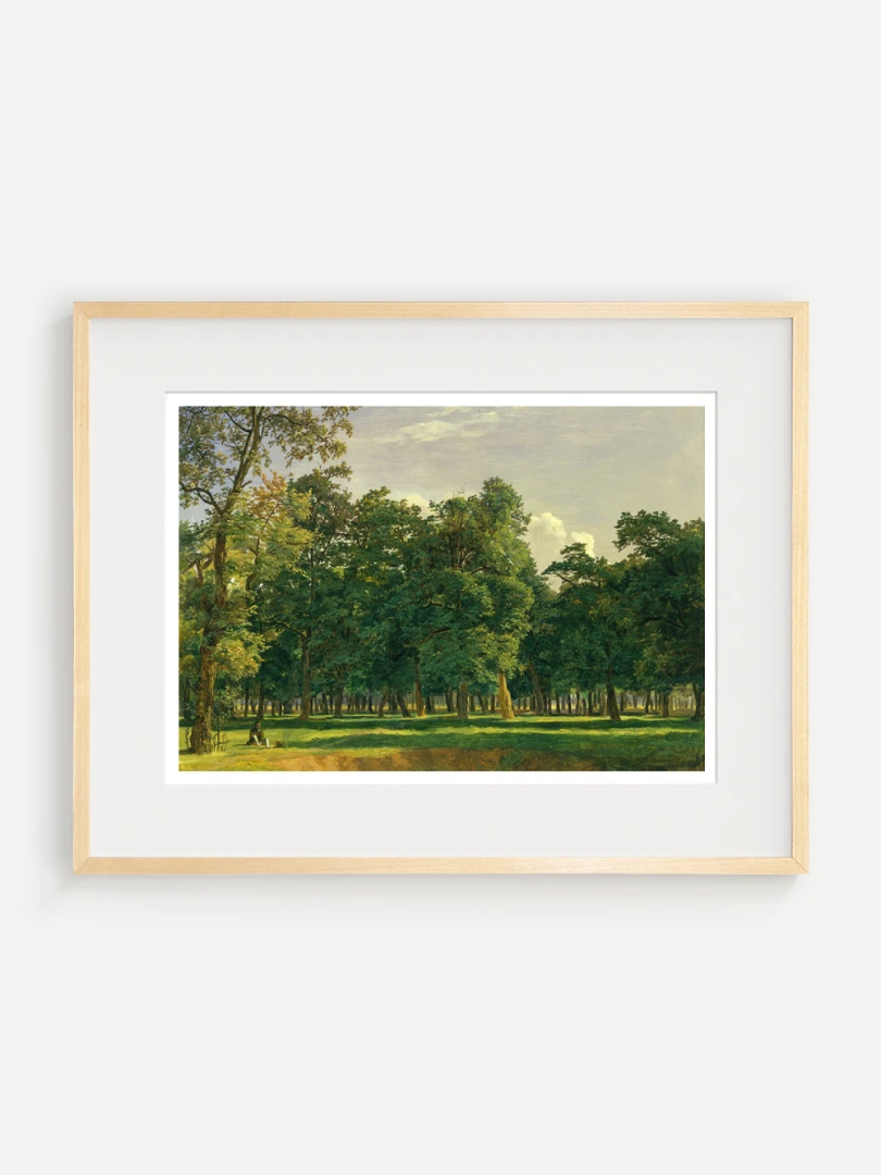 Tento print vychádza z obrazu Krajina v Pratri (Prater Landscape), ktorý vznikol okolo roku 1831 a zachytáva slnečný výjav z veľkého verejného parku vo Viedni. Park je zaliaty žiarivým svetlom, ktoré preniká medzi korunami stromov a zvýrazňuje množstvo jemných detailov na listoch, kôre a trávnatej pôde.