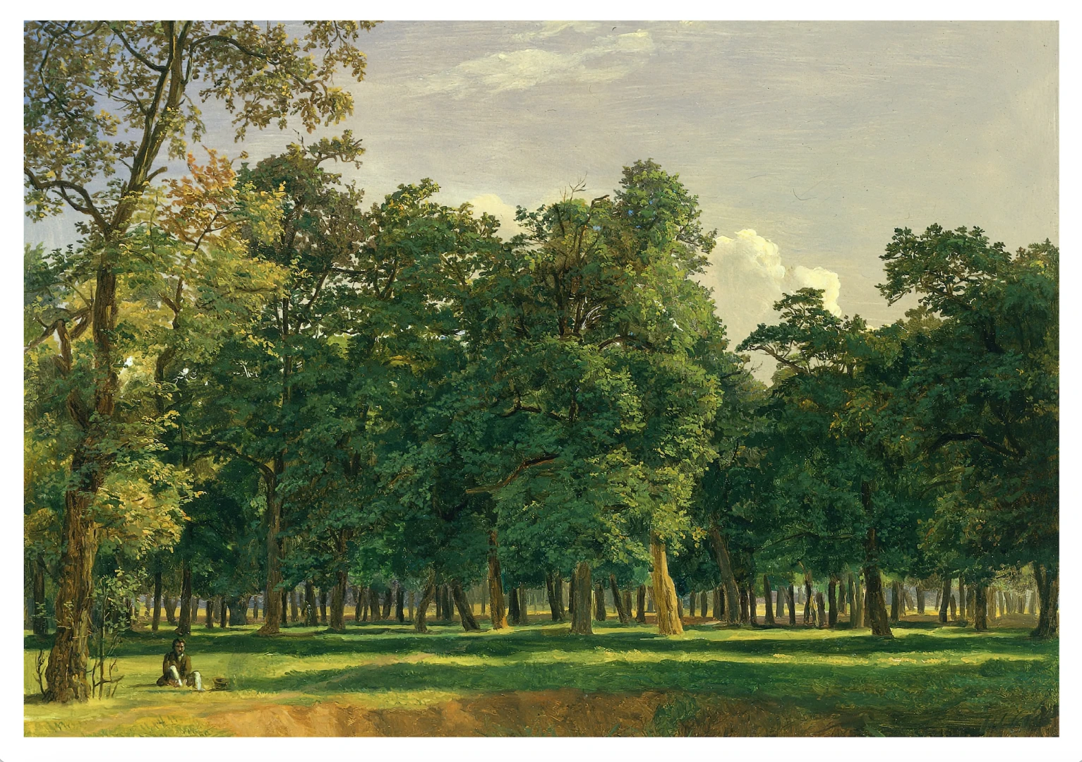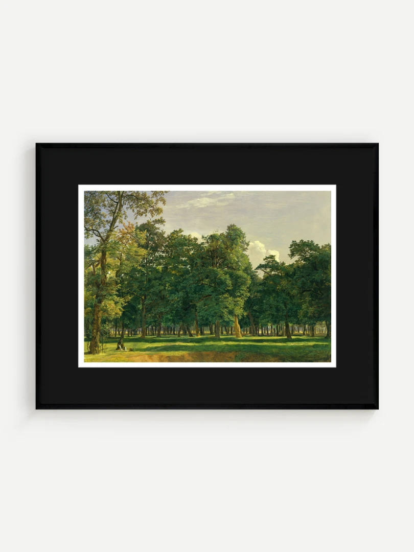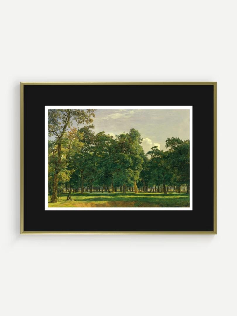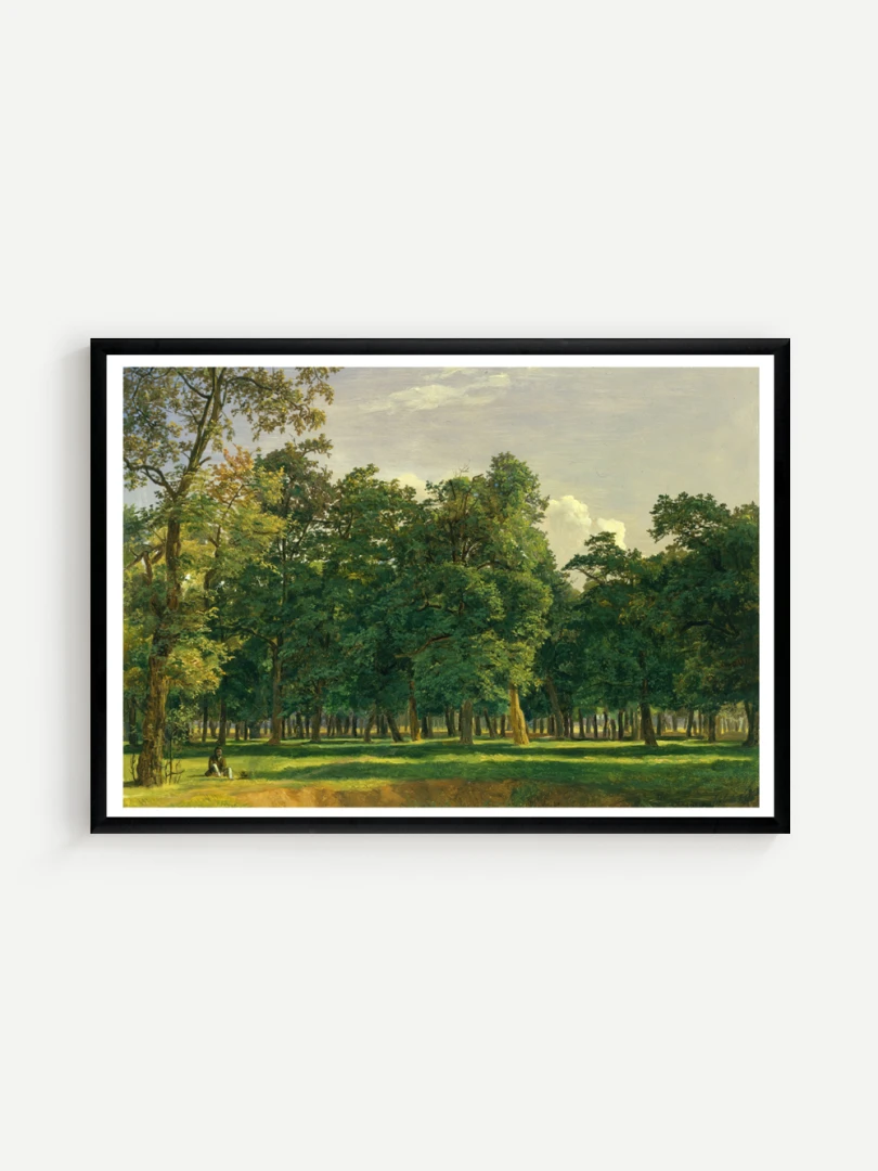 Tento print vychádza z obrazu Krajina v Pratri (Prater Landscape), ktorý vznikol okolo roku 1831 a zachytáva slnečný výjav z veľkého verejného parku vo Viedni. Park je zaliaty žiarivým svetlom, ktoré preniká medzi korunami stromov a zvýrazňuje množstvo jemných detailov na listoch, kôre a trávnatej pôde.