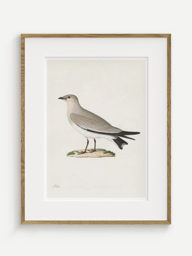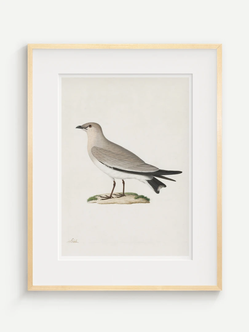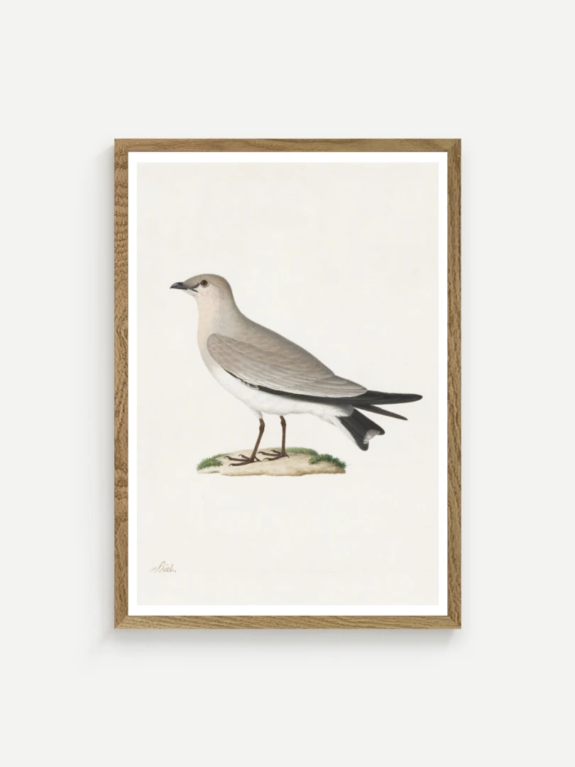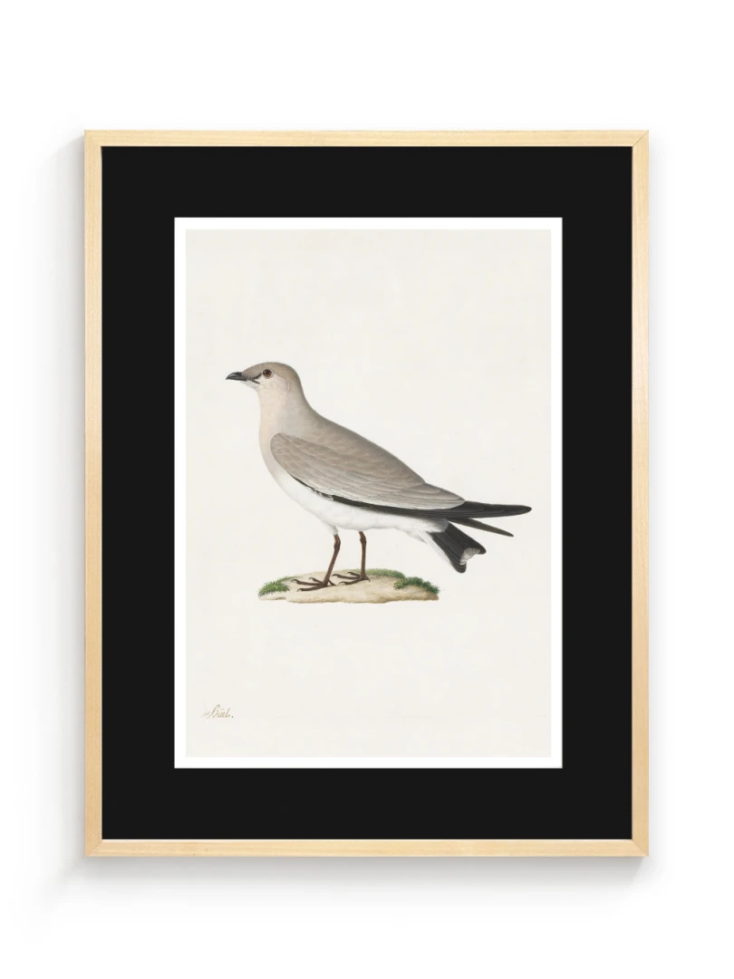 Tento print zobrazuje Malého prieložníka (Small Pratincole, Glareola lactea), drobného vtáka typického pre piesočnaté brehy južnej Ázie. Dielo pochádza z 19. storočia a je pripisované francúzskemu maliarovi Paulovi Hüetovi. Vták je zobrazený s precíznou anatomickou presnosťou, stojaci na jednoduchej zemi s trsom trávy – scéna je čistá, bez rušivého pozadia, vďaka čomu vyniká samotná forma vtáčika.